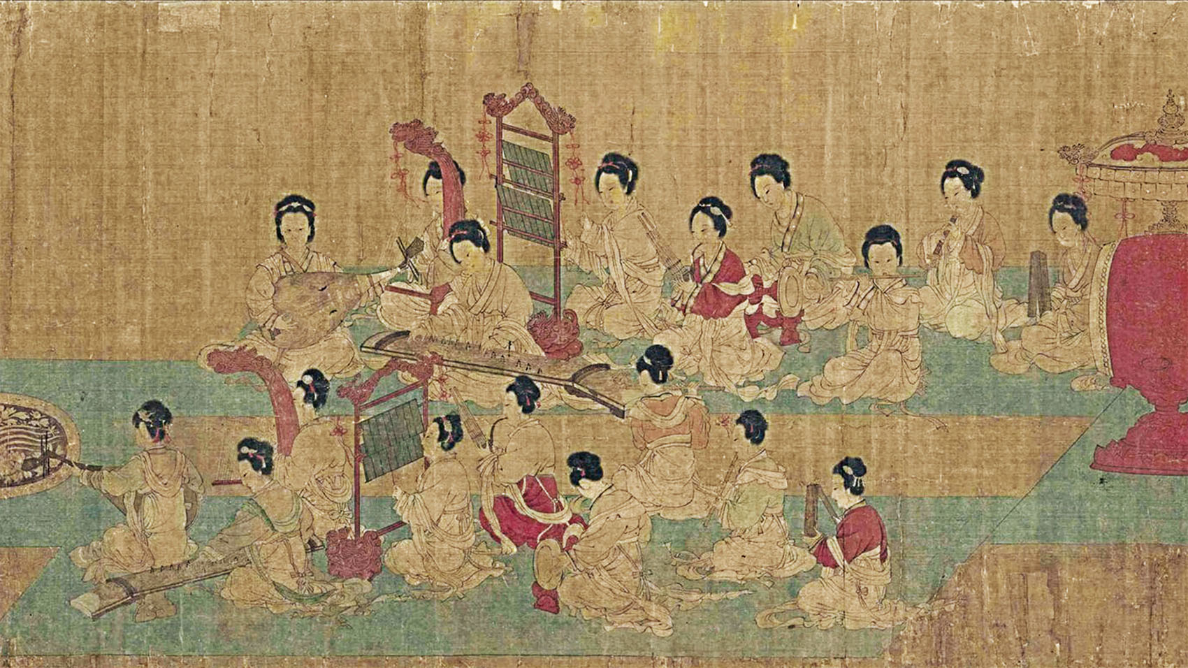Обучение игре на музыкальных инструментах было частью образования придворных. Что интересно, для исполнения ритуальной и церемониальной музыки во дворцах допускались исключительно традиционные китайские инструменты; на тех, что были заимствованы из других стран, можно было играть лишь на развлекательных мероприятиях. Традиционный китайский оркестр обычно включал в себя различные цитры, шэны, а также бамбуковые флейты сяо и ди (продольная и поперечная соответственно) и набор колоколов бяньчжун. Эти колокола, разной формы и размера, подвешивались на специальную раму и образовывали целую систему; языков, в отличие от наших колоколов, у них не было, и на них играли, ударяя колотушками. К ним могли присоединиться барабаны гу — дагу, тангу и другие. Не каждый барабан мог удостоиться попадания в придворный оркестр: например, небольшой яогу был крестьянским барабаном, его подвешивали на пояс и играли на сельскохозяйственных праздниках. Сейчас барабаны часто звучат во время различных народных торжеств и в военных оркестрах, где также популярны бо — похожие на кимвалы тарелки.