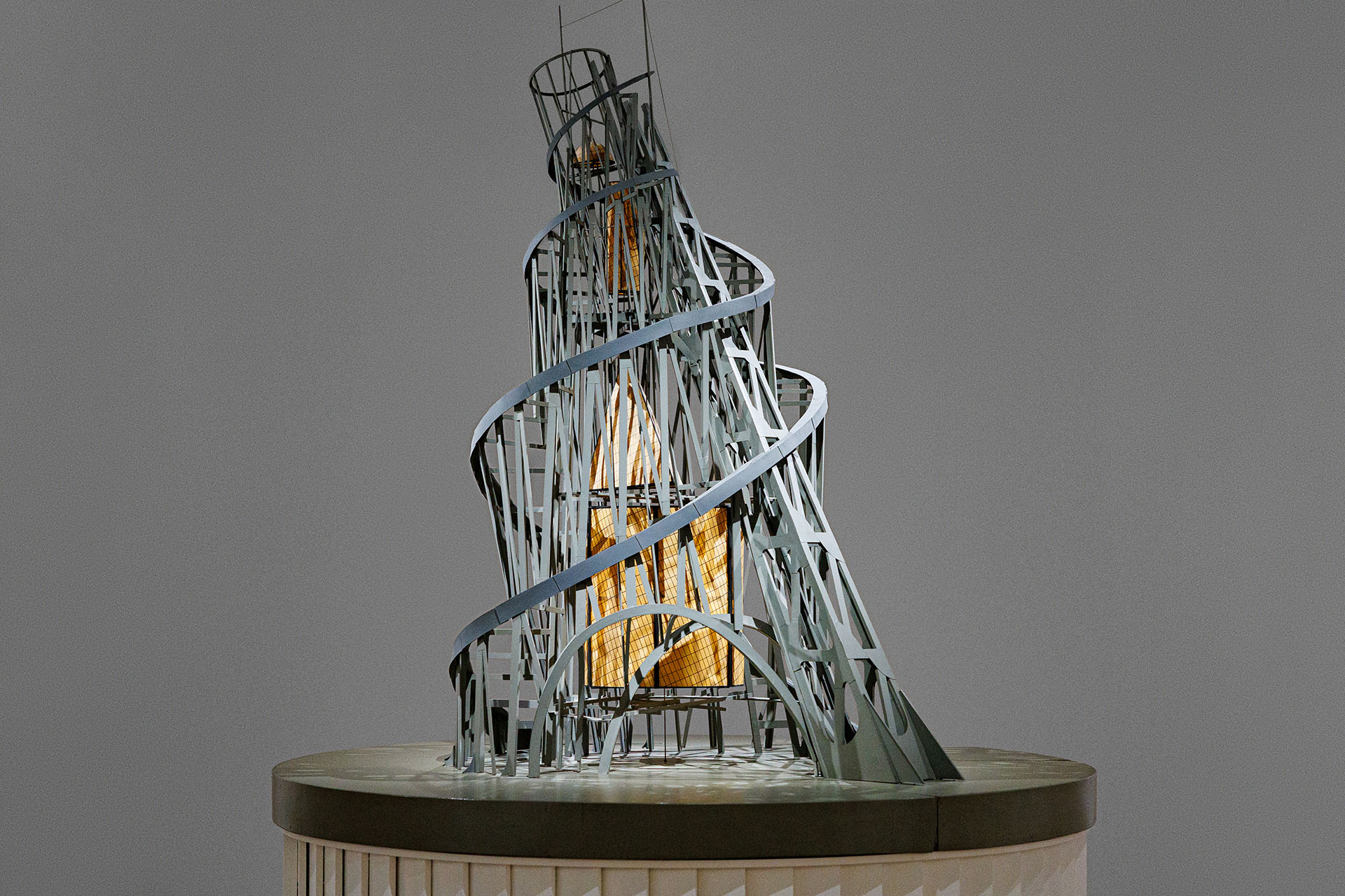 «Временные монументы» — серия проектных моделей, посвященных героям русского авангарда. Это своего рода оксюмороны — монументы, собранные из временных строительных конструкций. В работе, о которой вы спрашиваете, все началось со скелетов «Рабочего и колхозницы». Они довольно комичны, и я давно думал как-то их использовать. Почти случайно сделал набросок будущей модели, окруженной строительными лесами, и рисунок лесов оказался похож на татлинскую башню. Получилась скульптура внутри конструкции (и наоборот), конструктивизм внутри соцреализма (и наоборот). Эту модель я посвятил Вере Мухиной.