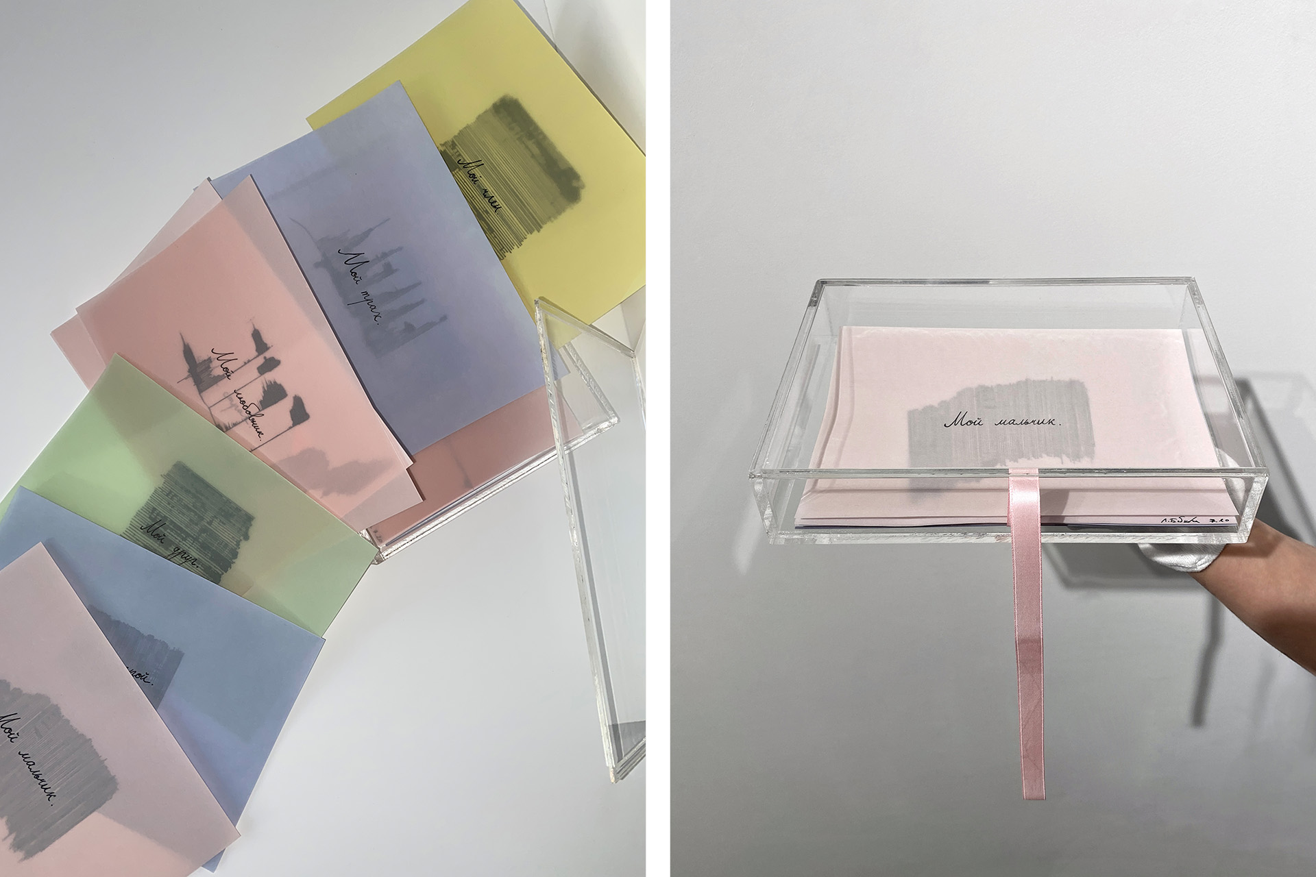 Давно испытываю невозможную слабость к работе с материалом и формой, именно поэтому ранние металлические листы с текстами Лизы, выпускницы Академии художеств, на чьей дипломной выставке я была, попали в мою коллекцию. Дальше случился мой подарок мужу, один из самых красивых экспериментов — коробочка «Мой мальчик», в которой от руки прописаны послания любимому человеку на 12 листах, а брать и рассматривать их надо непременно в белых перчатках, что как раз можно сделать на выставке коллекции.