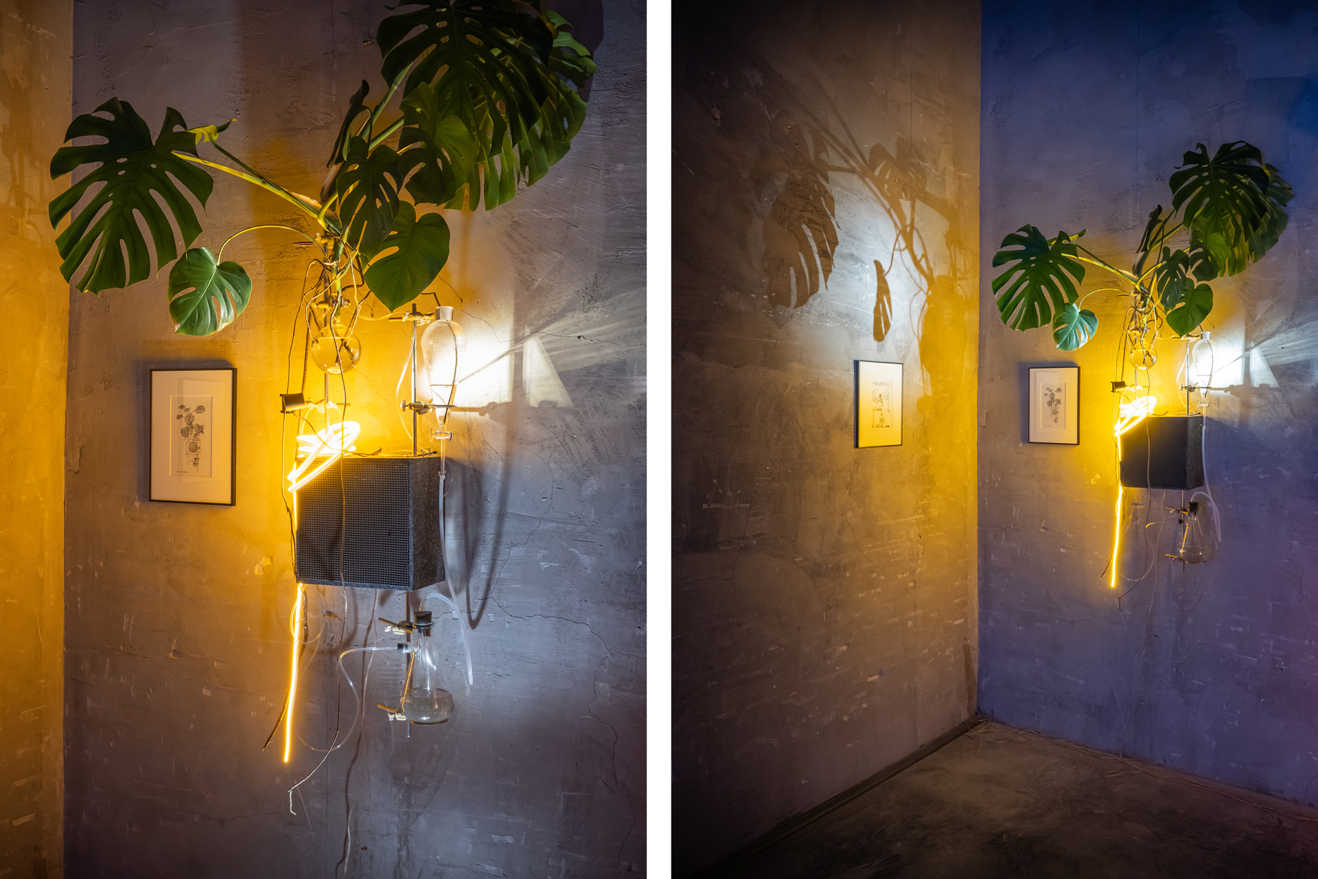 Одна из самых необычных работ в собрании. Иван работает с направлениями science-art и ready-made: инсталлирует в старые радиоприборы химические колбы, помещая в них живые растения, которые бережно выращивает в ботаническом саду. Дальше художник программирует автономные звуки и свет, которые являются обязательным дополнением к работе, а раз в полгода приезжает лично и обрабатывает все растения. Эта работа не только про пределы восприятия, но и про возможность интегрировать «эксперимент» в повседневную жизнь — звуки и свет воспроизводятся в соответствии с окружением, как ответ на движения, освещение и температуру.