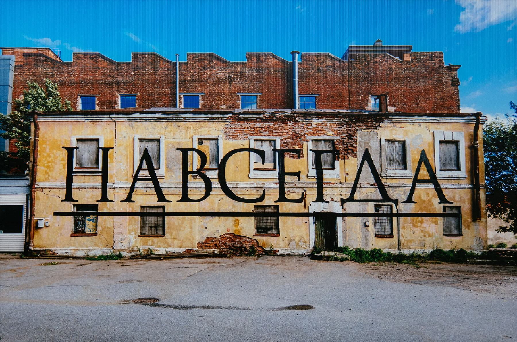 Эта работа выросла из простой идеи: написать на здании, предназначенном под снос, слово «Навсегда» — и зафиксировать момент его исчезновения. Но дом не снесли, его всего лишь перекрасили. Так «навсегда» внезапно оказалось не навсегда — и из этой осечки родился новый смысл.