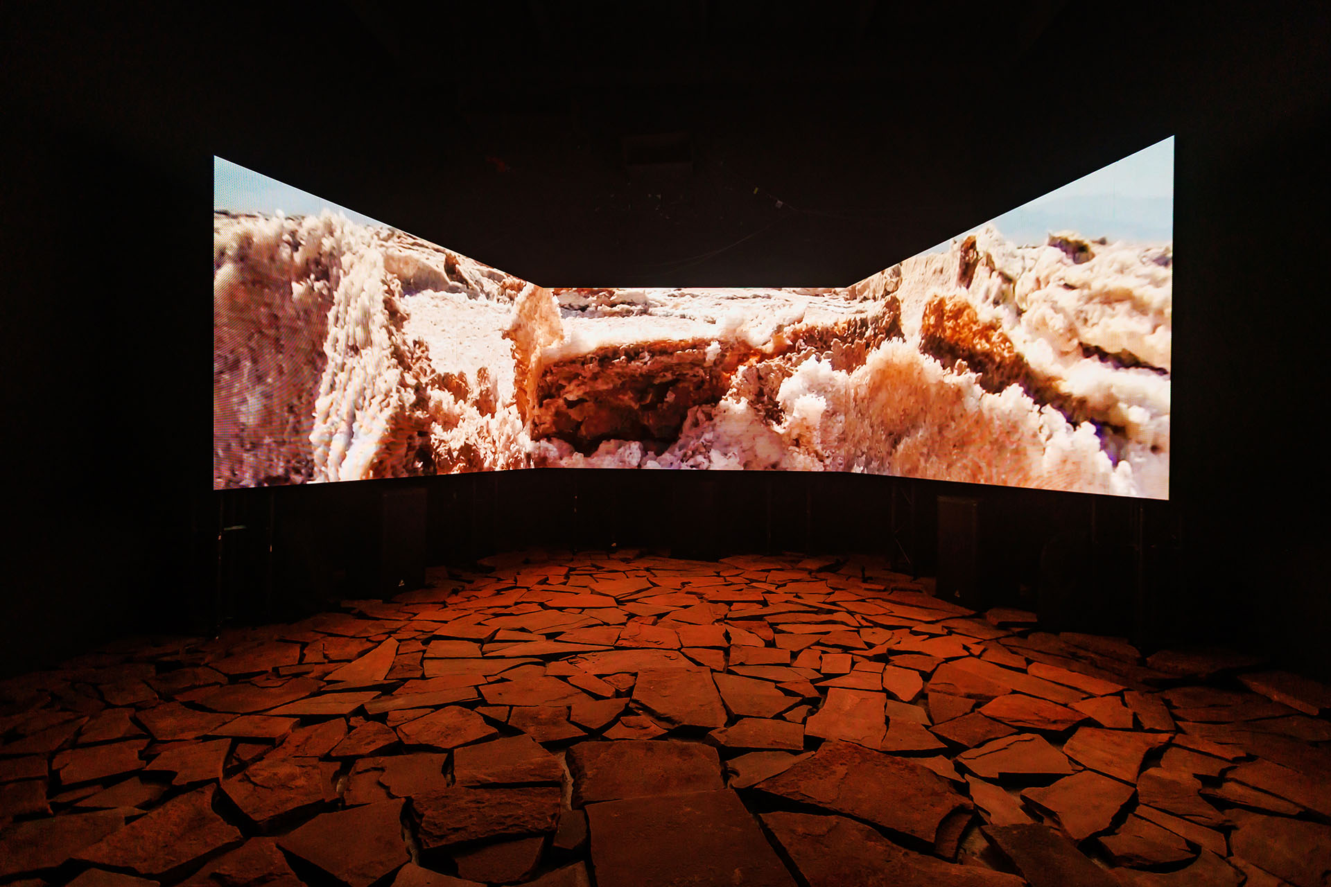 Было любопытно увидеть, как, например, ландшафты, снятые на fish-eye-линзу, плавно разложились по трапеции трёхканального видео. Это давало зрителю возможность почти оптически почувствовать масштаб пустынного пространства, сотканного из соли.