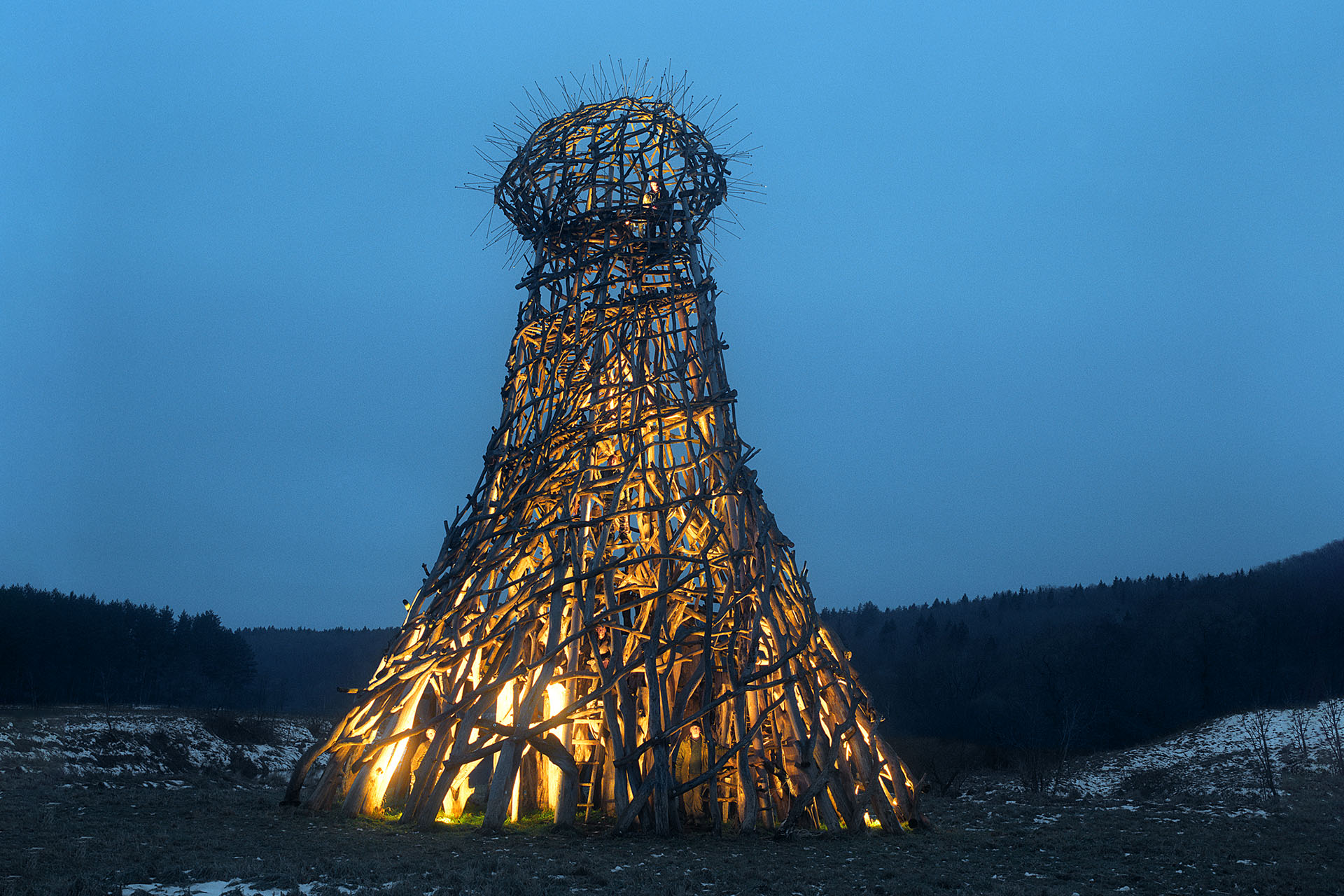 Строители поставили металлические трубы на бетонные стаканы, зарытые на три метра в глубину. Мы с ребятами все трубы зажали деревом, система получилась очень жесткая: примерно по пять креплений на палку, они цепляются за другие палки. Потом к металлу крепить перестали, и конструкция держалась уже сама на этом дереве, но трубы не давали ветровым нагрузкам ее толкать. Я следил только, чтобы плотность вещи была равномерная. Структурированный хаос, который люблю и очень часто использую: геометрическая в целом фигура, но сделана из абсолютно случайного набора кривых палок.