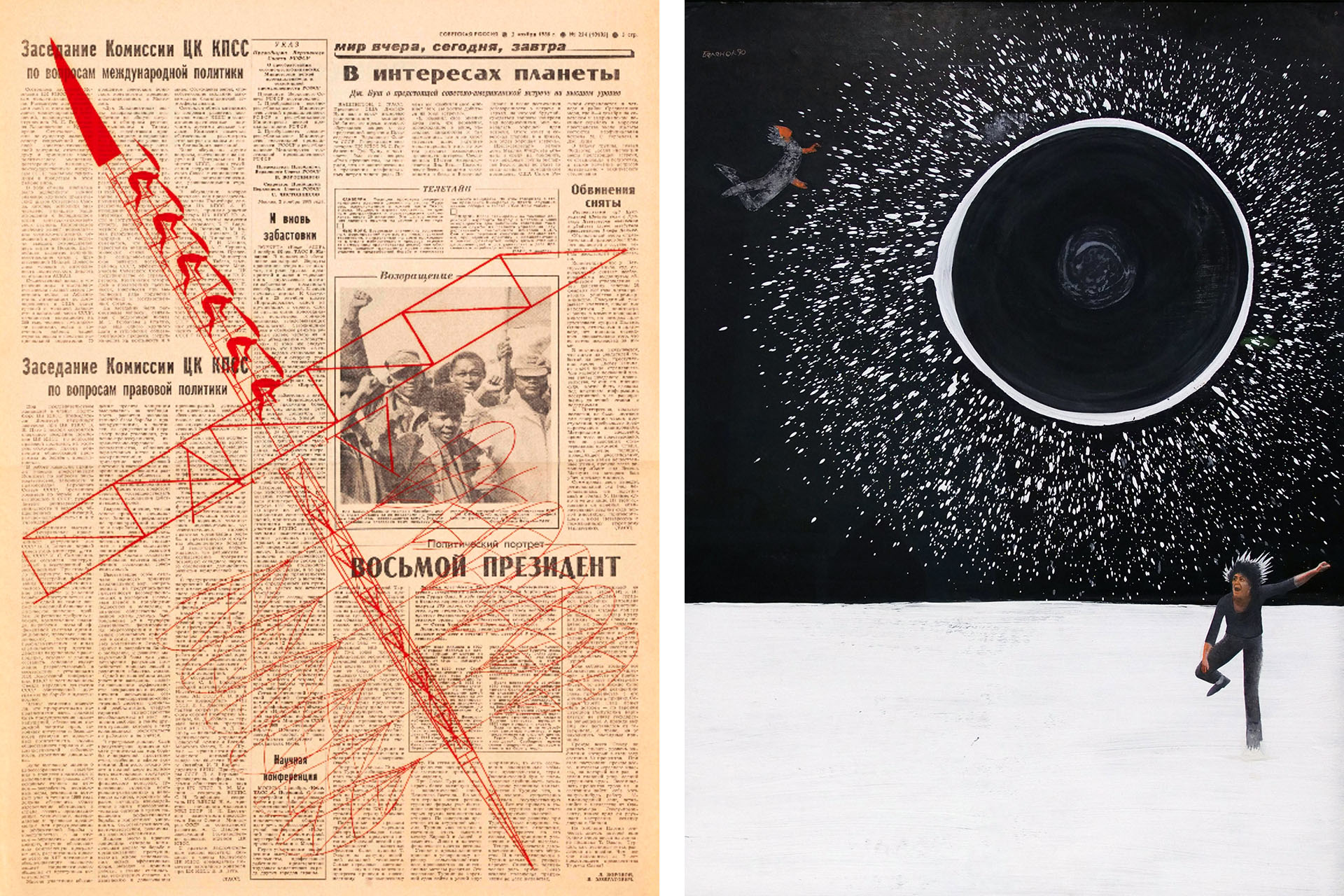 Слева: Юрий Аввакумов, «Летающий пролетарий. 1989 год. Посвящение В. В. Маяковскому» / Пётр Беленок, «Случайное затмение», 1990 год Фото: из личного архива Айка Аджогляна