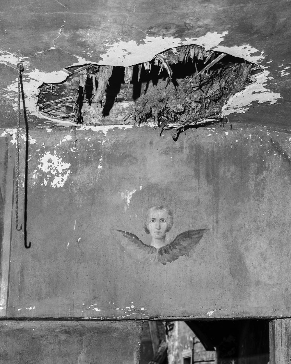 Слава Нестеров подчёркивает христианское начало времени в виде фигуры ангела, а Полина Рукавичкина показывает сам путь от грехопадения — в виде отверстия в потолке — к ангелу как символу рая.