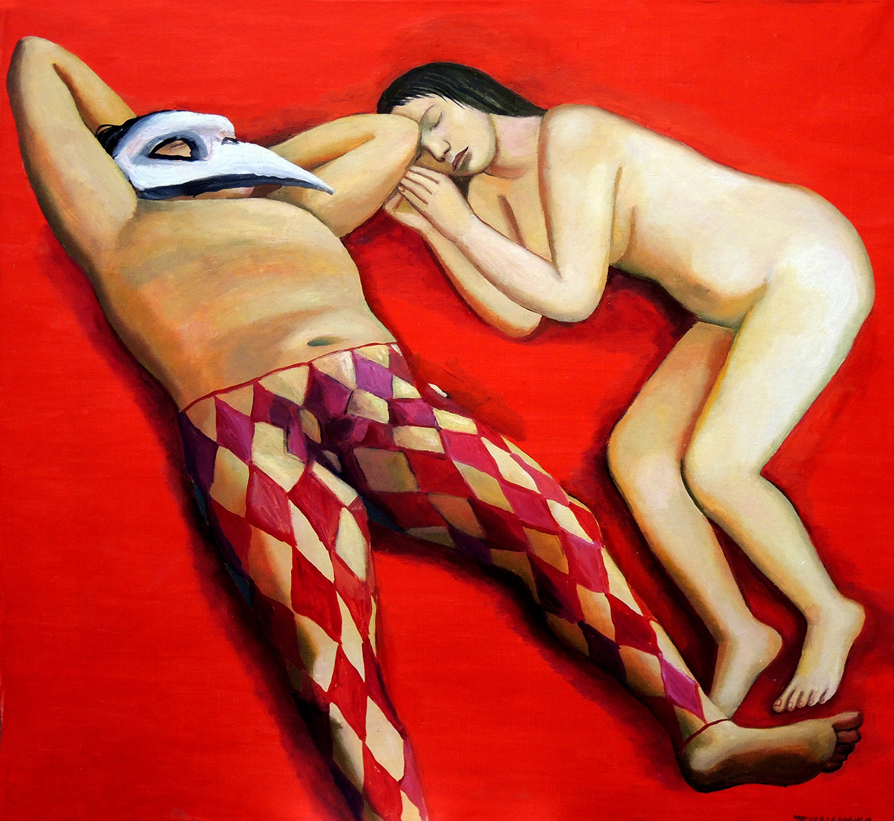 Работа «Ночь» известного московского художника Татьяны Назаренко (род. 1944) — живописная метафора разобщённости и отчуждения людей. Назаренко часто упоминает, что её произведения лишены скрытых смыслов: она пишет именно то, что непосредственно переживает сама. Главное, по её словам, — передать время через свои ощущения. В картине «Ночь» на ярко-красном фоне лежат спящие мужчина и женщина. Он, в карнавальной венецианской маске и панталонах Арлекина, расположился в вальяжной позе на спине, заложив руки за голову. Она, абсолютно обнажённая, свернулась калачиком. Они, вроде бы, рядом, но никак не взаимодействуют друг с другом. Каждый из героев существует сам по себе. Одиночество преследует людей и во сне: даже тогда человек не снимает с себя маску. Назаренко изображает своих персонажей на нейтральном фоне, без конкретизации места и времени действия. Яркость красок не создаёт ощущения радости, наоборот — вся картина словно пронизана тревогой и напряжённой атмосферой.
