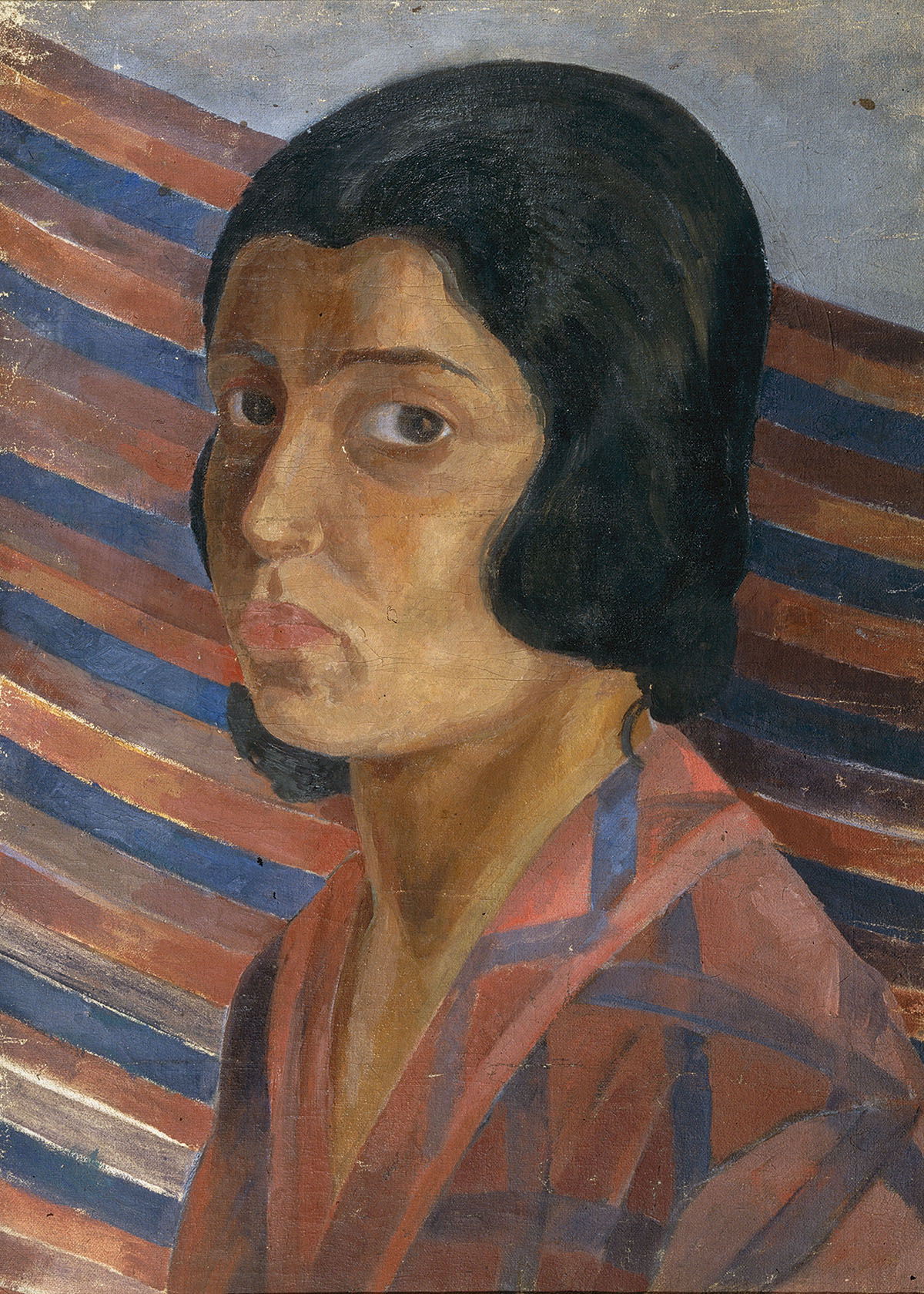 Автопортрет — один из самых прямых и одновременно самых сложных способов художественного самопознания. Камерный погрудный автопортрет Виктории Белаковской, написанный в 1928 году, привлекает изысканной сдержанностью решения: декоративность колорита здесь сочетается с тонким психологизмом. Работа создана сразу после окончания Академии художеств — художнице было 27 лет. Образ отличается внутренней монументальностью. Ученица Кузьмы Петрова-Водкина, Белаковская развивает в своём творчестве линию, заложенную учителем. Крупный план и фон в виде красно-синей полосатой драпировки, перекликающейся с рисунком и цветом одежды, намеренно сводят композицию к лицу. Главный акцент — на больших карих глазах. Взгляд сосредоточен и насторожен, направлен прямо на зрителя, но за внешней собранностью проступают внутренняя мягкость и хрупкое очарование молодости.