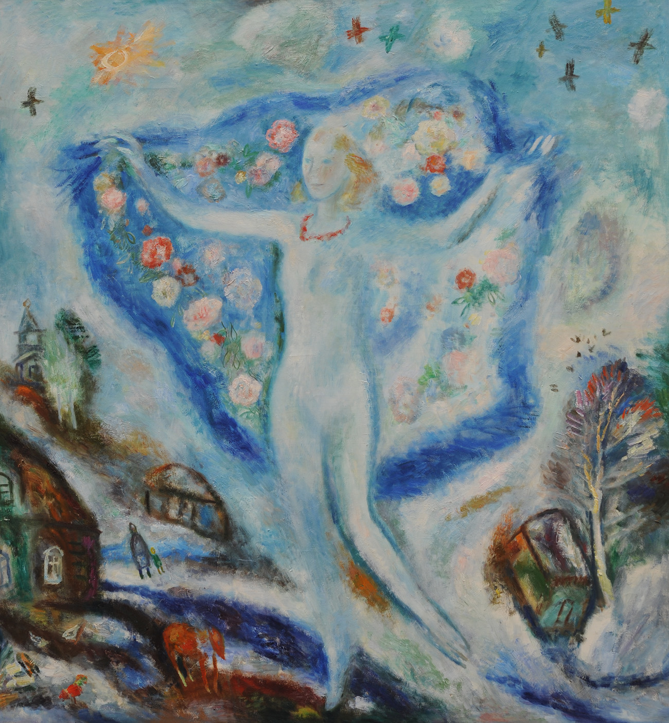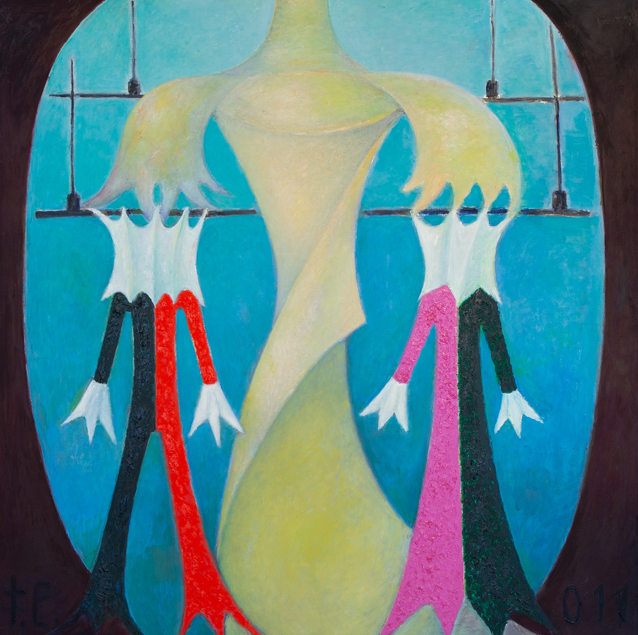Обобщенный портрет человека, несущегося в неизвестность, представлен в работе художника-нонконформиста Олега Целкова (1934–2021). Образ исполнен с характерной для Целкова монументальностью: гигантская женская фигура выплывает из туманного, насыщенного сине-голубого пространства и движется прямо на зрителя. Художник как будто стремится показать внутреннюю сущность человеческой личности, утратившей духовный стержень. Тело обтекают неприятные формы, лицо с низким лбом, массивным подбородком и маленькими глазками — один из самых узнаваемых мотивов созданной им «маски лица». Начиная с 60-х годов и до самой смерти Олег Целков разрабатывал один-единственный сюжет — образы зловещих человекоподобных мутантов. Он оперировал крупными масштабами, примитивными формами и яркими анилиновыми красками. Громадные фантастические монстры с кричащими мордами-масками вместо лиц у Целкова — это образ человека со всеми его пороками: жестокостью, цинизмом, алчностью, бездуховностью.
