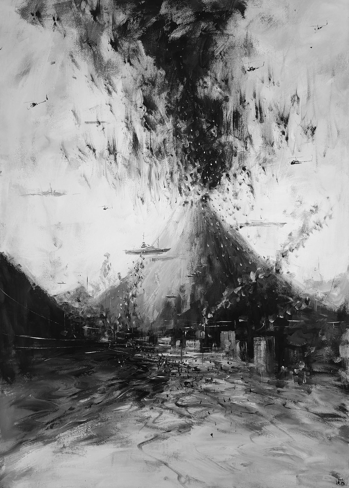 Монохромная работа московского художника Константина Батынкова фиксирует момент извержения вулкана — тот самый миг, когда столб пепла поднимается над землёй и гасит свет. Это не попытка воспроизвести природное явление в его физической достоверности, а скорее образ-состояние, внутреннее переживание. Сам художник говорит, что в пейзаже пишет «разные состояния своей души». Широкий, размашистый жест кисти придаёт изображению напряжённую экспрессию: пространство словно сдвигается, взрывается, приходит в движение. Композиция строится на столкновении стихий и человеческого присутствия — почти незаметного. На фоне огнедышащей земли воображаемый наблюдатель кажется крошечным, уязвимым и лишённым защиты.