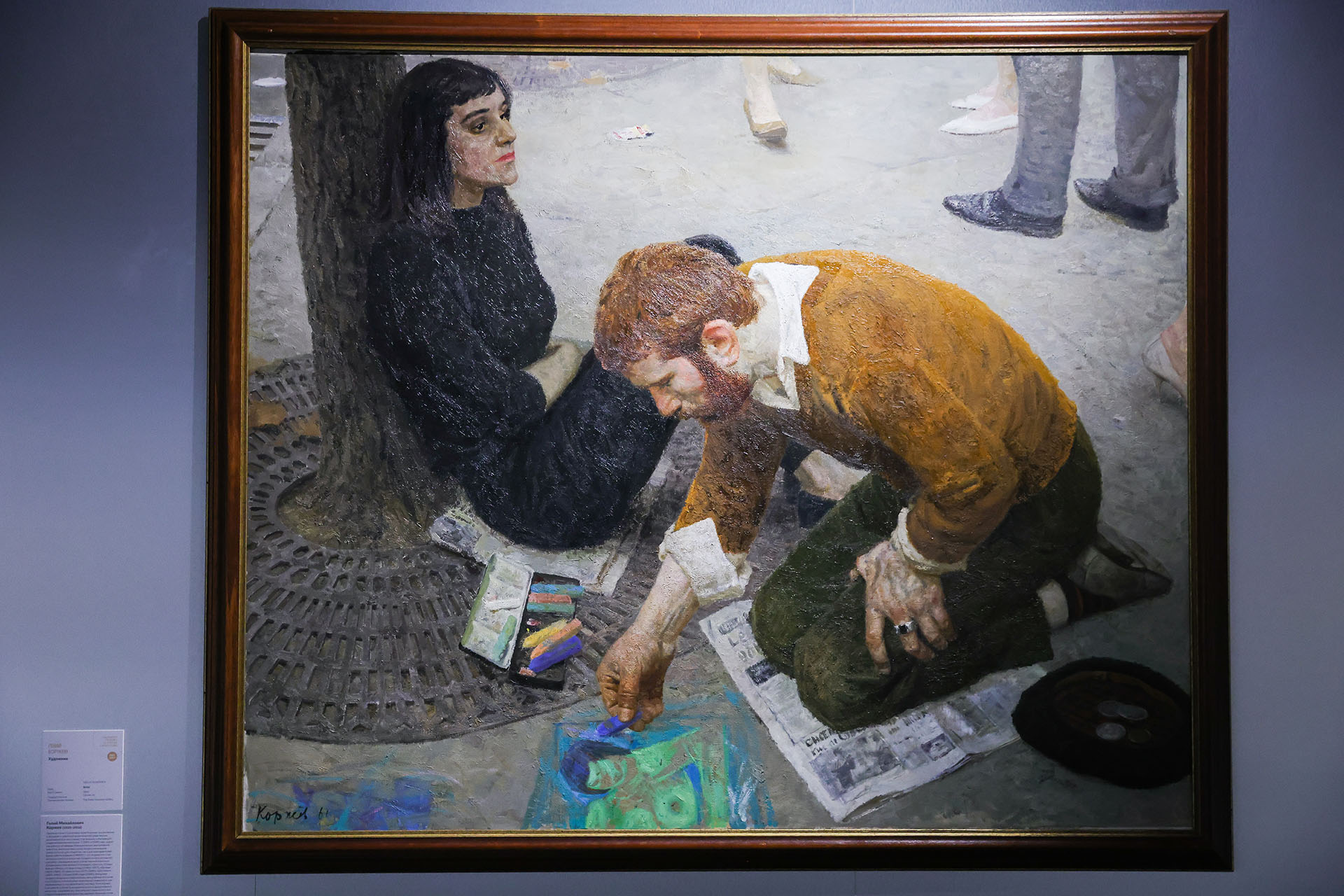 Картина Гелия Коржева «Художник» (1961 г.) — ключевое произведение, в котором автор осмысляет судьбу творца. На полотне изображены уличный живописец в европейской среде и его преданная спутница (в ее облике узнаваемы черты жены художника, Киры Коржевой). Коржев концентрируется на руке художника — через создание рисунка он передает течение творческой энергии и сам процесс воплощения замысла. Работа выходит за рамки бытового сюжета — это размышление о призвании художника как подвижника, о союзе творца и музы, об испытаниях и верности своему делу.