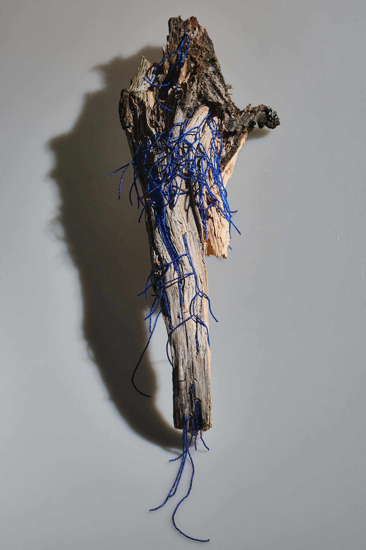 Объект из серии «Мощи хтонического божества» представляет собой сложную скульптурную структуру, в которой природные и рукотворные элементы переплетаются до неразличимости. Дерево и бисер образуют форму, напоминающую одновременно артефакт, реликвию и фрагмент живого организма.