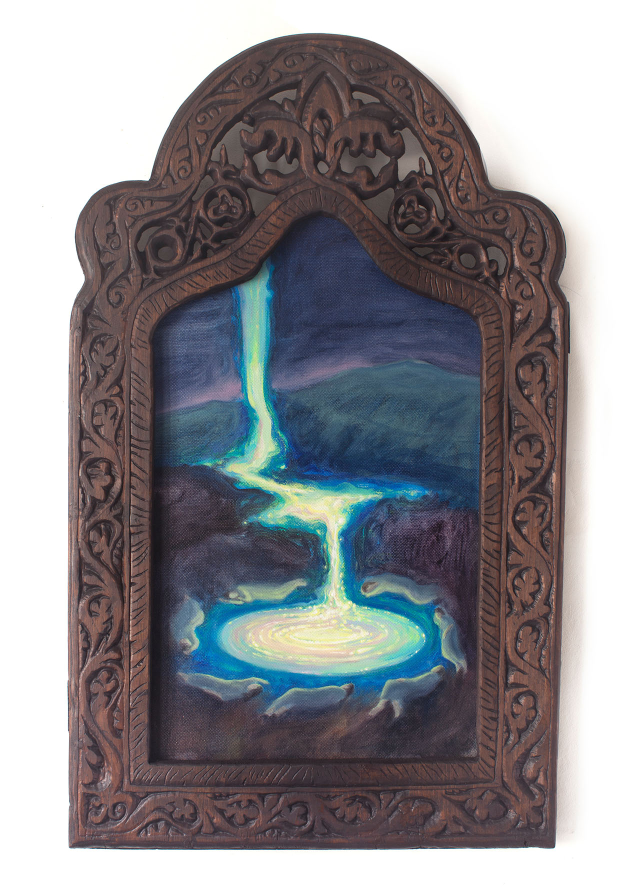 Основным медиумом Натальи является живопись, сюжеты которой отсылают к ритуалам, обрядам и традициям. Эти картины автор совмещает с найденными объектами — старинными рамами, киотами и деревянными досками, которые реставрирует и дополняет ручной резьбой. Работы будто становятся порталами в сказочный и мистический мир.