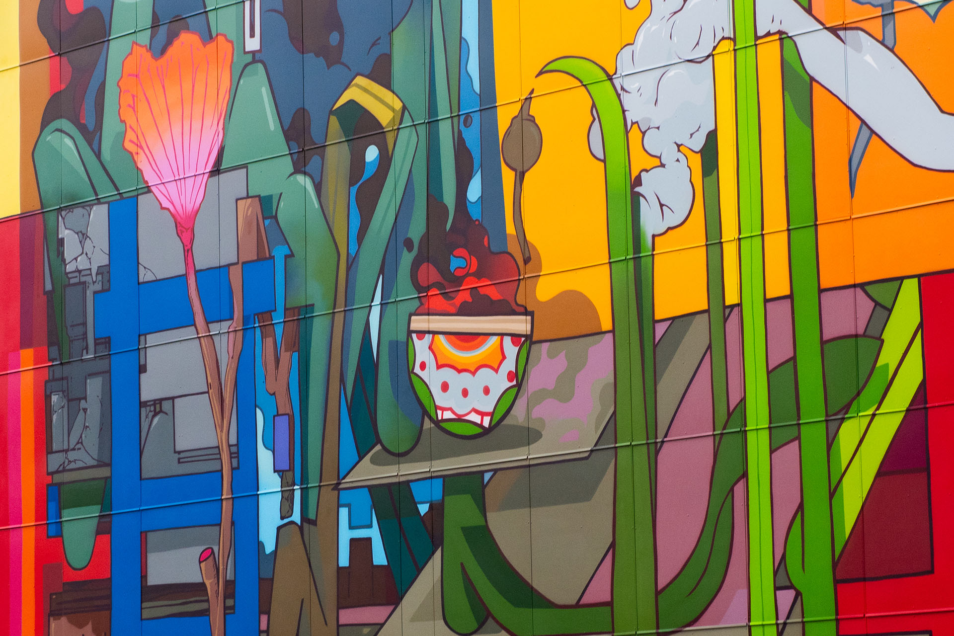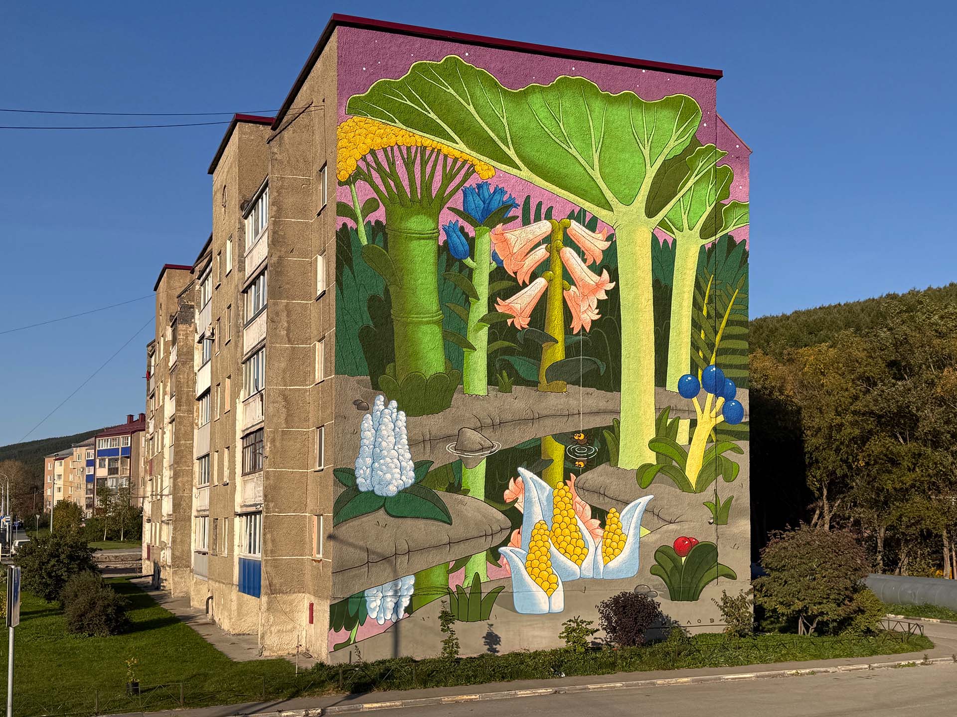 Сахалинская флора стала ключевым героем красочной работы севастопольского художника. Тут есть и ягода шикша, или водяника — эндемик Дальнего Востока, и садовая наперстянка. Растения здесь намеренно увеличены в масштабе и лишены ботанической точности: знакомые формы превращаются в самостоятельных персонажей, существующих в собственном ритме и не зависящих от времени. В своих работах Алексей Kislow часто создаёт парадоксальных персонажей, наделённых символизмом, и вписывает их в городскую среду. Так получилось с Антоном Чеховым, знаменитым гостем острова и автором документальных очерков о нём, его образ художник воплотил в ещё одном мурале в рамках проекта.