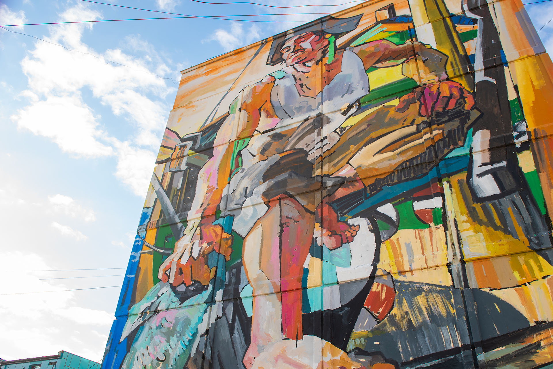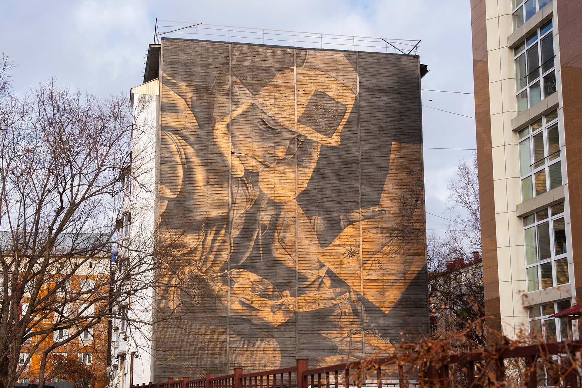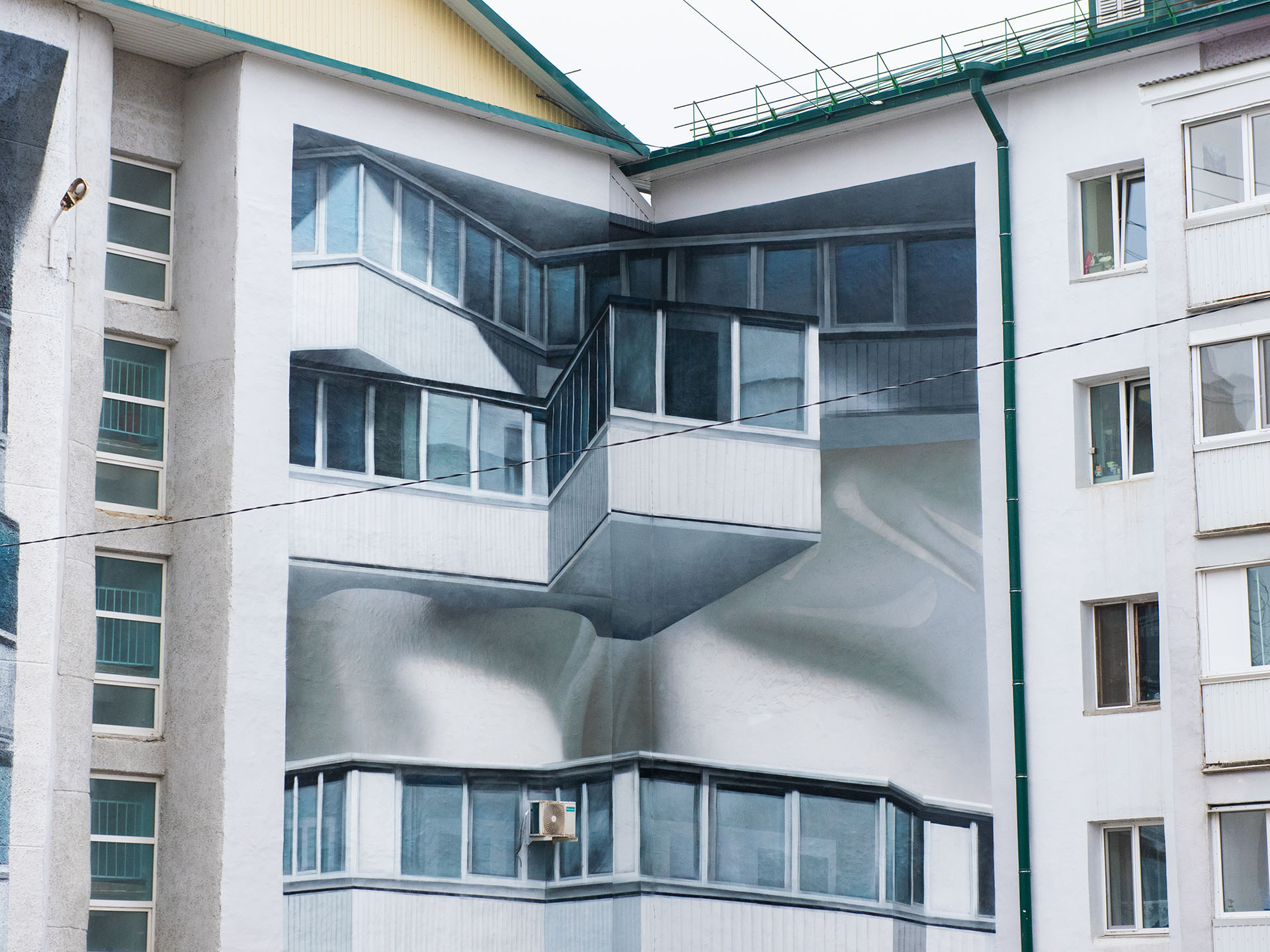 За два сезона художник Shozzy создал для центра Сахалина сразу четыре работы. Один из последних муралов объединил фасад двух домов на улице Комсомольской. Работая в технике trompe-l'œil (от фр. «обман зрения»), художник добивается эффекта визуальной иллюзии: балконы сразу трёх фасадов будто изгибаются и приходят в движение. Так архитектура утрачивает статичность и превращается в живую, пластичную форму.