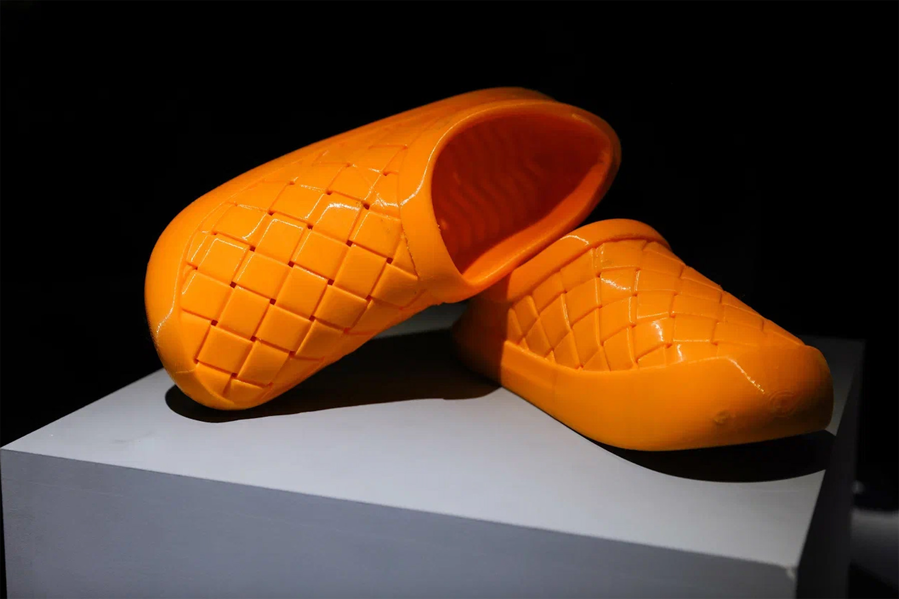 Это новейшая разработка — пока только прототип, но у него есть все шансы стать популярной моделью обуви из лёгкого и прочного этиленвинилацетата. Каждая деталь — отсылка к разным эпохам и ремёслам. Верх — с плетением. Рельеф стельки — стиральная доска. Подошва — узор «ромбиками» по мотивам самого распространённого железобетонного забора серии ПО-2.