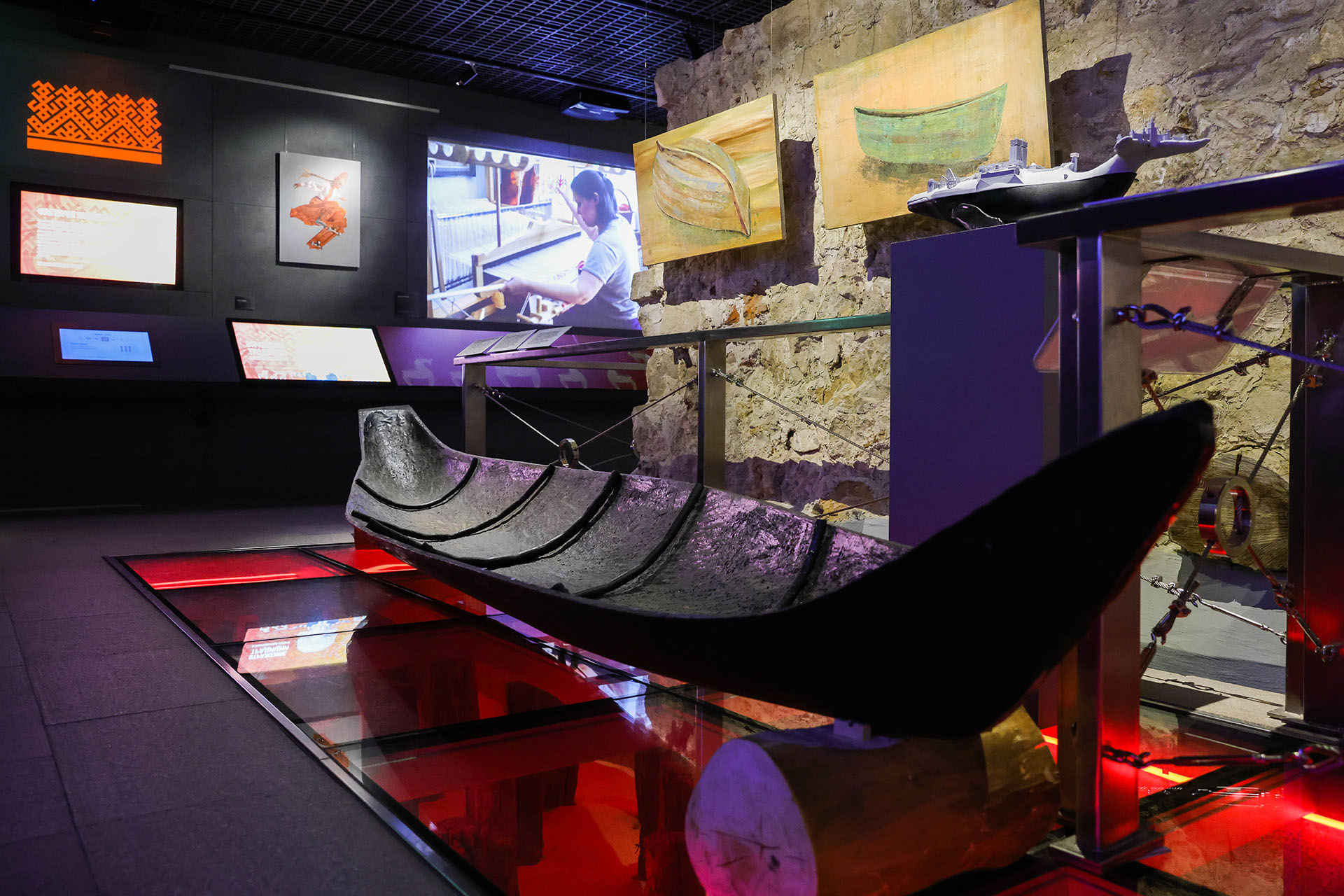 Настоящая лодка из Белозерска Вологодской области, выполненная в старинной технике, едва сохранившейся до наших дней. Лодка выдолблена вручную из цельного бревна. В народе такой тип лодки называют «душегубки», поскольку их дно полукруглое, и нужно иметь большое мастерство баланса, чтобы в ней не перевернуться. Этот экземпляр — из коллекции художника Дмитрия Рытяева.