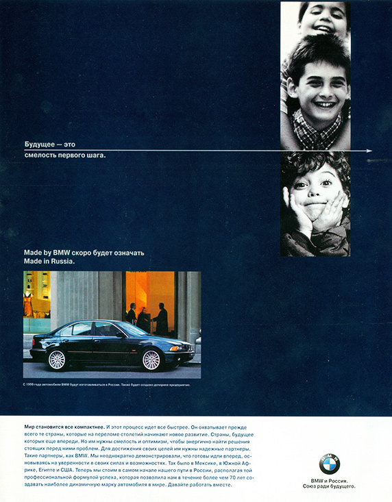 BMW Group отмечает 100-летие. «Сноб» решил проследить историю марки в рекламных кампаниях разных лет — перед вами подборка старинной (и не очень) рекламы. Искусство художников, изобретательность копирайтеров, торжество подтекста и блеск полиграфии — есть что вспомнить. Не только люди блуждают в лабиринтах родословных. Происхождение автомобильной компании может оказаться не менее запутанным — столько ветвей пересекается подчас! Партнеры приходят и уходят, то и дело что-то переименовывается. А если, не дай бог, война! (То есть непременно.) И тогда предприятие разберут на трофеи, и отпочкуется новая ветвь.Седьмого марта 1916 года в Мюнхене возник Bayerische Flugzeuge-werke, «Баварский авиазавод». Его основали Густав Отто и Карл Рапп. И у того, и у другого были собственные предприятия. Густав Отто, сын изобретателя четырехтактного двигателя внутреннего сгорания, с 1911 года строил самолеты, а Карл Рапп с 1913-го — авиамоторы и мотоциклы. Интересы обоих совпадали: кайзеру требовалось много самолетов. В апреле 1917 года на волне патриотизма Рапп решил переименовать свой Rapp-Motorenwerke в Bayerische Motoren Werke GmbH. Спустя год компанию акционировали, и она стала называться BMW AG. А тут Германия проиграла войну, самолеты ей выпускать запретили, и над рабочими окраинами Мюнхена сгустились тучи. Каждый из заводов выживал как мог. По счастью, в 1922 году нашелся инвестор, некто Камильо Кастильони из Триеста, объединивший разрозненное хозяйство. Торговой маркой для своего нового актива Кастильони выбрал BMW. В 1923 году появился первый мотоцикл BMW, в 1928-м — первый автомобиль. Не забыл Кастильони и про авиамоторы. Лучшие мотоциклы, лучшие автомобили, лучшие турбореактивные моторы… Именно такой мы и представляем марку BMW.