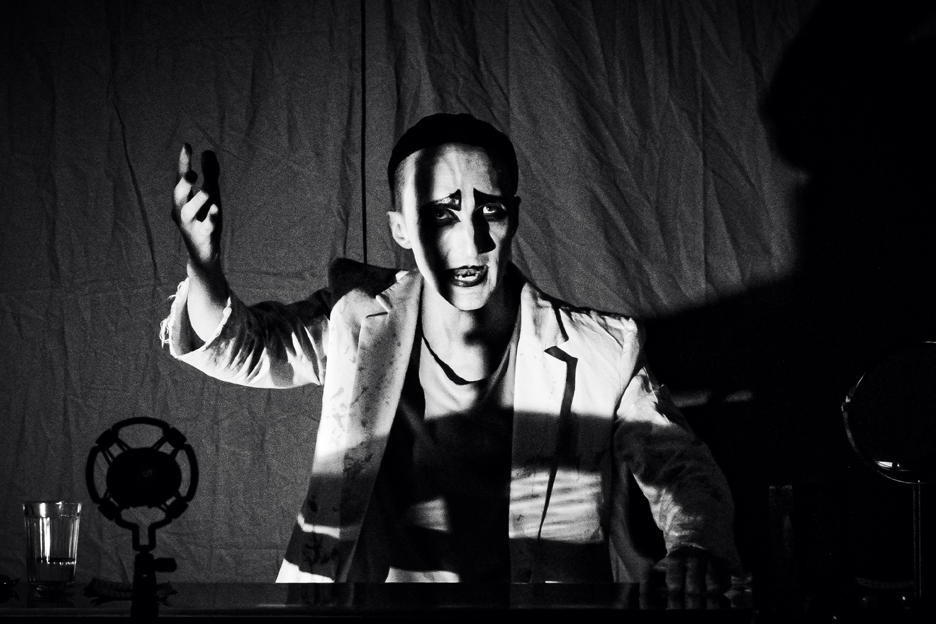Под буквой В. в названии спектакля Романа Кагановича скрывается знаменитый шансонье Александр Вертинский. Но не ждите «Лилового негра» и «Бананово-лимонного Сингапура» — песен не будет. Зато прозвучит документальная, основанная на личных мемуарах, трагическая исповедь артиста, который чувствует себя чужим и в эмиграции, в скитаниях по дальним азиатским странам, и в СССР, где ему приходится выступать перед колхозниками. Удивительный актер Сергей Азеев выходит на сцену полностью обнаженным, чтобы потом наложить грим и целиком перевоплотиться в «печального Пьеро».