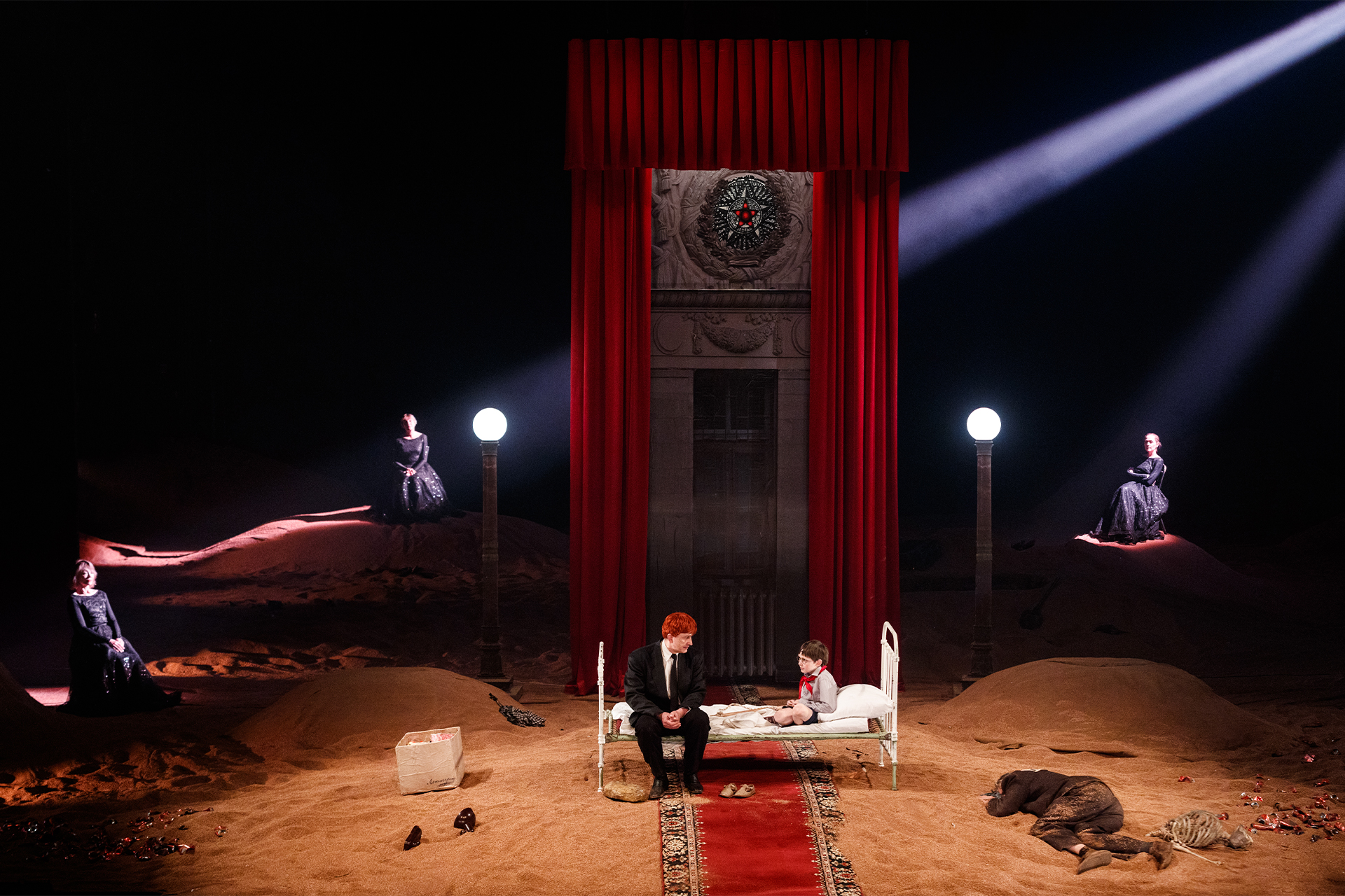Грандиозный опус Андрея Могучего, не связанный сюжетно с предыдущими частями саги. В нем словно соединились три разных спектакля: медитативный трип в стиле Беккета, где двое в пустыне все ждут своего Годо, пародия на советскую агитку с розовощекими пионерками и, наконец, страшный гиньоль со Сталиным, пожирающим своих детей. История, основанная на воспоминаниях актера Сергея Дрейдена, прорабатывает болезненный опыт предательства — предательства учеников, отвернувшихся от своих учителей, предательства детей, отрекшихся от отцов, «врагов народа».