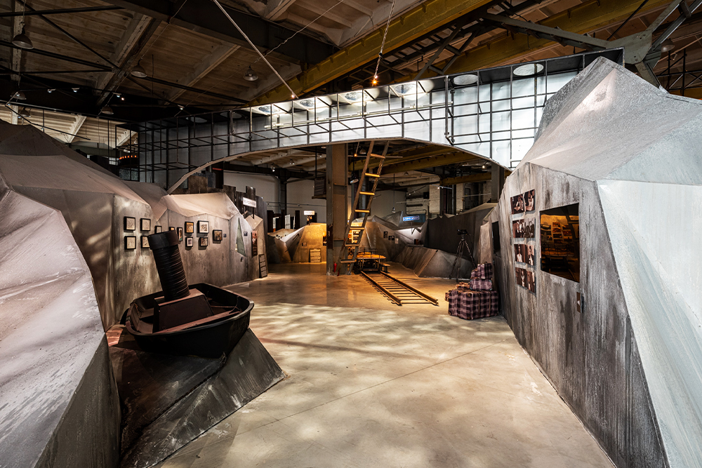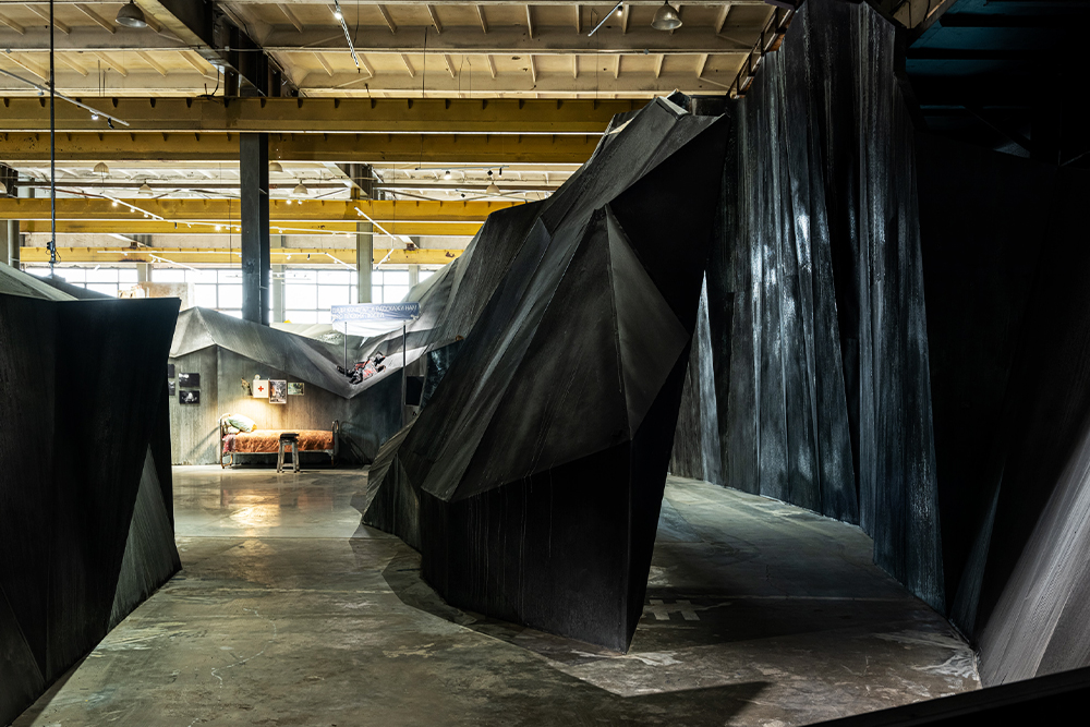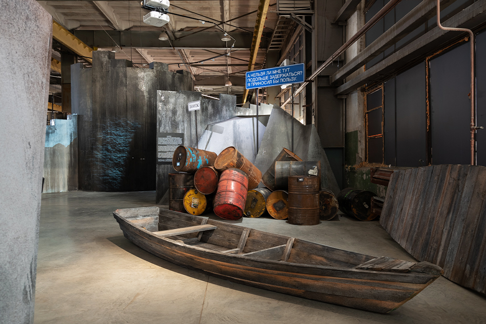 «Балабанов. Выставка-путешествие» — так назвали свое детище организаторы — бюро Planet 9 и кинокомпания СТВ, куратор Татьяна Гетман и художник-постановщик Агния Стерлигова. «Выставка-путешествие» кажется намеренной рифмой к названию прошлого выставочного хита Planet 9 — «Виктор Цой. Путь героя». Но дело, конечно, не только в намерении провести ниточку от героя 1980-х к герою 1990-х и 2000-х. Путешествие — идеальное слово для описания того, что предстоит посетителю. Архитектура выставки — ландшафты сновидений: высокие горы, заводские трубы, холодные реки, городские трущобы, железнодорожные рельсы, бедные пристанища, в которых не хочется задерживаться надолго, а они тебя так просто не отпускают, тянут и тянут. Есть даже замок — да тот самый, в который трудно войти и из которого еще труднее выйти. Через все это проложена хрупкая дорога из желтого кирпича — человеческая жизнь.