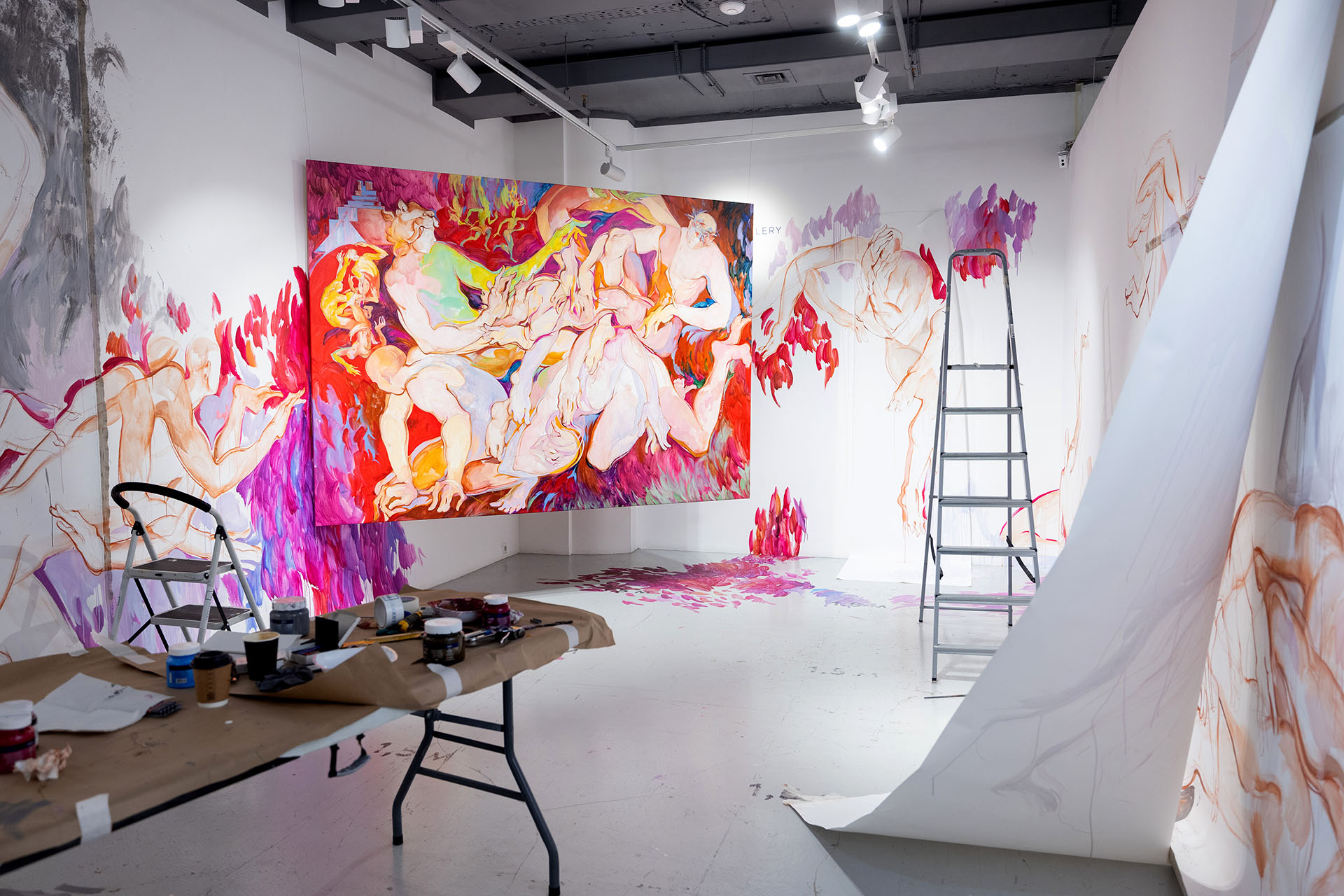 PA Gallery представляет тотальную инсталляцию Алисы Гореловой «За пределами формы». Художница исследует тему трансформации и размывания границ между индивидуальным и коллективным, частным и социальным. Образы в её проекте выходят за пределы полотна, перетекают на стены и снова возвращаются внутрь картины, превращая пространство галереи в единый живописный организм. Мифологические сюжеты, к которым отсылает работа, подчеркивают текучесть и изменчивость формы: Дафна, превращающаяся в дерево, жители Помпеи, застывшие в момент катастрофы. В этом поле переходных состояний зритель оказывается внутри потока сливающихся и распадающихся тел. Увидеть экспозицию можно до 7 декабря.