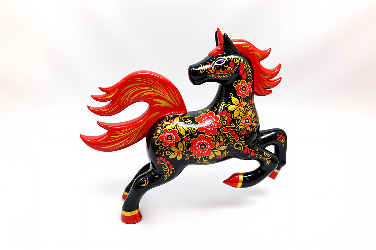 Декоративная роспись золотистыми, зелёными и красными красками на чёрном фоне зародилась в деревнях левого берега Волги. Готовые изделия везли продавать в крупное торговое село Хохлома Нижегородской губернии, отчего роспись и получила своё название. Образ коня в этом промысле многолик: он встречается и в качестве самостоятельной фигуры, и как часть орнамента.
