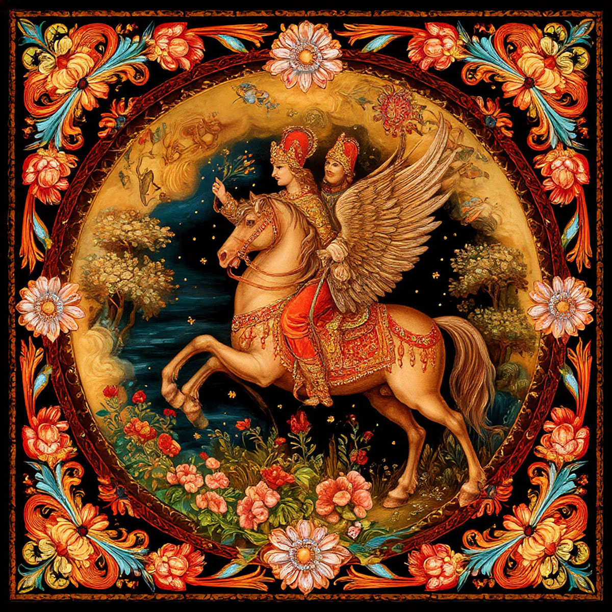 Посёлок Палех Ивановской области издавна знаменит иконописью. Наивысшей точки мастерство палехских иконописцев достигло в XVIII–XIX вв. Местные мастера помогали расписывать и реставрировать Грановитую палату, церкви Троице-Сергиевой лавры, а также Новодевичий монастырь. После революции 1917 года, когда религиозное искусство оказалось под запретом, художники перенесли свои навыки в фольклор. Конь здесь почти всегда изображается в динамике: стремительный, огненный, летящий.
