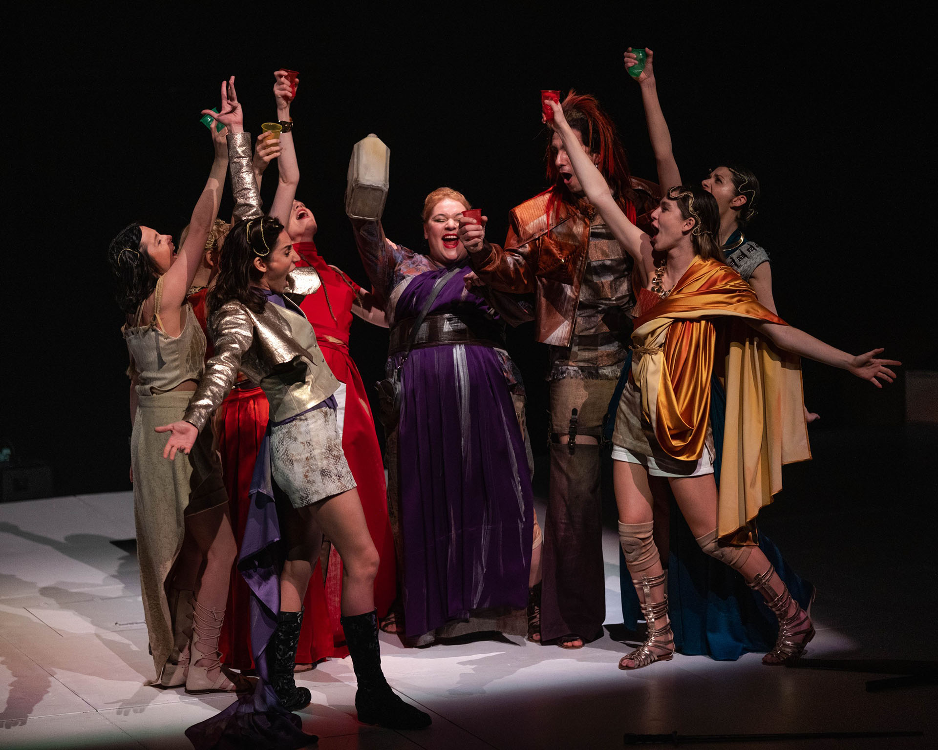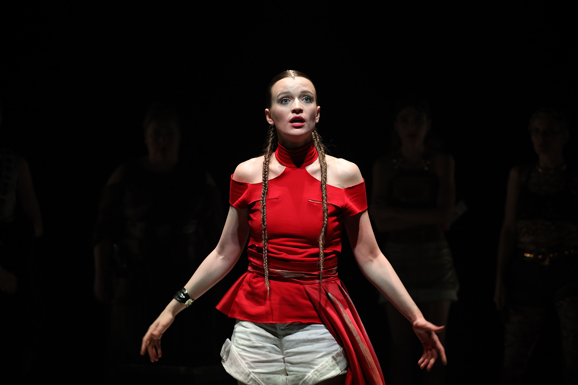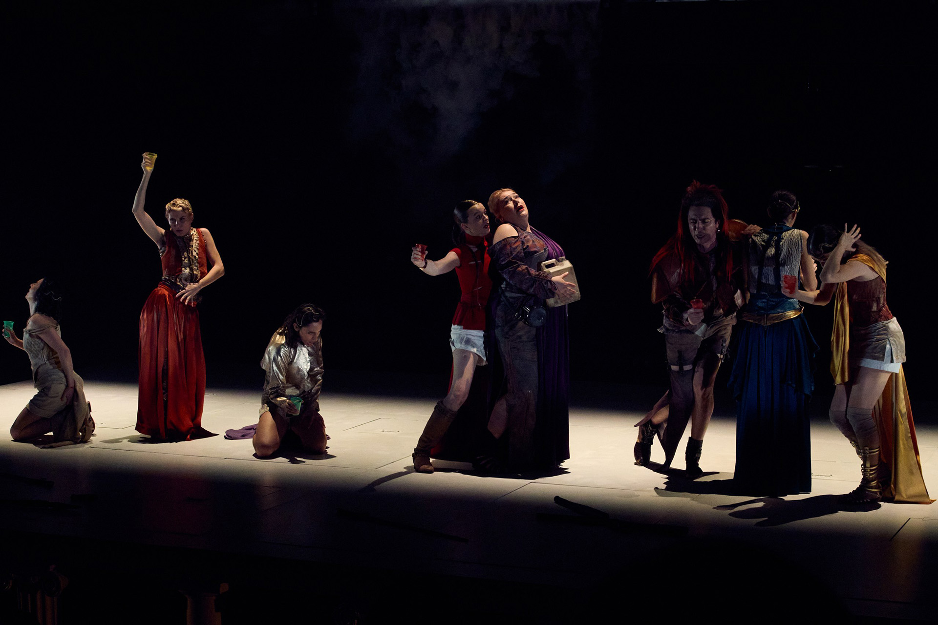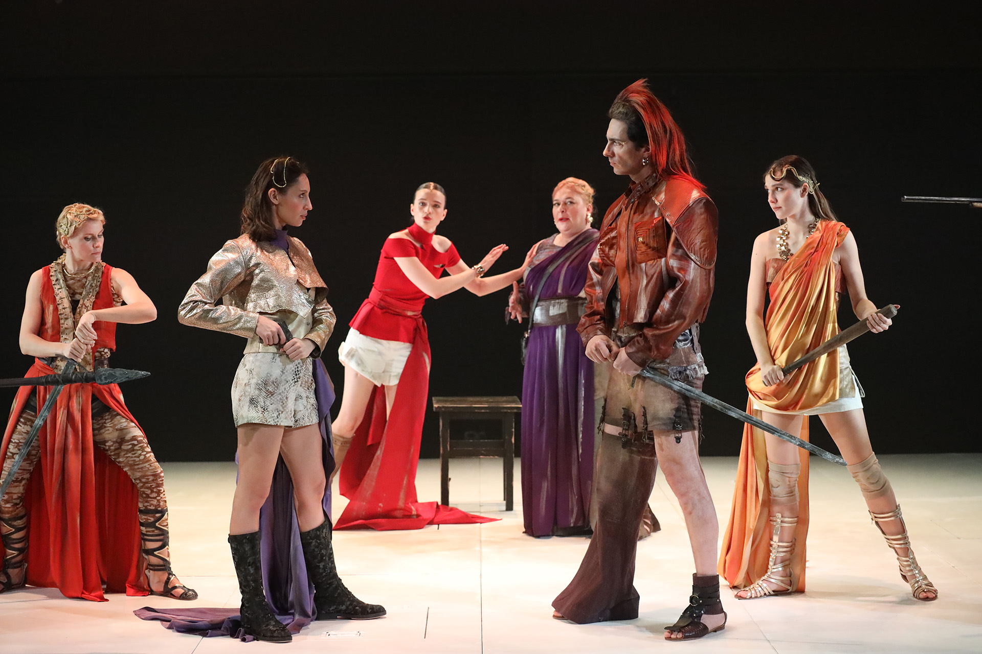 Эклектика, как доминирующий приём, отличает режиссёрскую форму этого спектакля. Герои то принимают статичные позы и ведут диалог, словно в настоящем древнегреческом театре, то сцена превращается в настоящий ринг, на котором разворачивается нешуточное противостояние полов, и, наконец, все объединяются в ритме зажигательных танцев. Будто на костюмированном рейве беотийянки, фивянки, коринфянки, спартанки дают, наконец, волю эмоциям под музыкальные ритмы эстрадных хитов. А поёт каверы никто иной, как античный бог, он же Хор, которого иронично играет Сергей Шадрин в золочёных шароварах, показывая музыкальные пародии и спускаясь к своим неразумным «подданным» практически с неба. Всё действие он наблюдает за их решениями и даже как будто руководит сюжетом с галереи зала под колосниками.