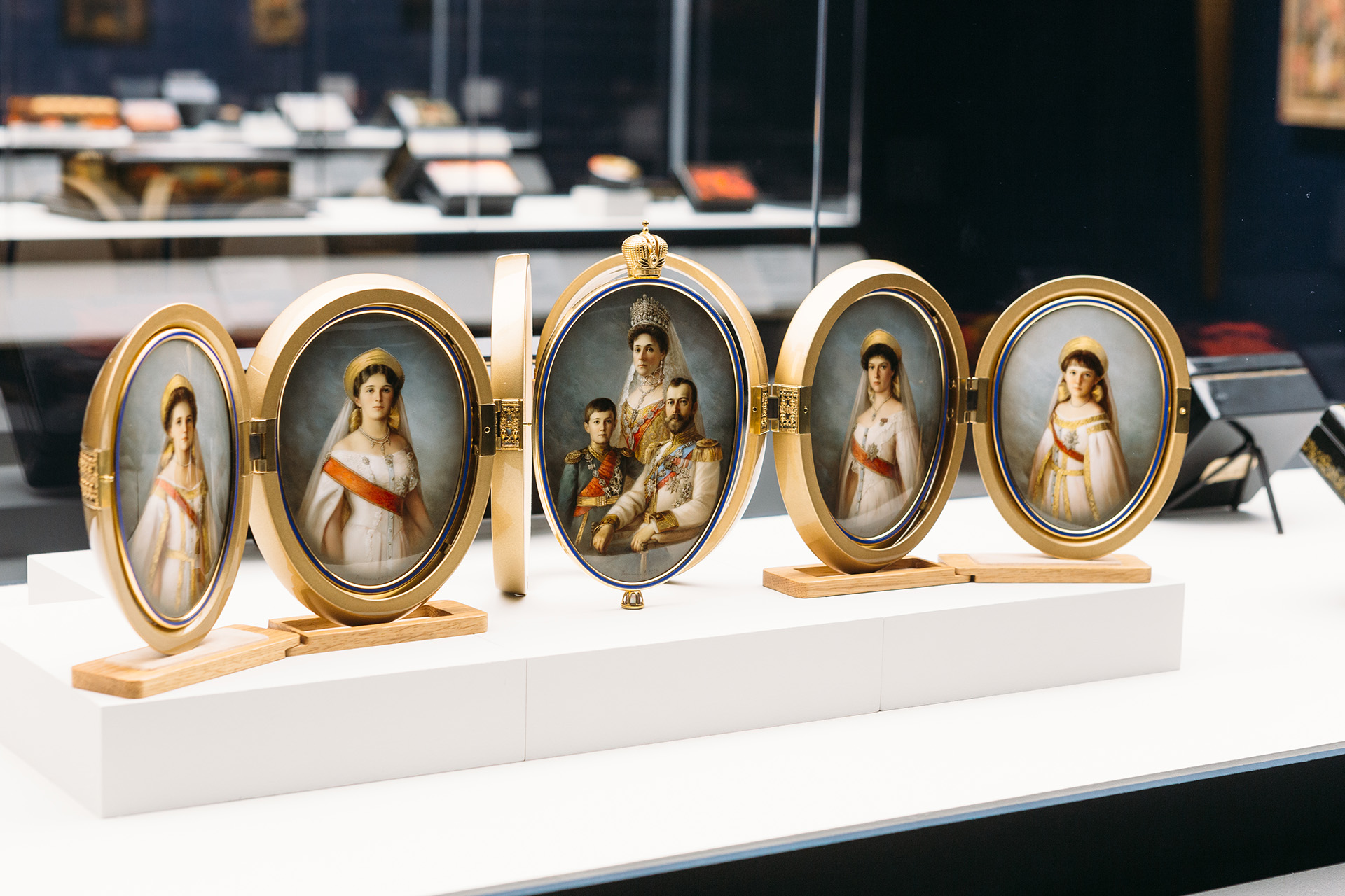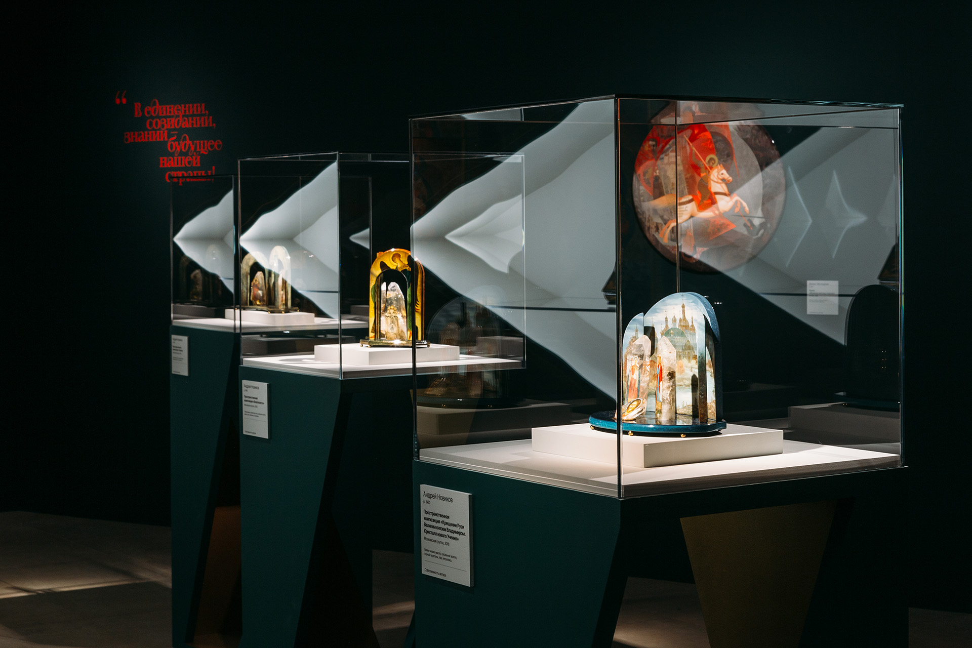 В этом же зале — и иной исторический ракурс. Семейная пара Любовь Пашинина и Юрий Чернобаевский (Федоскино) создали яйцо-ширму «Царские страстотерпцы». Декоративный объект отдаёт дань уважения последней царской семье и Карлу Фаберже, чьё имя тесно связано с династией Романовых. «Ширма» раскрывается, и на четырёх панелях появляются миниатюрные портреты дочерей императора — Ольги, Татьяны, Марии и Анастасии. Центральное панно посвящено Николаю II, Александре Фёдоровне и сыну Алексею. Форма яйца здесь работает как символ цельности и единства: единение перед страной, справедливость и равенство перед законом, верность традициям предков — залог будущего Отечества. Эта мысль становится одной из ключевых на выставке.