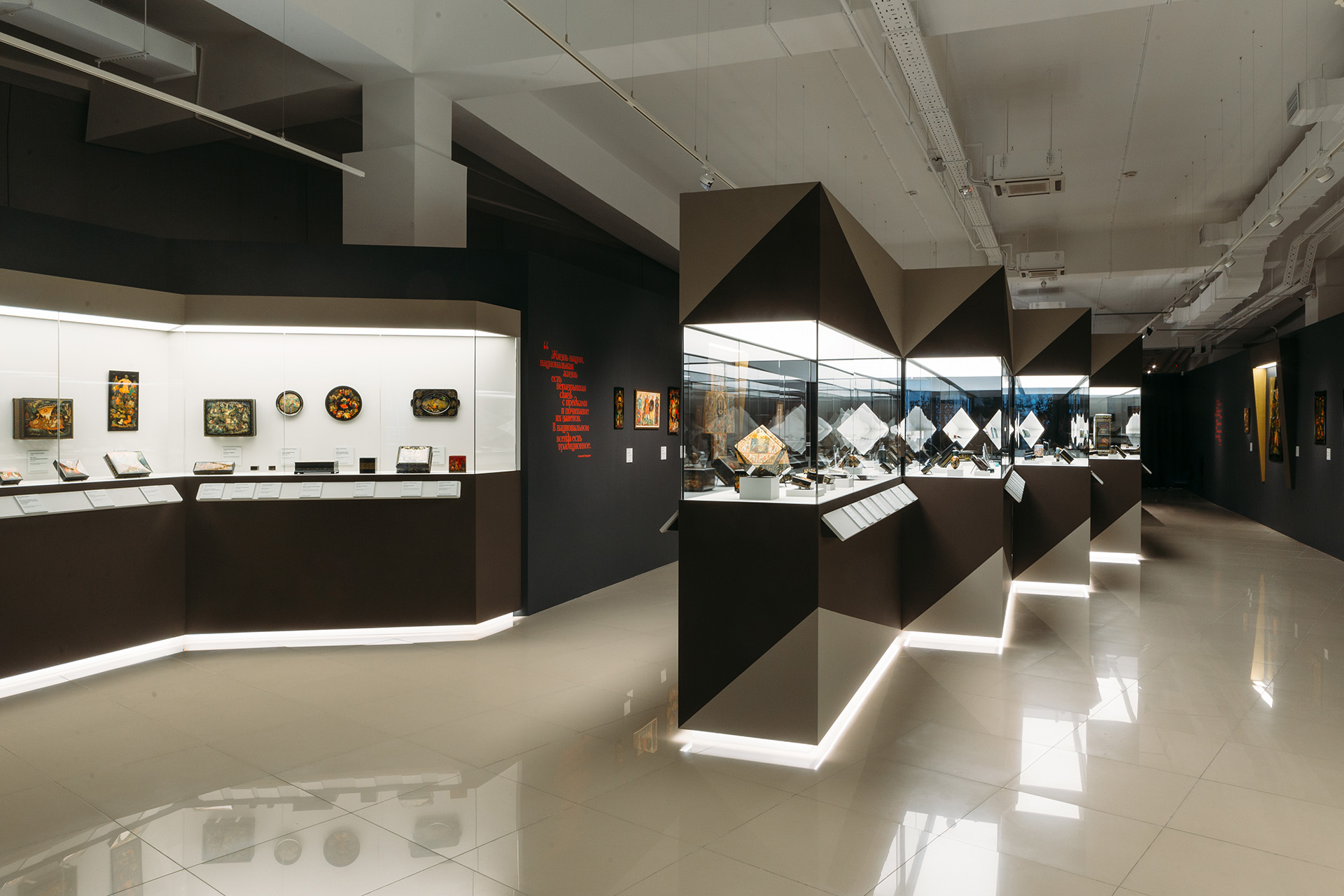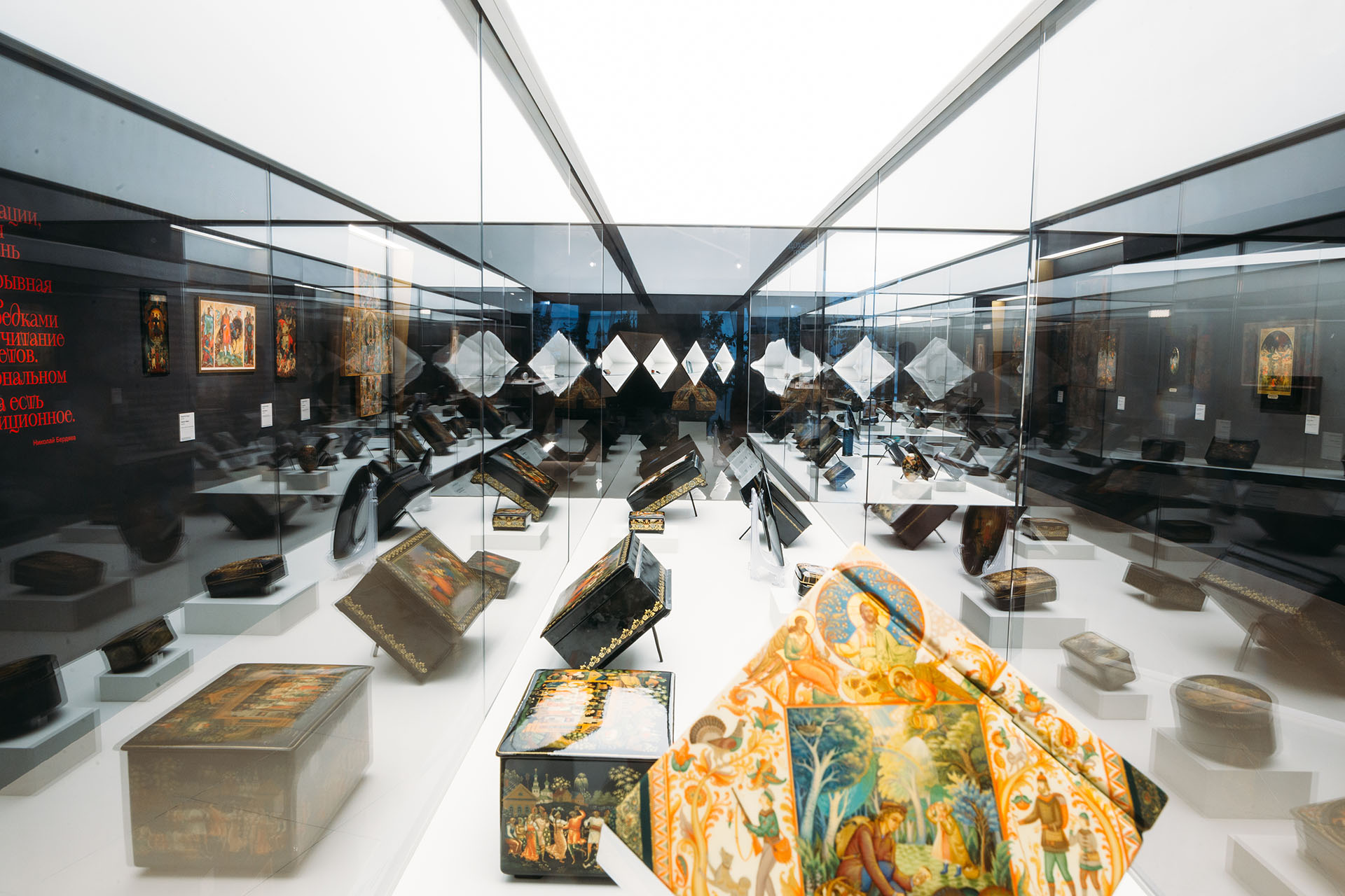 Экспозиция третьего зала выставки «Лаки. Большая история в миниатюре: Федоскино, Палех, Мстёра и Холуй» Фото: Арман Тадевосян / пресс-служба музея «Новый Иерусалим»