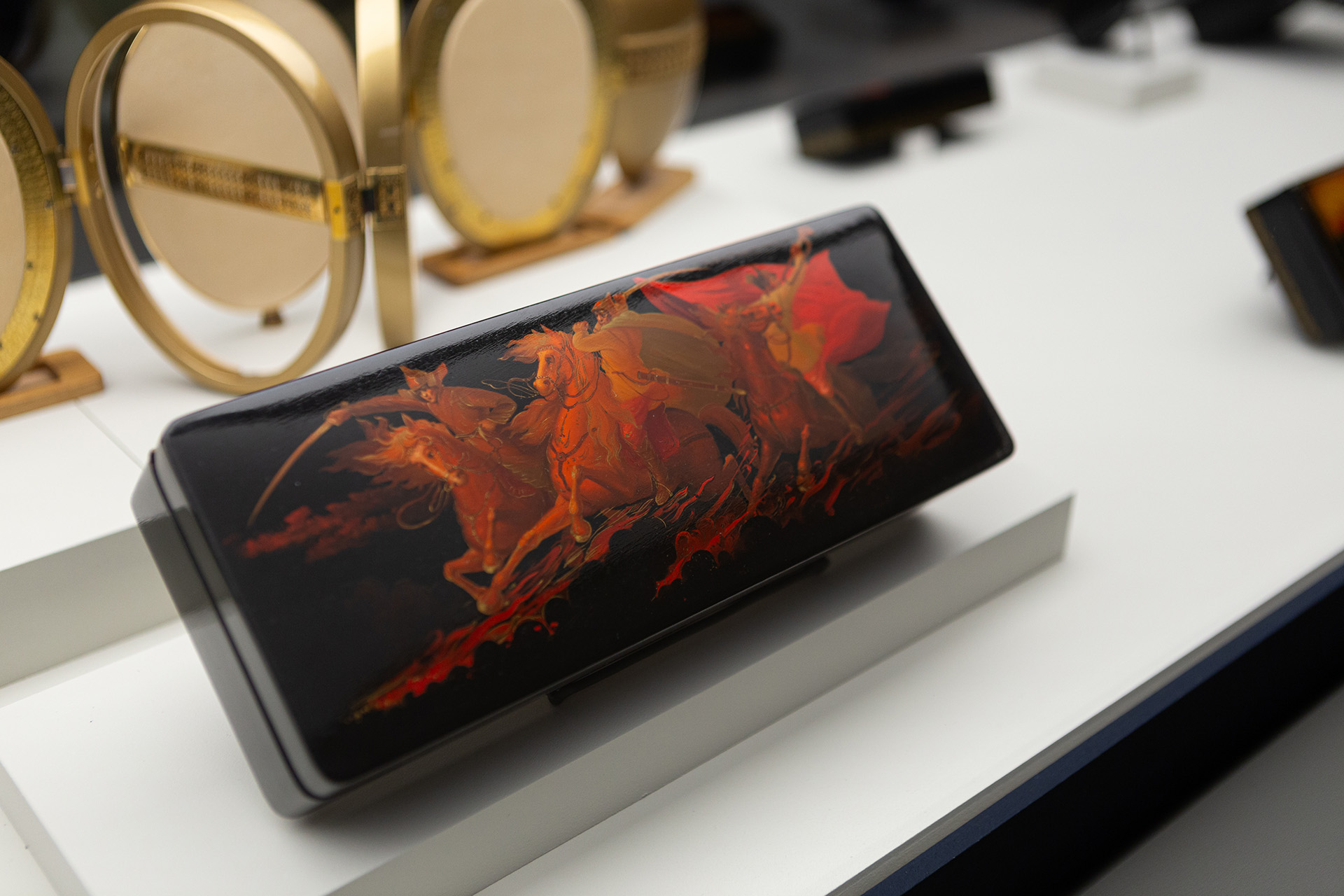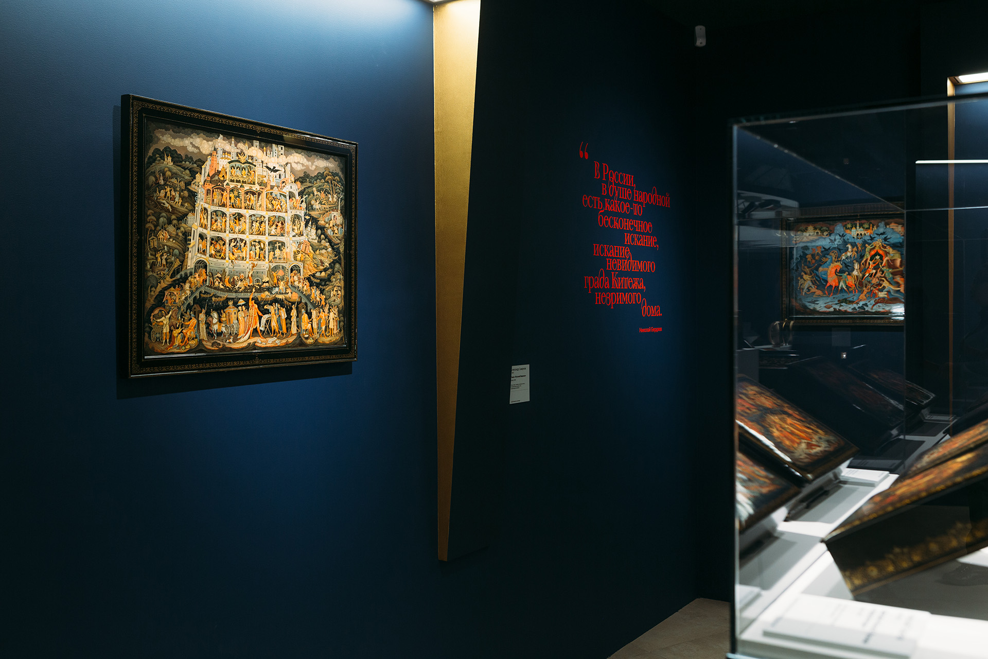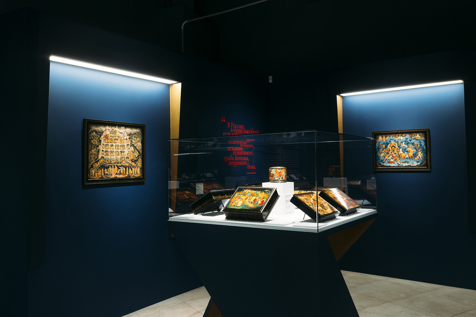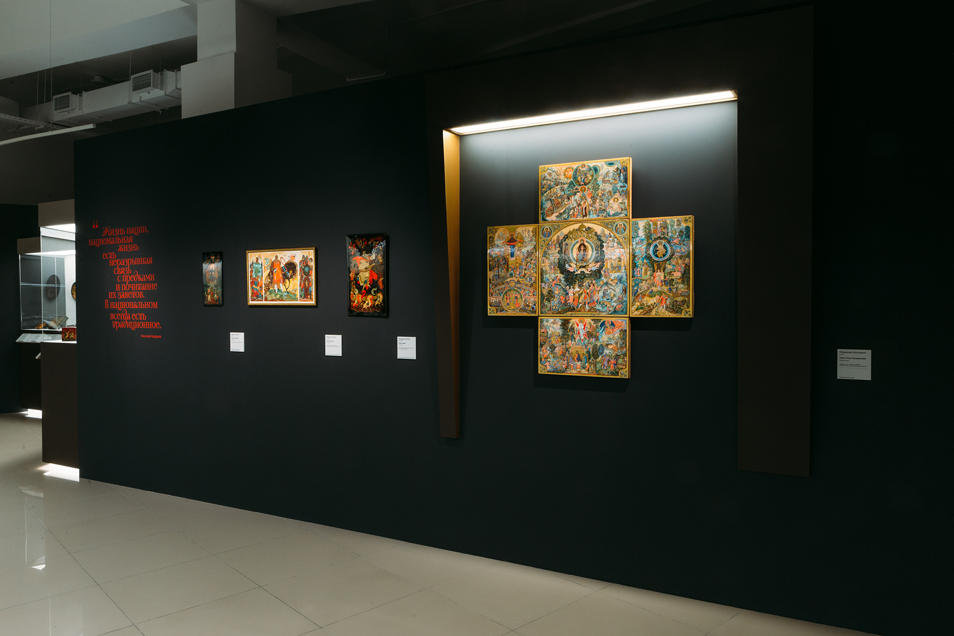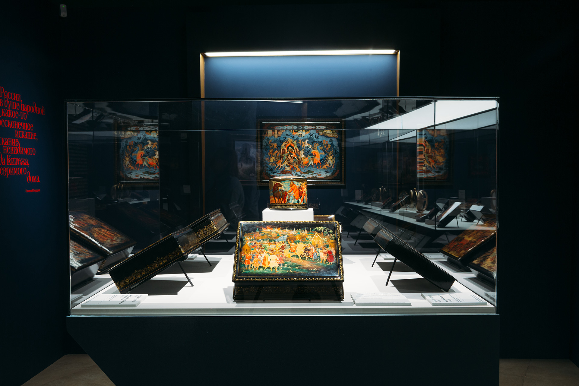 За столетия лаковая миниатюра превратилась в один из языков русской культуры — в ней закрепились и быт, и память, и вкус эпох. Три зала выставки делят этот рассказ на три линии: народная культура и героическое прошлое, поворотные моменты истории, духовное наследие и единение.