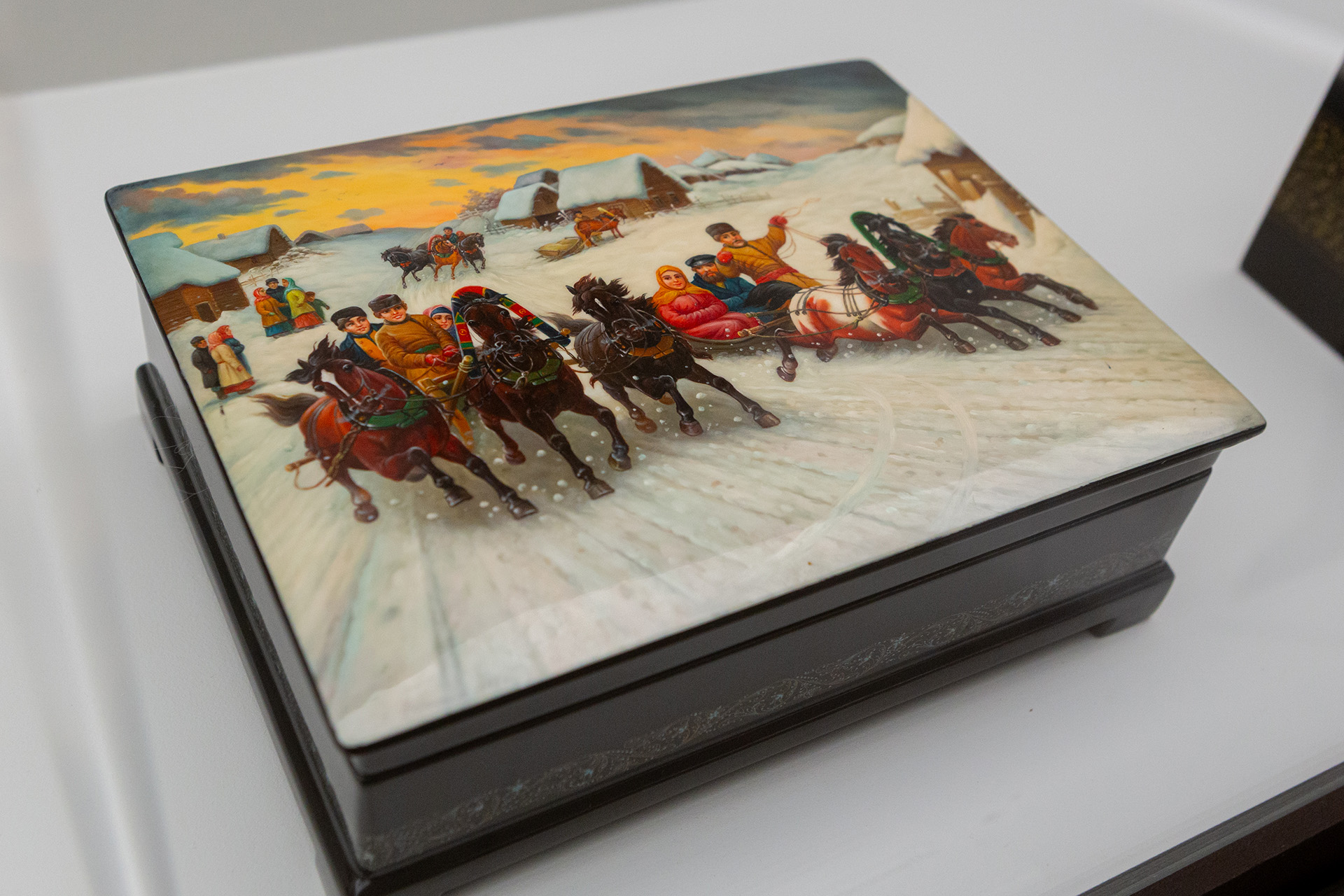 Наталья Леонова, ларец «Тройки на Масленницу», Федоскино, 1990 год Фото: Арман Тадевосян / пресс-служба музея «Новый Иерусалим»
