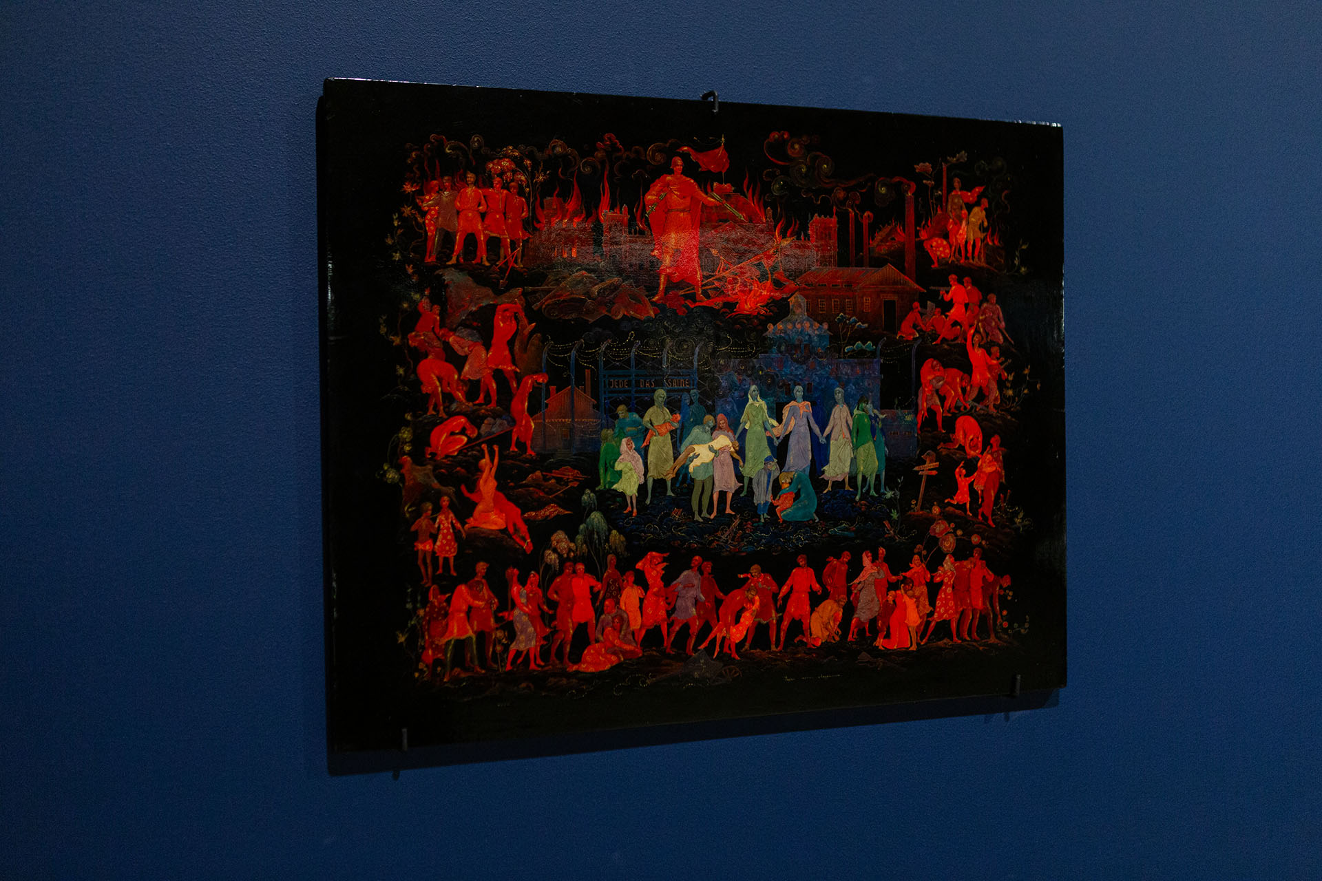 Одна из самых тёмных историй XX века — история концлагерей. Панно палехского мастера Константина Андрианова «Незабываемое», посвящённое Бухенвальду, написано в 1967 году. На нём изображено восстание узников 11 апреля 1945 года. В центре композиции — крематорий, окружённый колючей проволокой. Фигуры людей — преимущественно женщин и детей — даны в сине-зелёной холодной гамме, словно бесплотные души. Но уже видна надежда: появляется образ солдата-освободителя Красной армии. Он стоит на фоне пылающего Рейхстага; в руке — сломанный меч как символ разрушенной «непобедимой» машины. Под ногами — горящие штандарты, танки, каски.