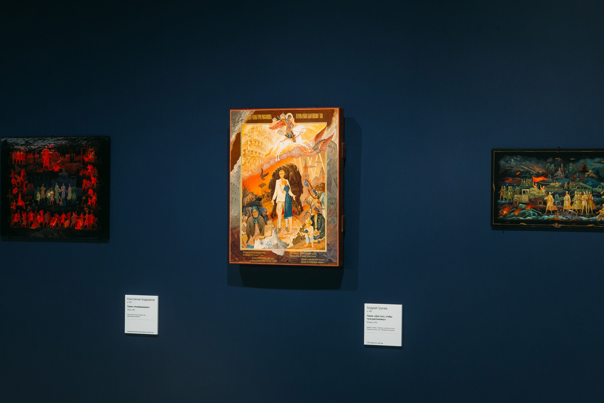 В конце зала зрителей «провожает» панно Александра Смирнова «Русский Вавилон» (Холуй, 2010). Его стиль уникален для современной лаковой миниатюры: автор соединяет библейские сюжеты, литературные мотивы и русскую историю — с иронией, лиризмом и внутренней добротой. Название отсылает к истории Вавилонской башни (Бытие, глава 11): Бог лишает людей единого языка, и они перестают понимать друг друга. Смирнов говорит об очевидном: без единения и взаимопонимания благополучия не бывает. Эта тема продолжается в третьем зале.