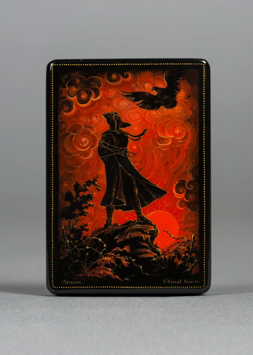 Борис Киселёв, один из ведущих холуйских мастеров, выполнил коробочку «Орлёнок» по мотивам знаменитой песни 1936 года «Орлёнок, орлёнок, взлети выше солнца»: её строки стали гимном для нескольких поколений советской молодёжи. Художник использует контраст: силуэт юного красноармейца, готового отдать жизнь за идеалы, и коршун над ним — предвестие трагедии.