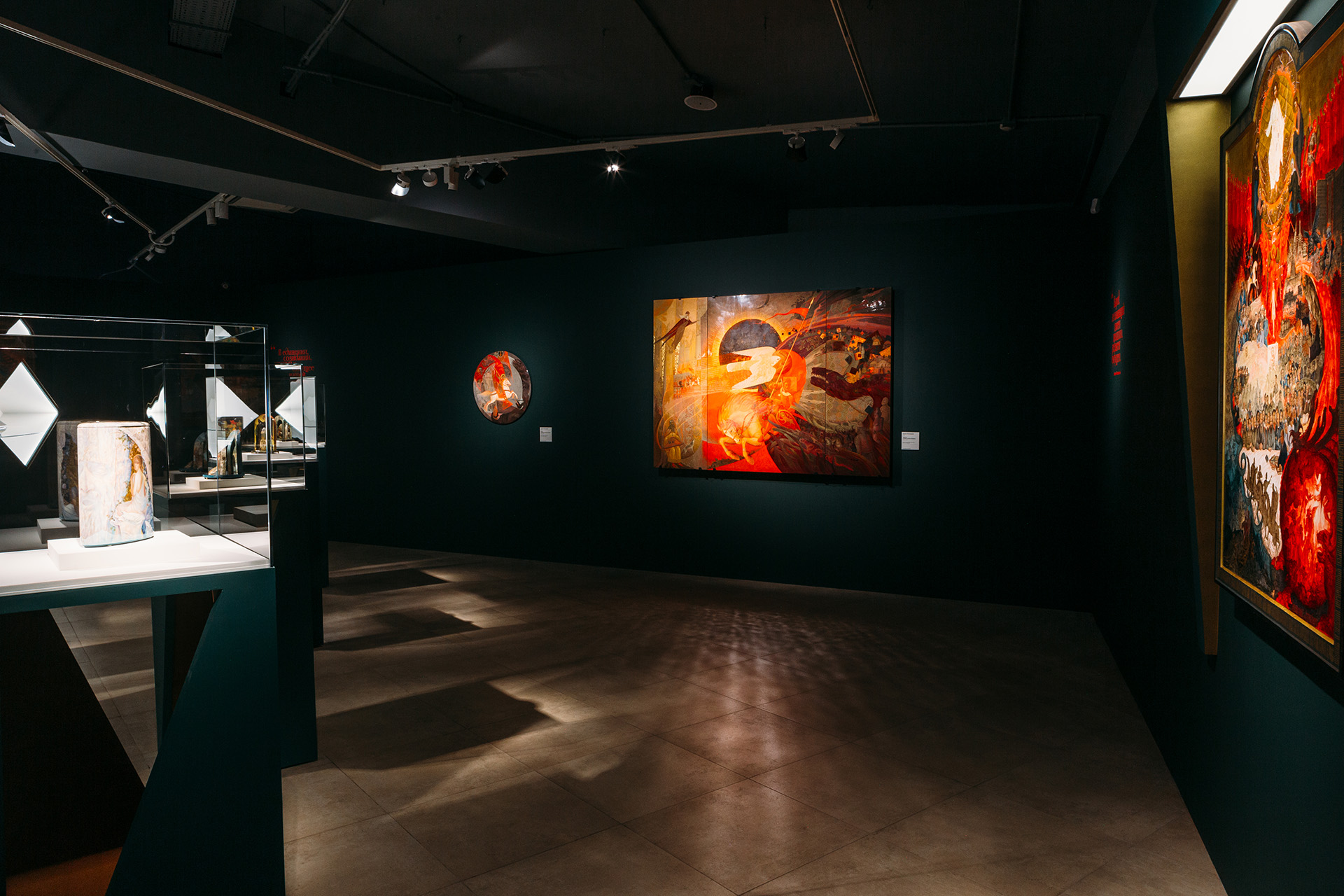 Ключевое произведение финального зала — панно Дениса Молодкина «Слово о полку Игореве» (2024): современное прочтение великого текста древнерусской литературы. Это не буквальная иллюстрация, а образ, отражающий драматическую ситуацию в истории Отечества. Фирменный приём Молодкина — сочетание разных оттенков золота и охры на ярко-красном фоне; тревожный колорит подвижной воздушной среды словно втягивает героя внутрь событий. Художник долго работал над панно и в процессе решил существенно увеличить масштаб: заказал иконописные доски, чтобы произведение по сюжету текста XII века выглядело аутентично. На триптихе — момент пленения князя Игоря Святославича, отправившегося на битву в поисках славы. Рядом — сокол, символ воинственного напора. Половцы образуют голову дракона; тут же — гибкие тела гепардов, которых в древности использовали для охоты. Доспехи, вооружение, одежда, знамена, орнаменты, архитектура, каллиграфия — все атрибуты эпохи художник изучил по историческим материалам и вписал в работу с исключительным вниманием к деталям.
