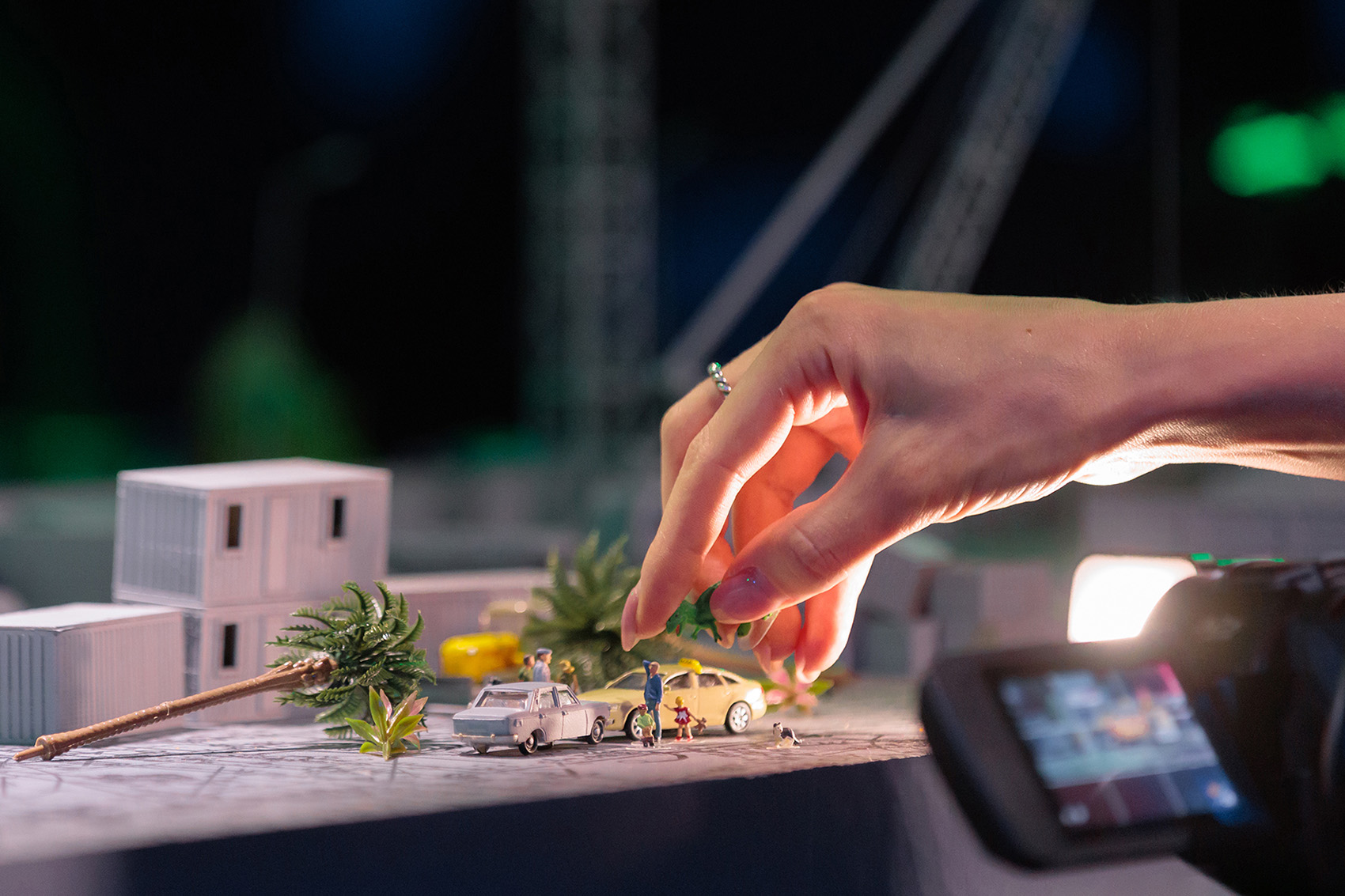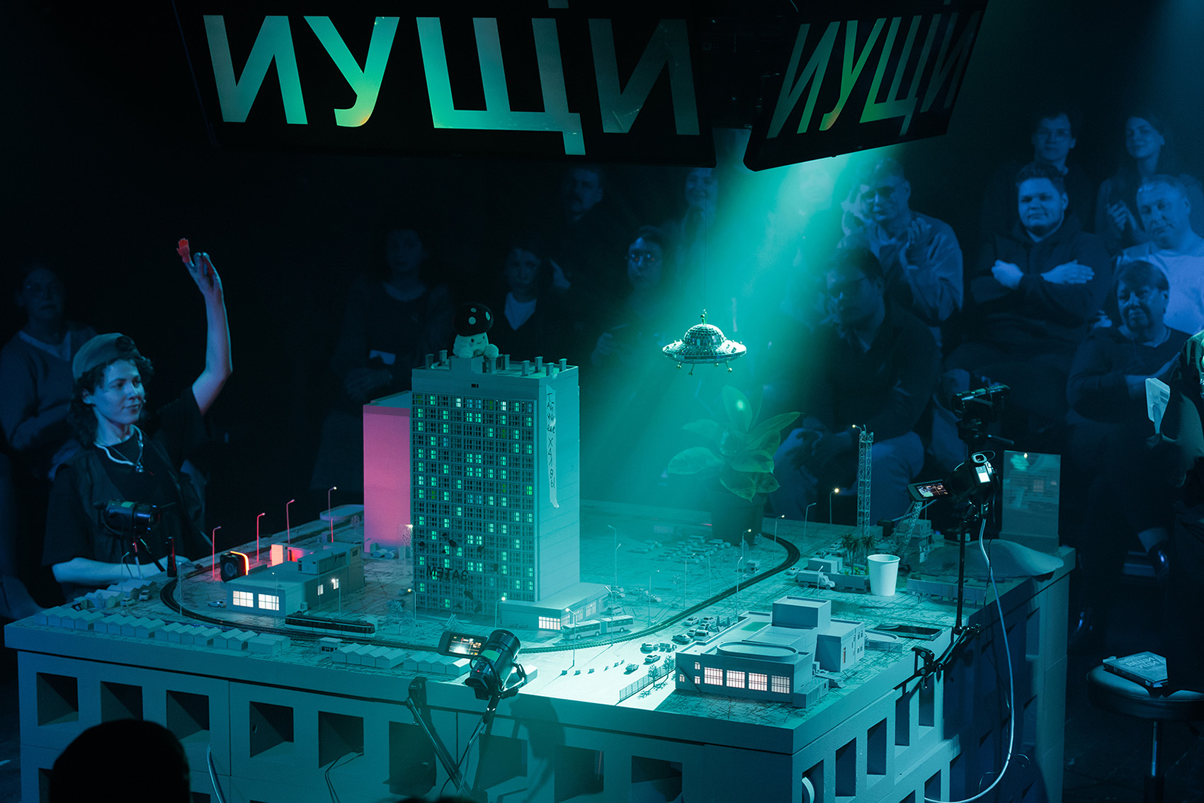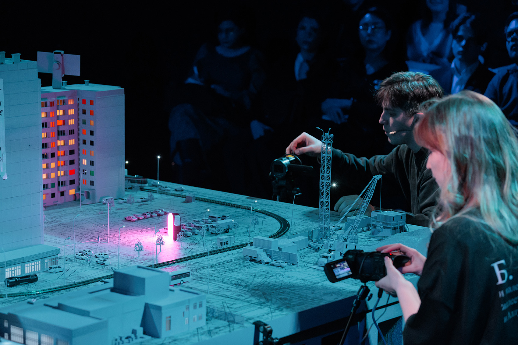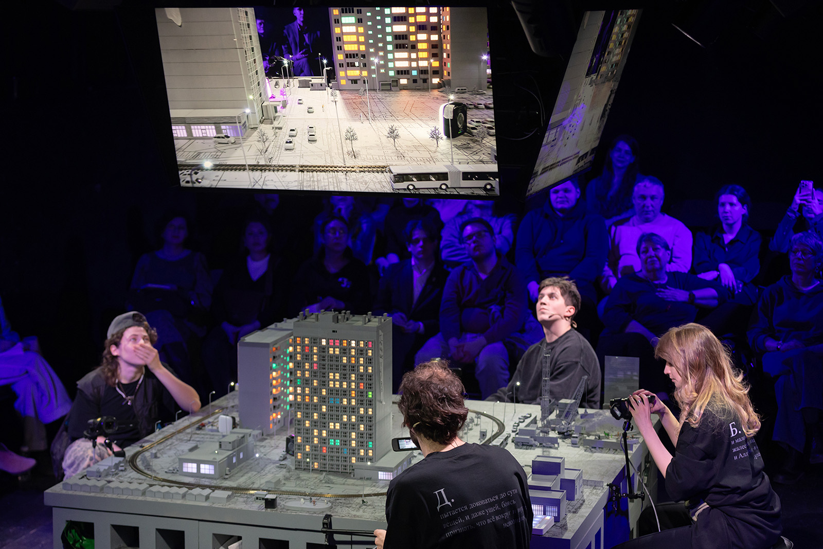 В московском спектакле «Вещи и ущи» стояли иные задачи, соответственно, нужен был другой инструментарий. Каким способом показать большой город, где живут миллионы людей, но при этом рассмотреть и услышать индивидуальность каждого? Как в театре воспроизвести эффекты зум-аут и зум-ин? Мы решили создать макет города и использовать камеры, чтобы в нужный момент делать акцент на конкретном человеке, для этого понадобился предметный театр.