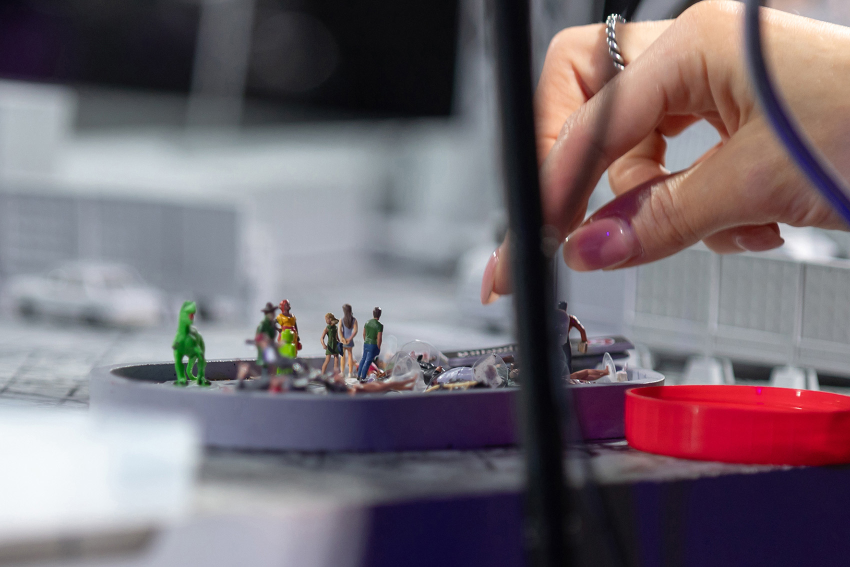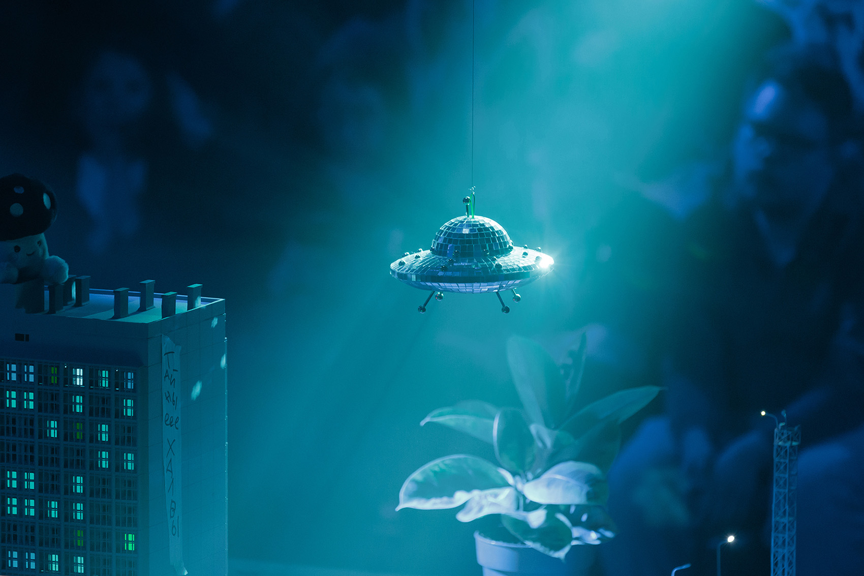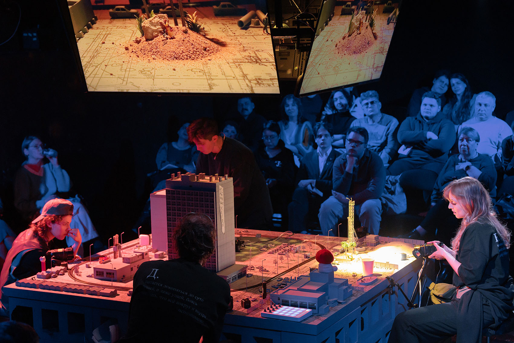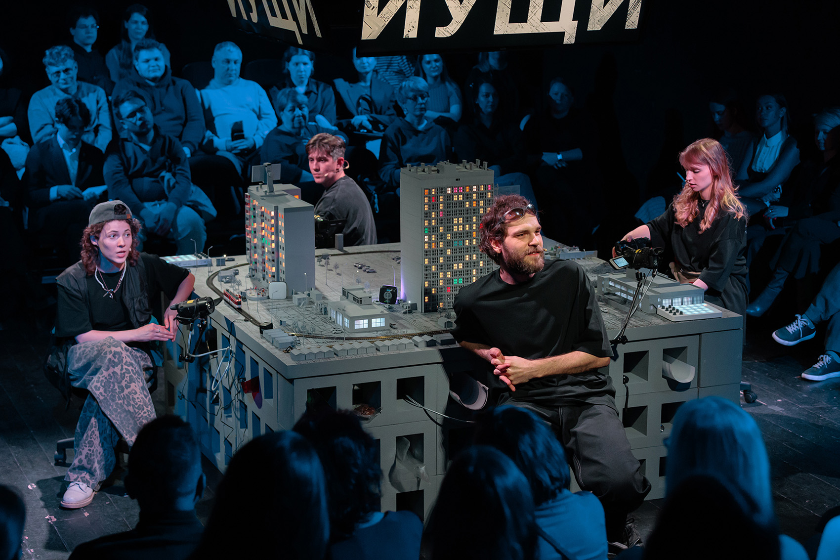 В московском спектакле «Вещи и ущи» стояли иные задачи, соответственно, нужен был другой инструментарий. Каким способом показать большой город, где живут миллионы людей, но при этом рассмотреть и услышать индивидуальность каждого? Как в театре воспроизвести эффекты зум-аут и зум-ин? Мы решили создать макет города и использовать камеры, чтобы в нужный момент делать акцент на конкретном человеке, для этого понадобился предметный театр.