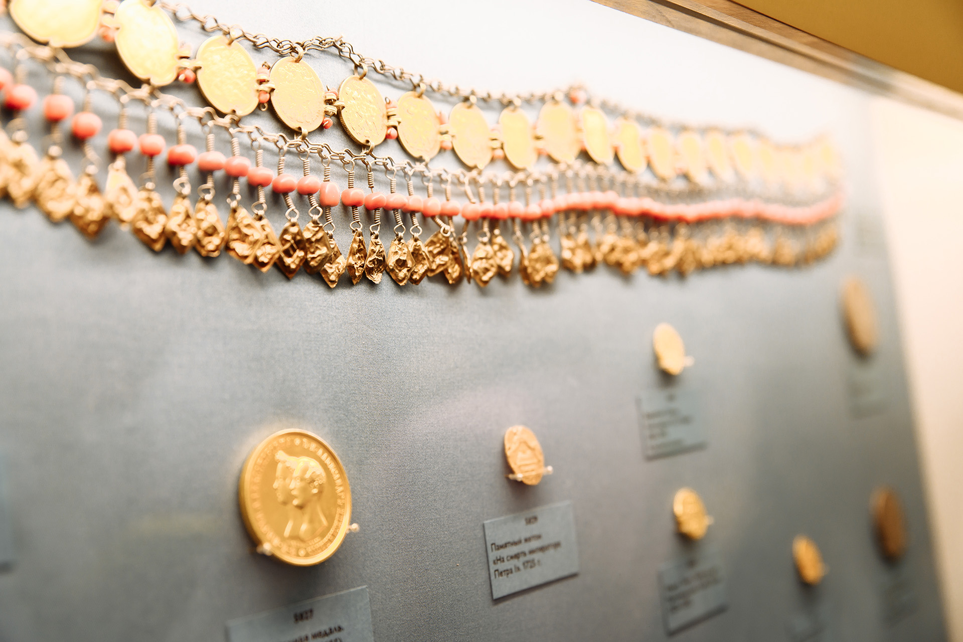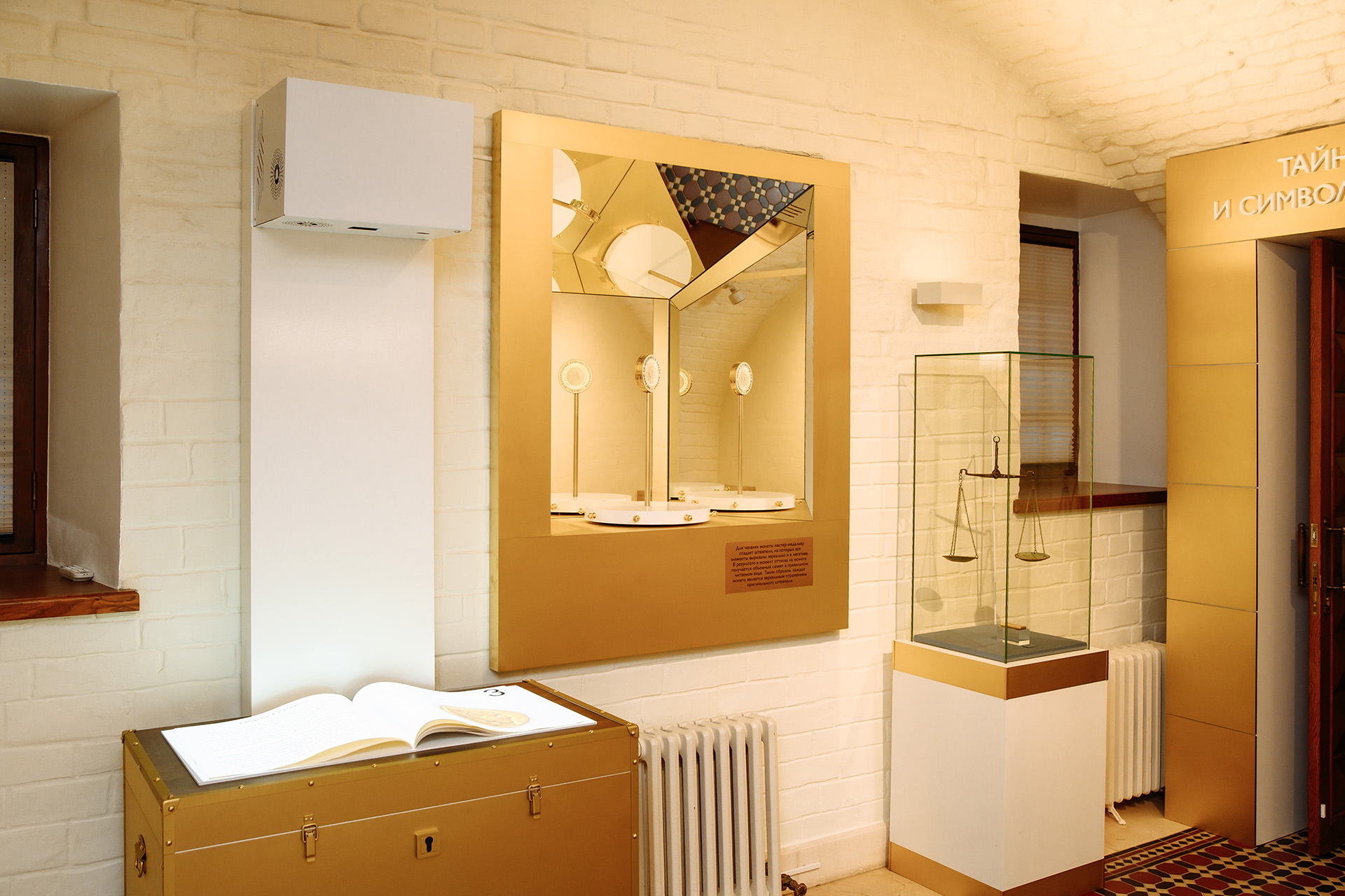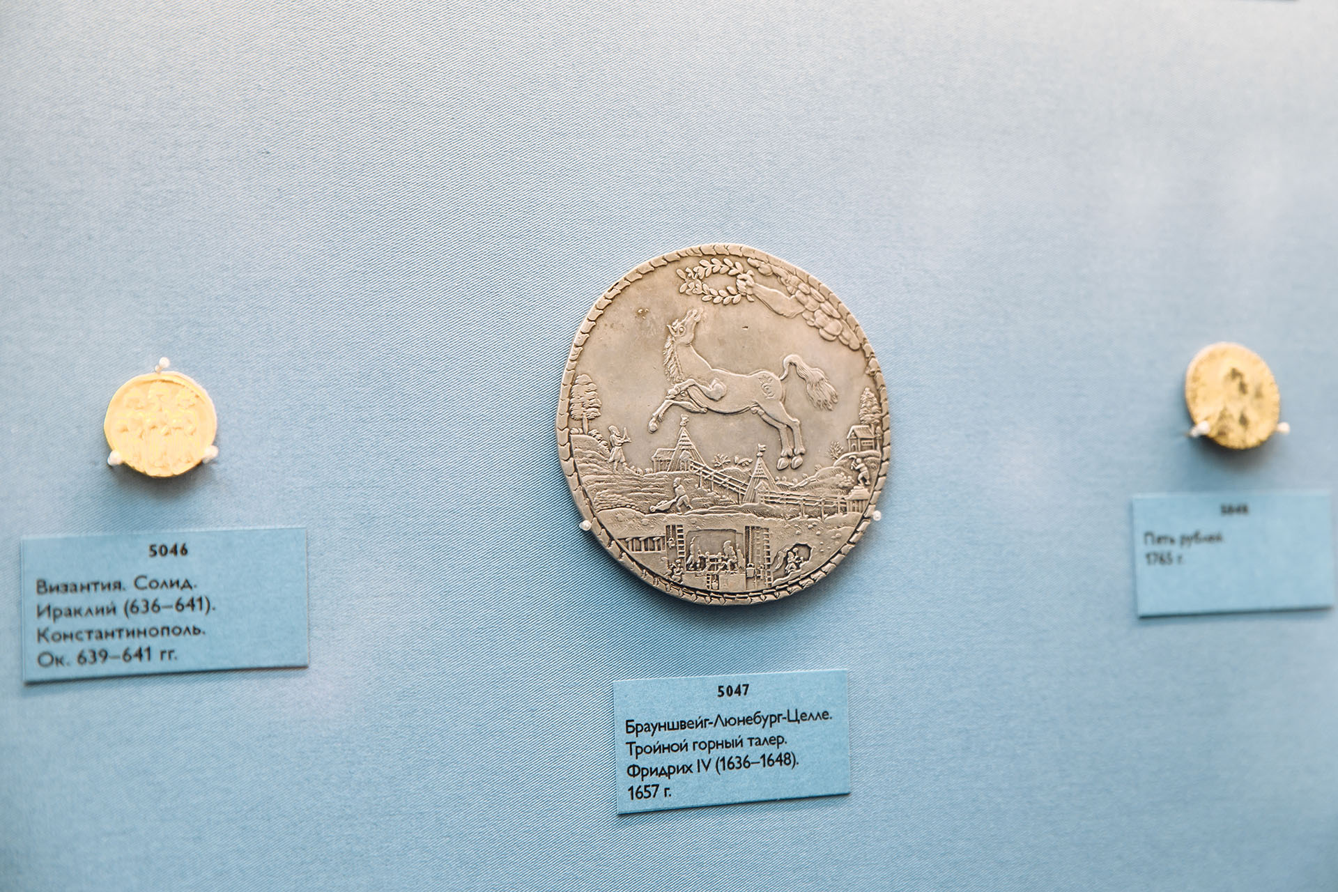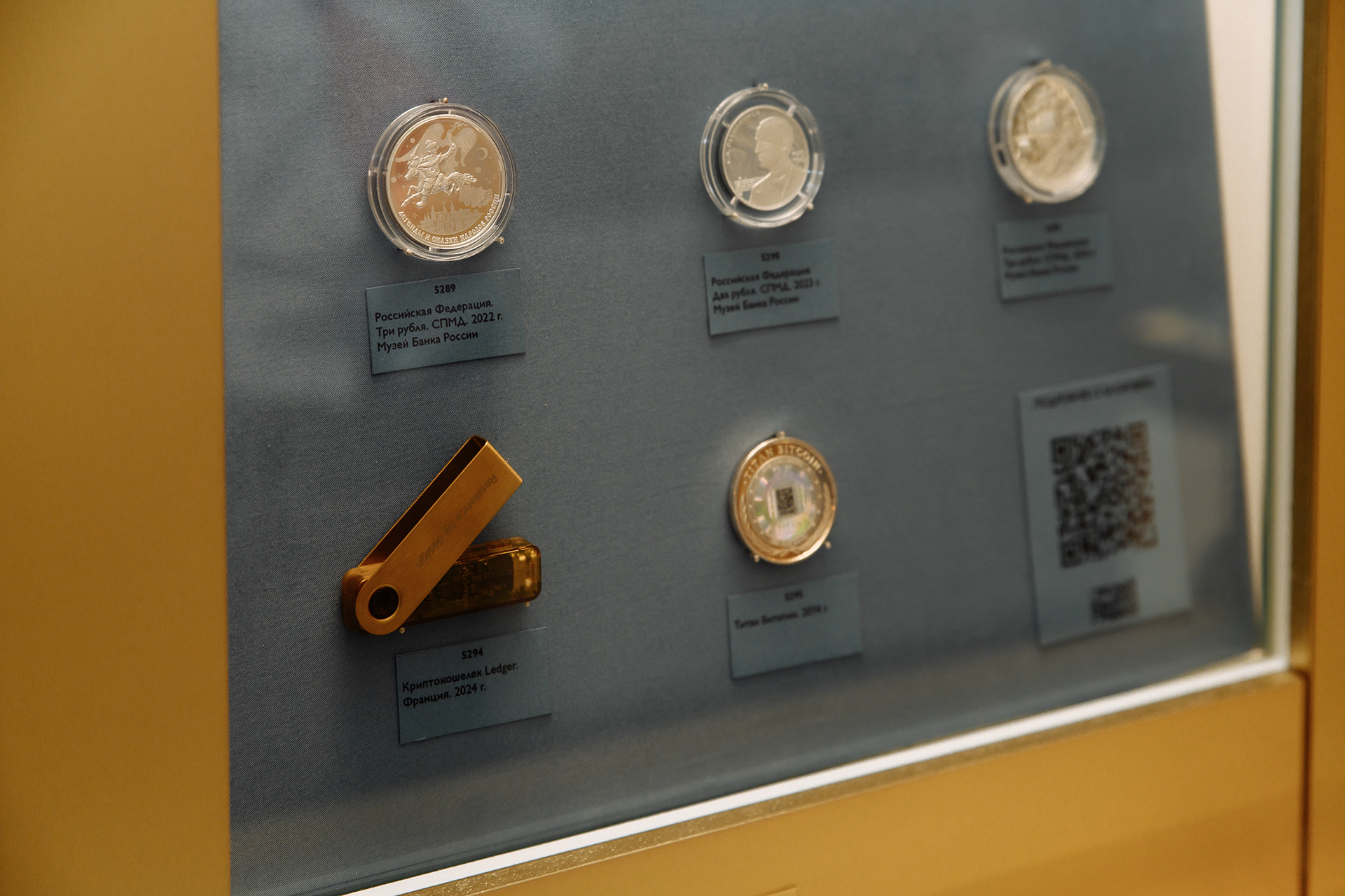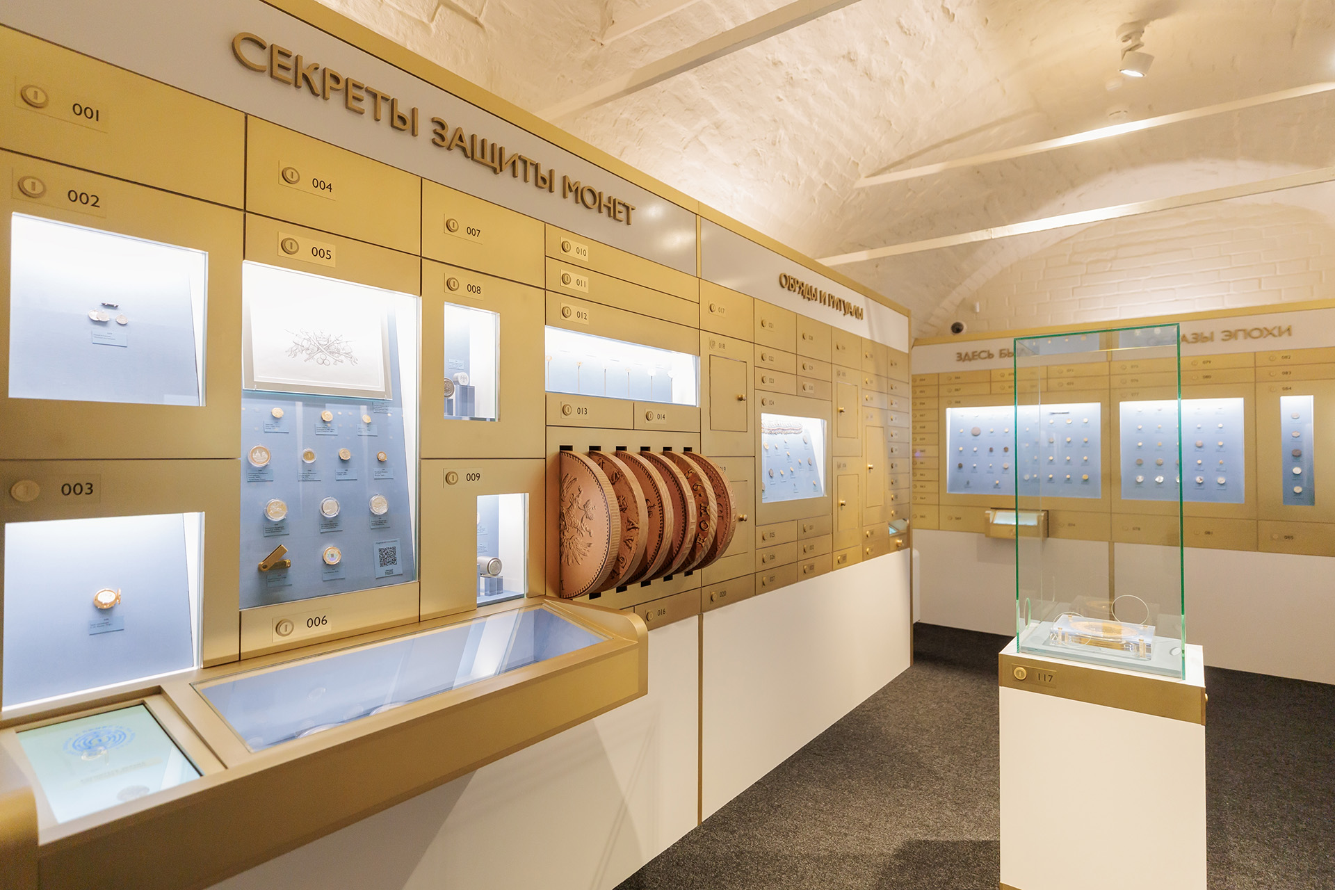 Выставка оформлена как сейфовое хранилище — пространство, где ценности скрыты и защищены кодами. Эта метафора подчёркивает загадочность и многослойность нумизматики, погружая посетителей в атмосферу поиска и тайны. Витрины зала оснащены цифровыми планшетами, позволяющими рассмотреть детали изображений и выявить их ключевые элементы. Интерактивное «зеркало» помогает сравнить монетное дело с другими видами искусства, показывая знакомые символы в глобальном контексте.