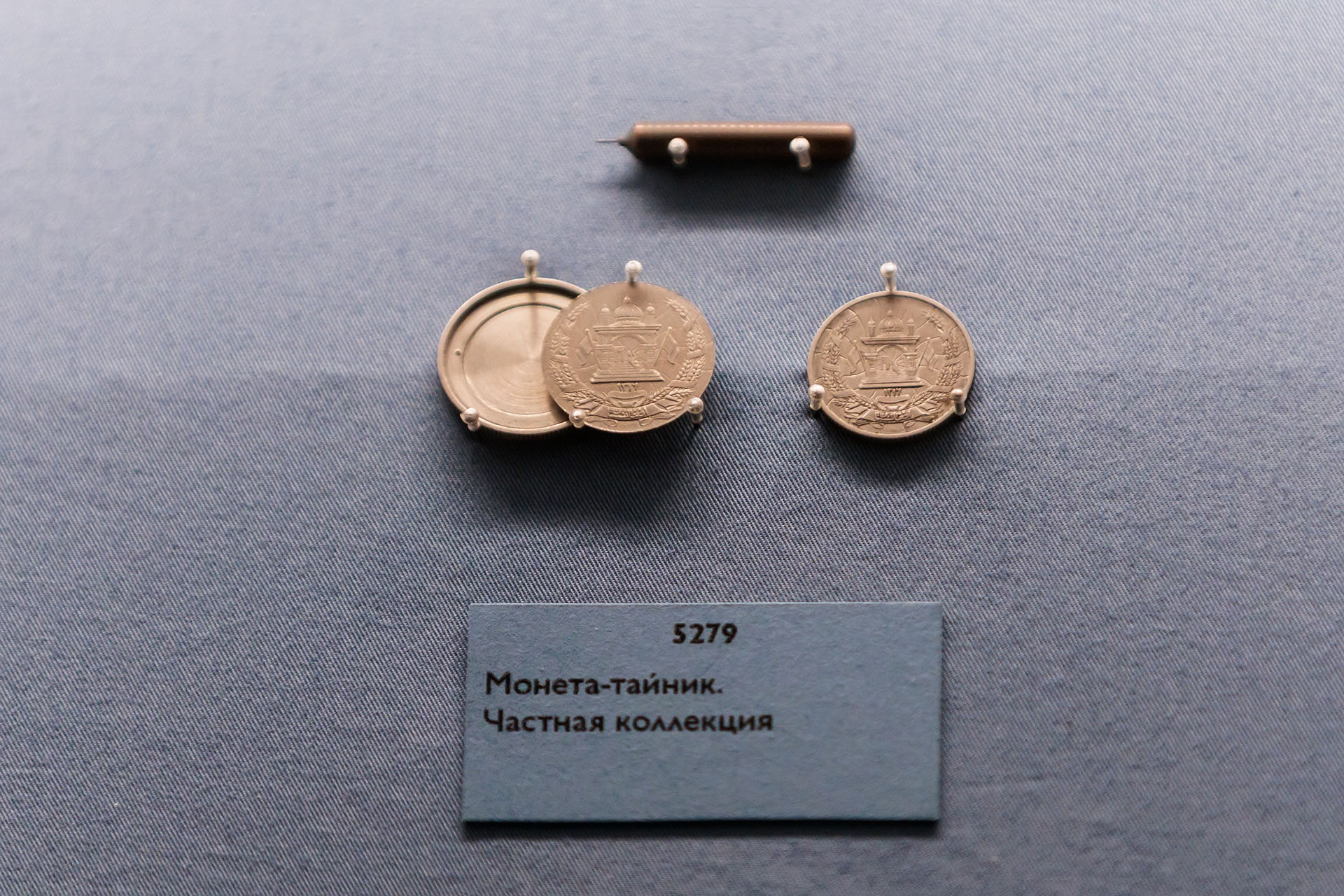 Экспозиция «Тайные знаки и символы на монетах» объединила более трёхсот предметов, среди которых редкие экземпляры: первая в истории монета с надписью, римские ауреусы с достопримечательностями городов империи, монета-нагрудный знак, коллекция талеров, экземпляр с портретом семьи императора Николая I, монеты, посвящённые богам Древнего Рима, а ещё — со счётными точками и даже монеты-обереги. Монета предстаёт на выставке в первую очередь как носитель культурного кода, зашифрованного в символах и знаках — тайных посланиях, которые мастера чеканки оставили потомкам. Здесь можно проследить эволюцию отражения воззрений правителя той или иной эпохи, а также научиться определять подделку и выяснять, кто изготовил монету и кто её хранил. Ещё одной темой стала защита денег — на выставке представлены уникальные технологии современного производства монет.