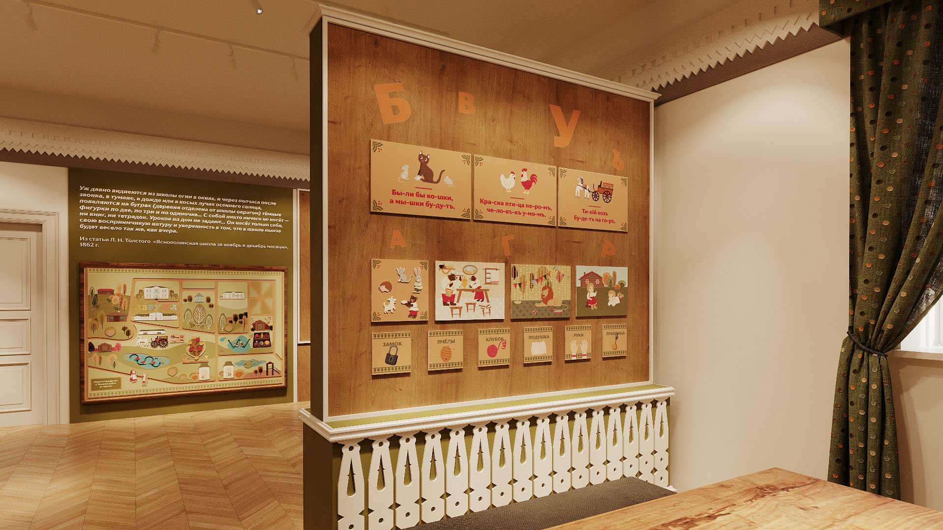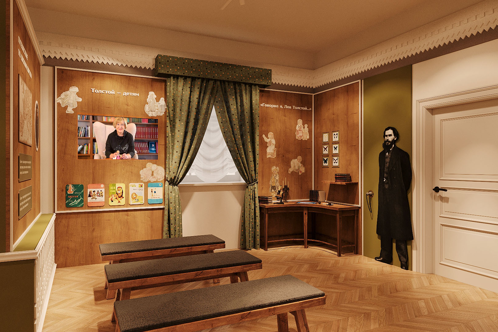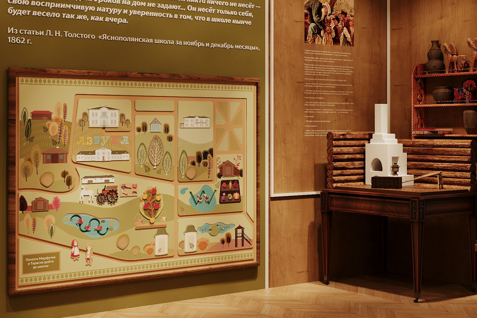Музей-усадьба Л. Н. Толстого «Ясная Поляна» задался целью реализовать новый проект и открыть экспозицию. Исходные данные из архива и идеи музейных специалистов по наполнению нового пространства детского центра были преобразованы в пространственные формы с учётом основных трендов. За основу были взяты визуальные образы, цвета и формы, которые можно встретить на территории усадьбы.