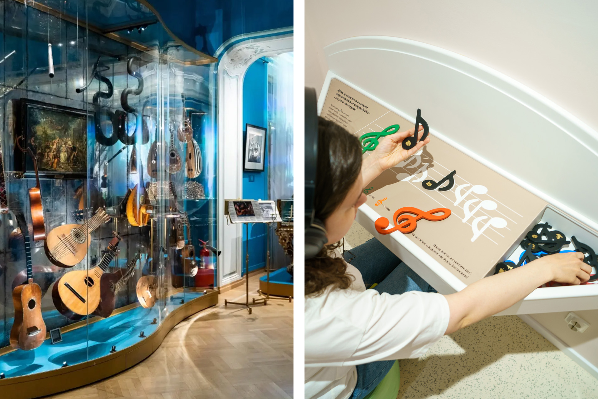 Слева: экспозиция музея музыки в Шереметевском дворце / справа: звуковая инсталляция в экспозиции выставки «Эмоции природы. Природа эмоции» музея-заповедника А. С. Пушкина «Михайловское» Фото: музей музыки в Шереметевском дворце / бюро «Метформа»