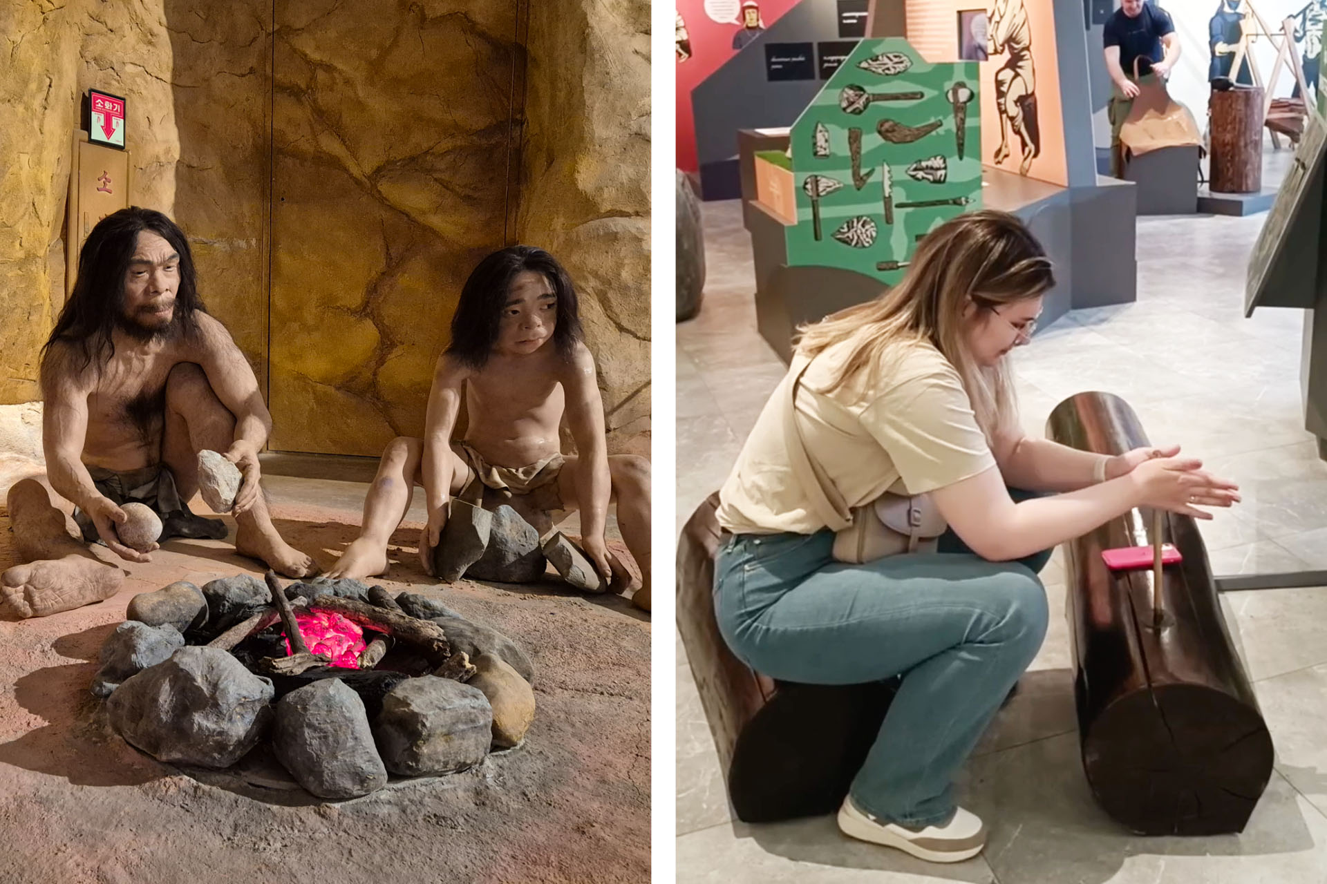 Слева: экспозиция музея предыстории Jeongok в Корее / справа: интерактивный «тренажёр» по добыче огня в экспозиции «10 000 лет до Тульского кремля» Фото: музей предыстории Jeongok / бюро «Метформа»