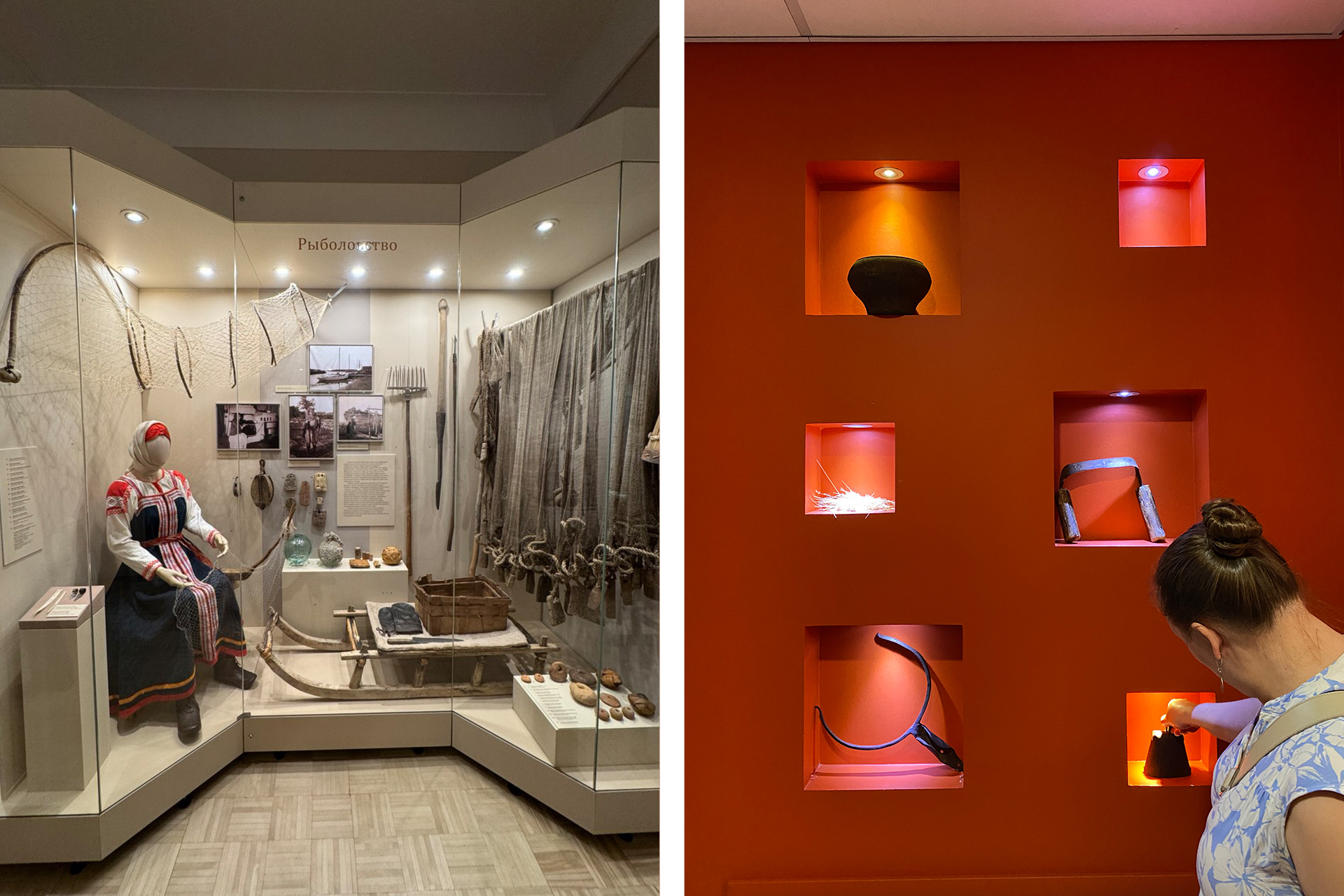Слева: экспозиция Кингисеппского краеведческого музея / справа: витрина для тактильного взаимодействия с предметами этнографии в детском центре «Новая ферма» ГМЗ «Петергоф» Фото: бюро «Метформа»