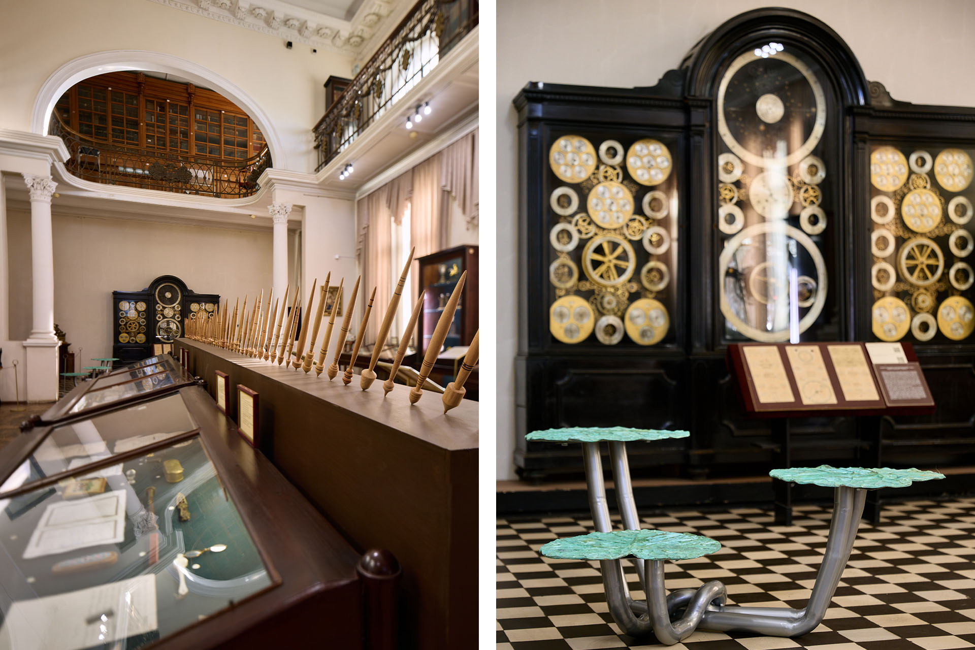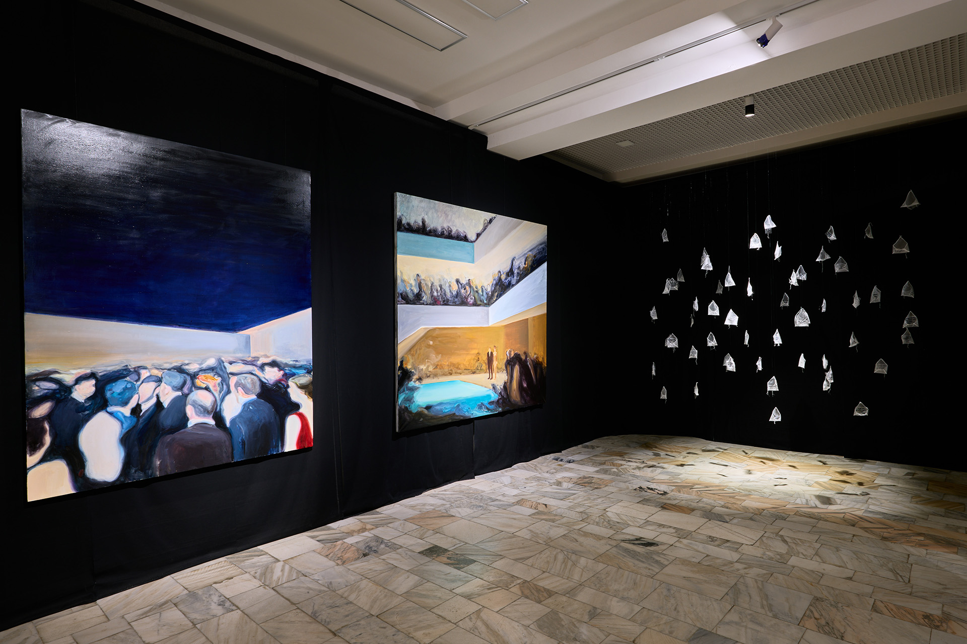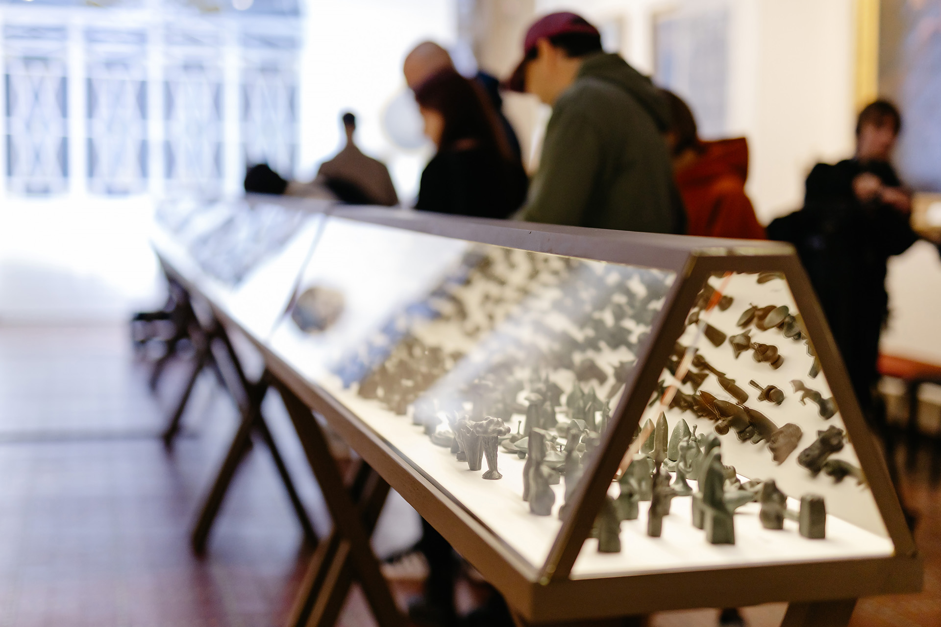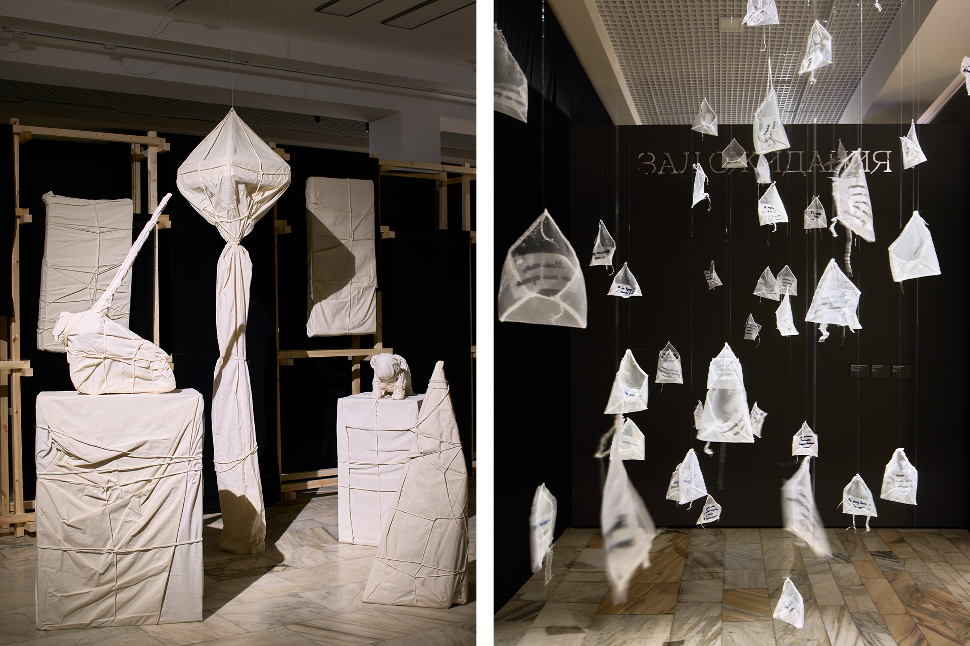 Действительно, расставленные веретёна Владислава Ефимова оказываются внутри европейской коллекции, а восемьсот пластилиновых фигурок Романа Сакина органично появляются в зале «Искусство и время». Серия графических листов Александры Паперно заставляет вспомнить советское прошлое в интерьерах неоклассического особняка, пробуждая не только размышления о прошлом, но и позволяя вообразить антиутопическое будущее.