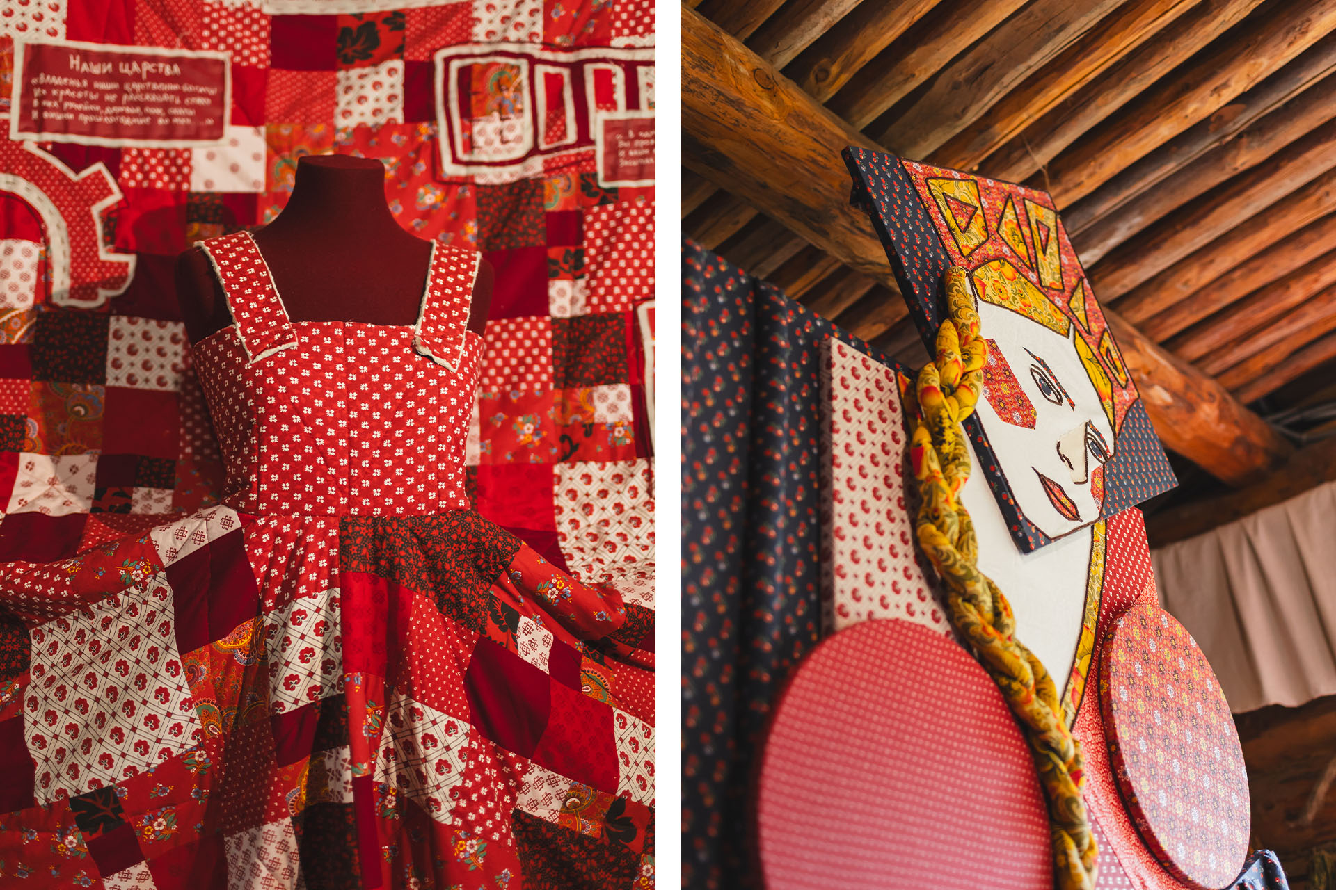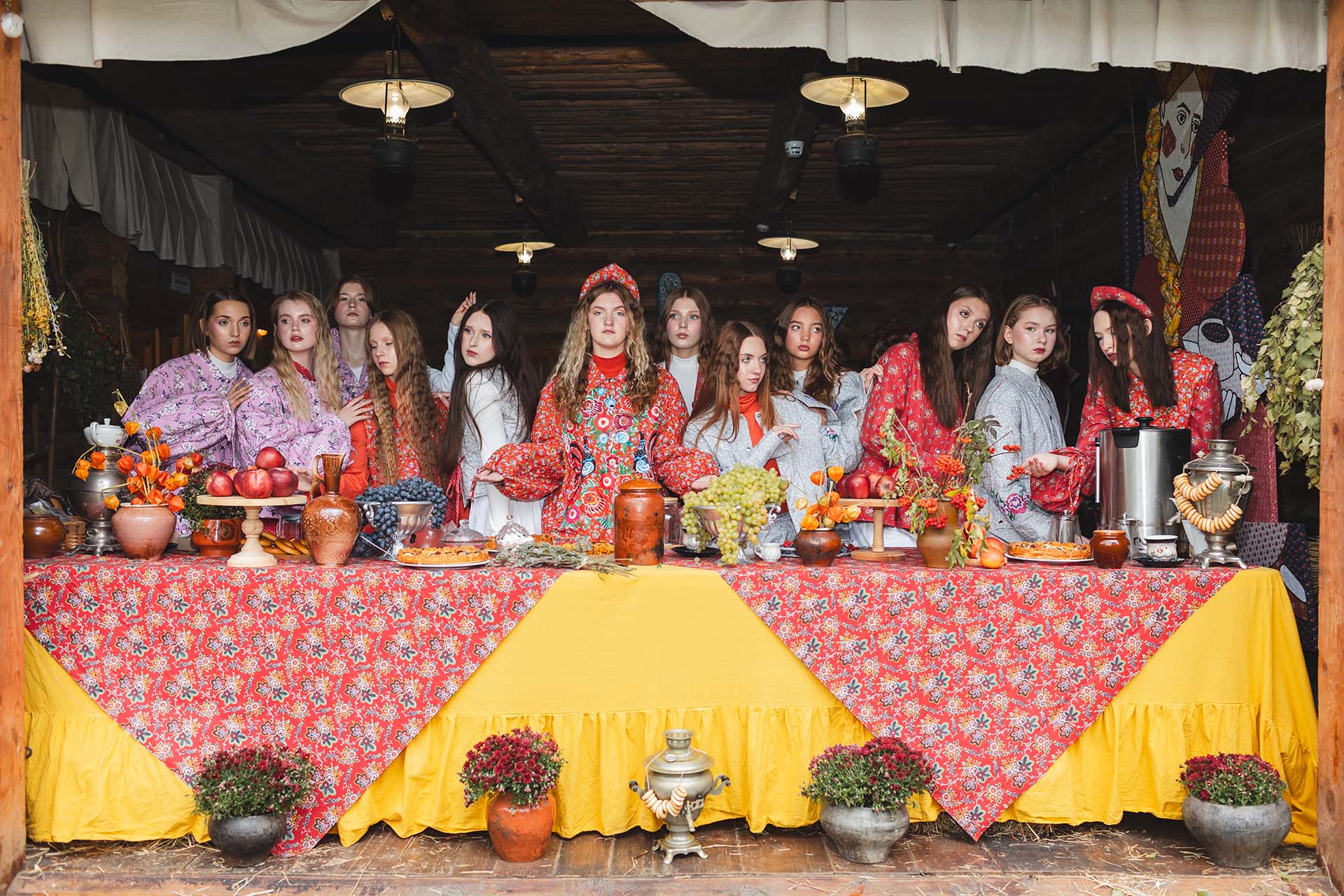 И если для московских студентов это взгляд извне, будь то ткачихи Елизаветы Коротковой или «Аванguard» Пелагии Шатровой, то для студенток ивановского Политеха первые выставочные эксперименты оказались невозможны без опоры на традицию малой родины. Диана Добрикова — одна из немногих, кто сделал работу под названием «Золотая коса» с использованием объёма авангарда, без отсылки к Цветаевой. Оммаж ивановским невестам: её девушка, пригорюнившись, словно сидела во главе стола, накрытого для гостей, и задумчиво смотрела в сад, в котором, помимо выставочных работ, был устроен показ бренда NOVIKOVA DSGN. «Коллекция яркая, жизнеутверждающая, из наших региональных тканей, адаптивная, где ключевой образ — это птица, а ключевые изделия — стёганые куртки, — рассказывает дизайнер, доцент кафедры ДКТ им. Н. Г. Мизоновой ИВГПУ Ксения Демьяненко-Новикова. — Созданная совместно с предприятием “Шуйские ситцы” коллекция хорошо внедрилась в канву открытия, ведь московские и ивановские студенты творили на тему города, размышляли о его истории при помощи арт-объектов и совриска, так что ещё одно моё определение города — как ситцевого края и города дизайнеров — было очень уместно. А пространство Музея семьи Цветаевых, деревянный дом из сруба, намоленное место рядом с храмом, очень органично сплелось с русским стилем».