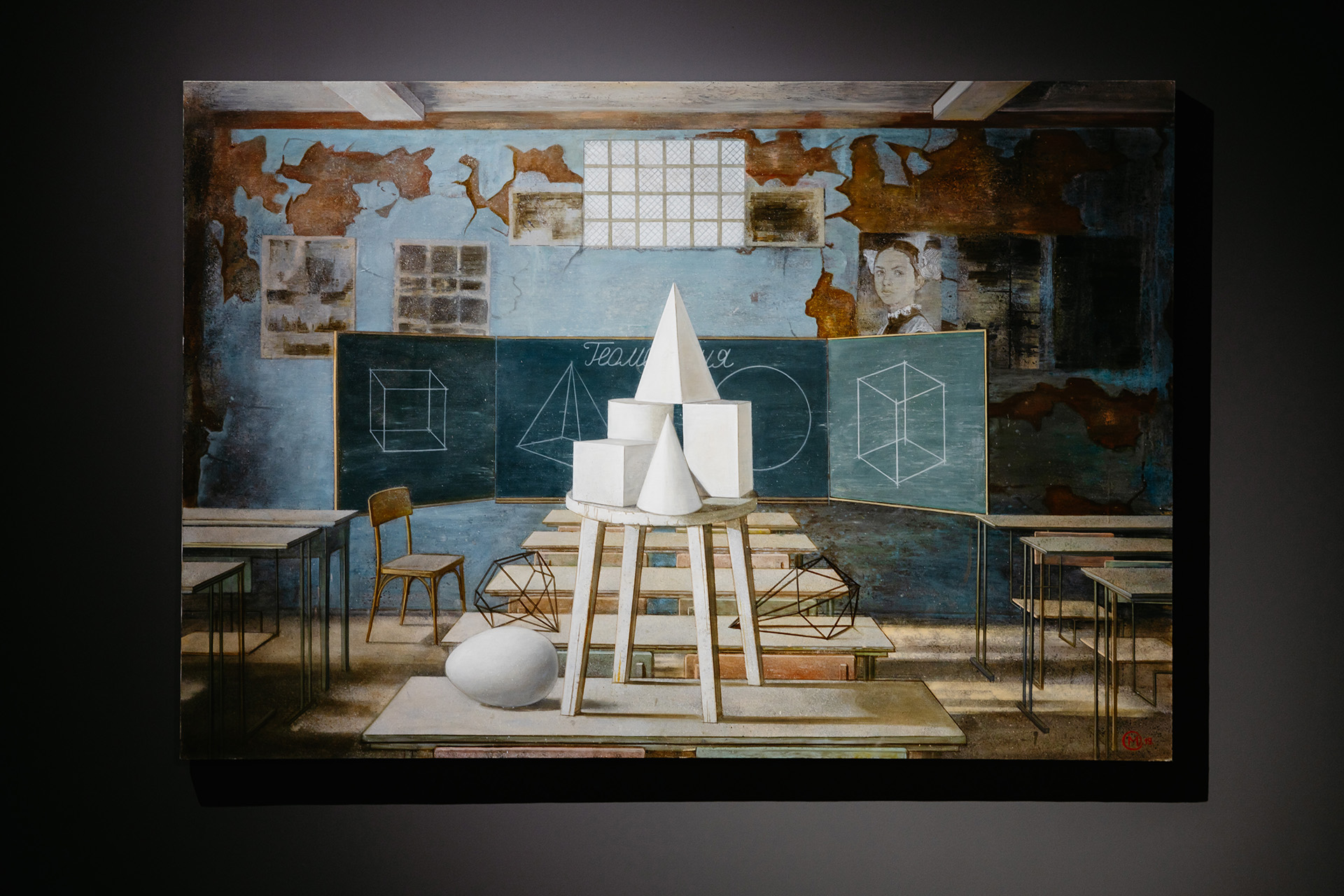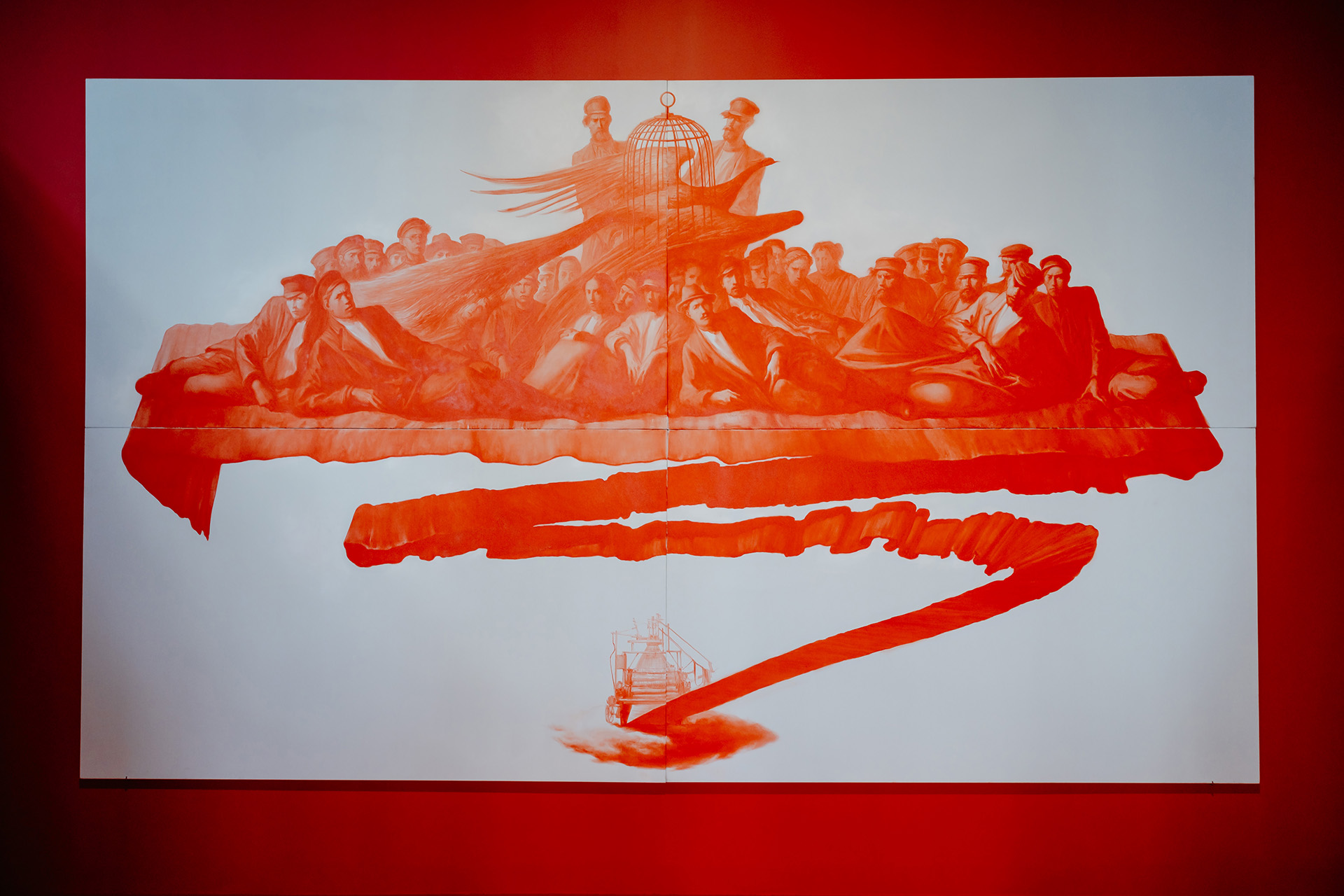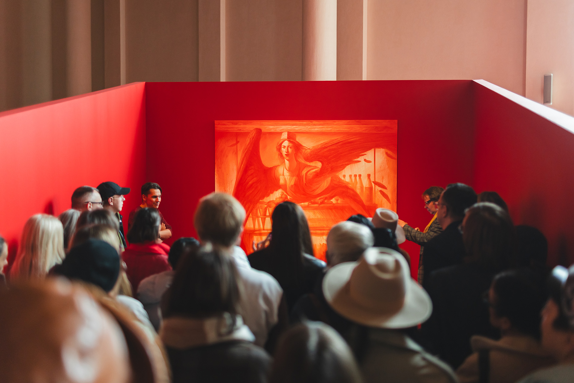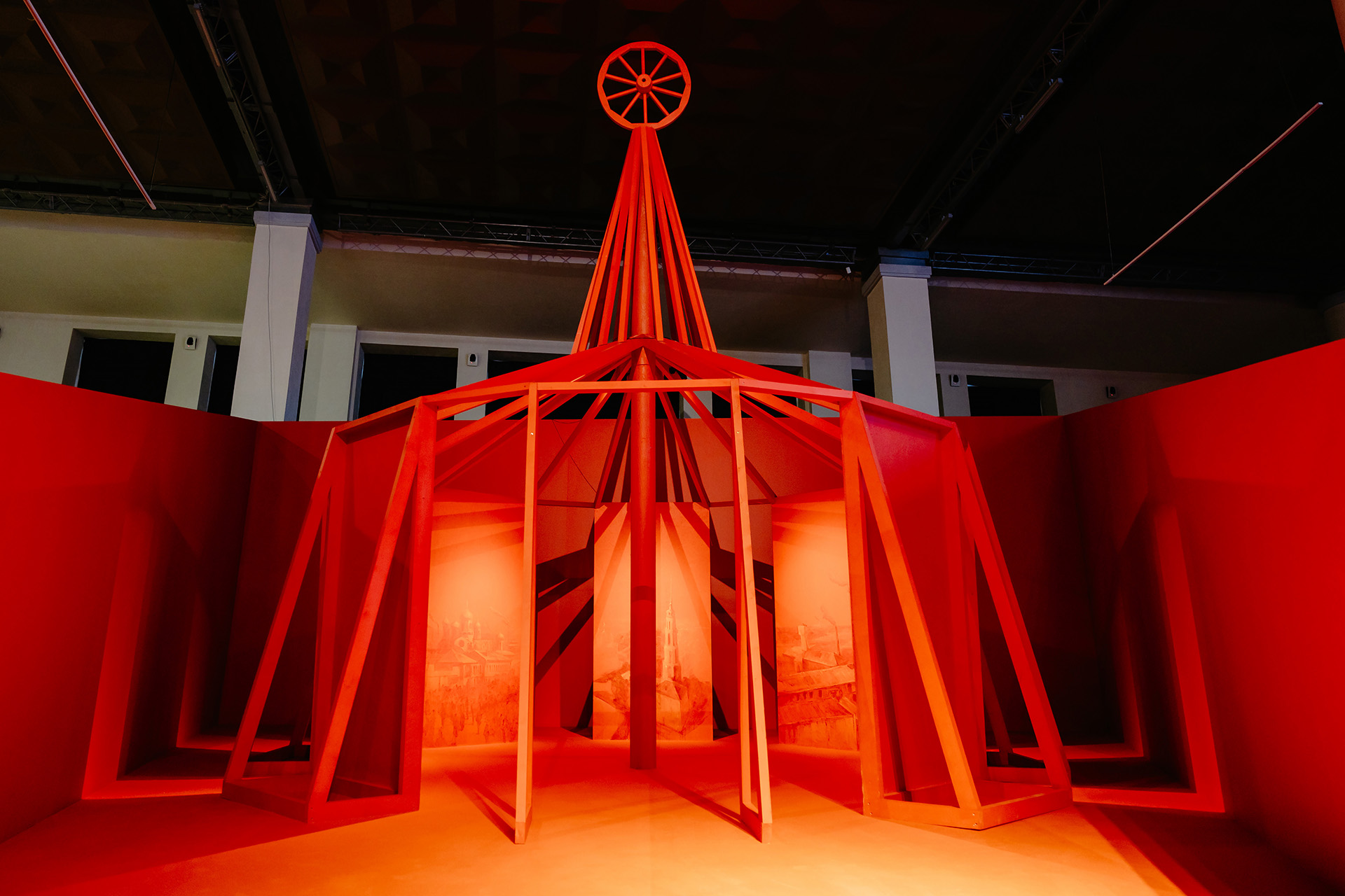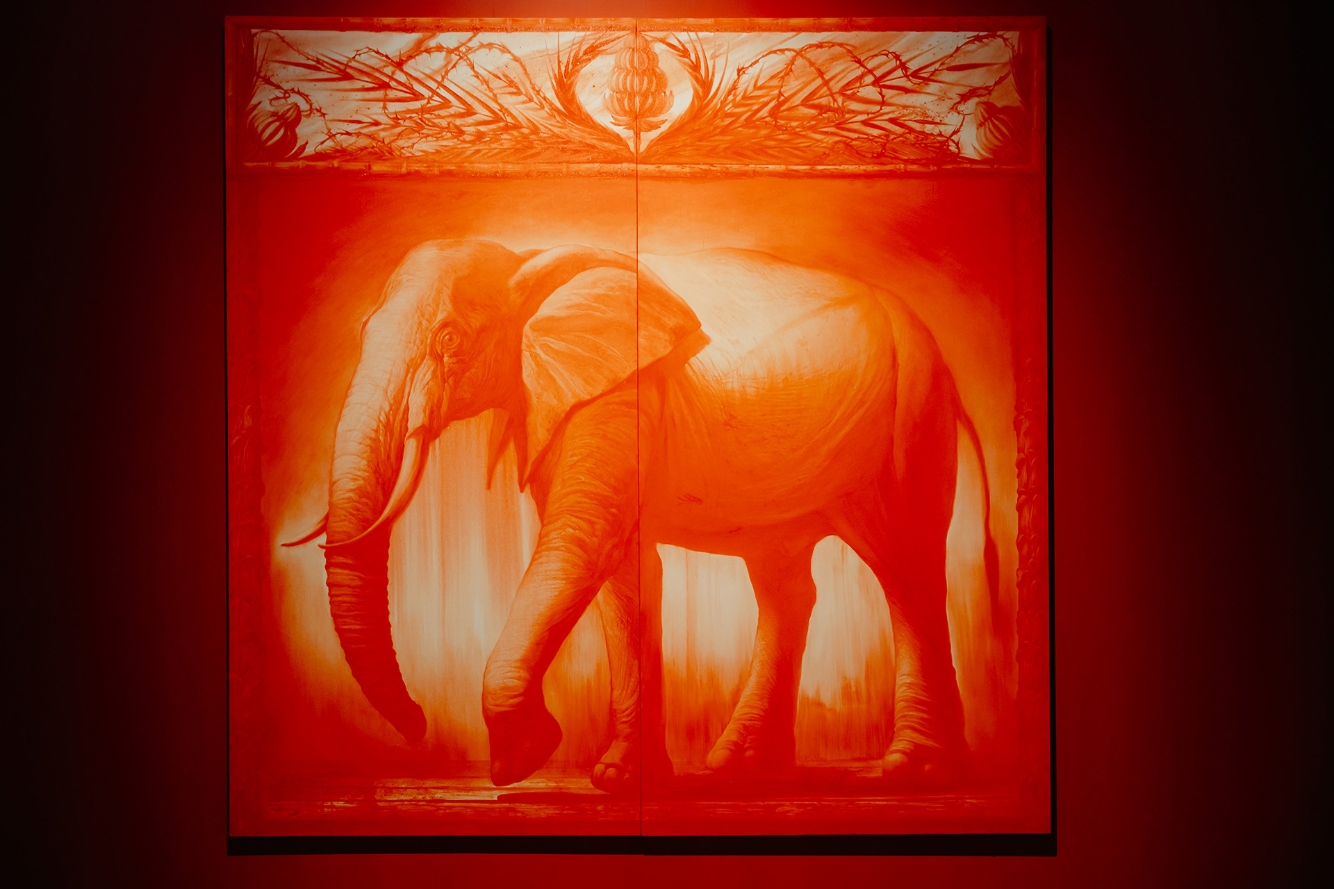 Гипнотизирует и выставка Егора Кошелева (куратор — Кирилл Светляков), встречающая и провожающая гостей в арт-пространстве железнодорожного вокзала. Сам по себе вокзал — примечательный памятник, самый крупный в России, построенный в эстетике конструктивизма, с его открытыми синим и красным залами, гипсовым декором, мозаикой, метлахской плиткой и монументальной росписью на стенах. Вдохновляясь этим пространством, Егор Кошелев создал своё колесо истории, раскрутив его маятник на активно-красном фоне. Архитекторомвыступило MISH studioиз Нижнего Новгорода. Обрамив работы Егора в интенсивно красный цвет, Михаил Маслов сделал их ещё более авангардными. Огромные полотнастоит увидеть как минимумдважды — в дневном и вечернем свете. Впрочем, слон, мерцающая восточная диковинка, лучше всего смотрится именно вечером.