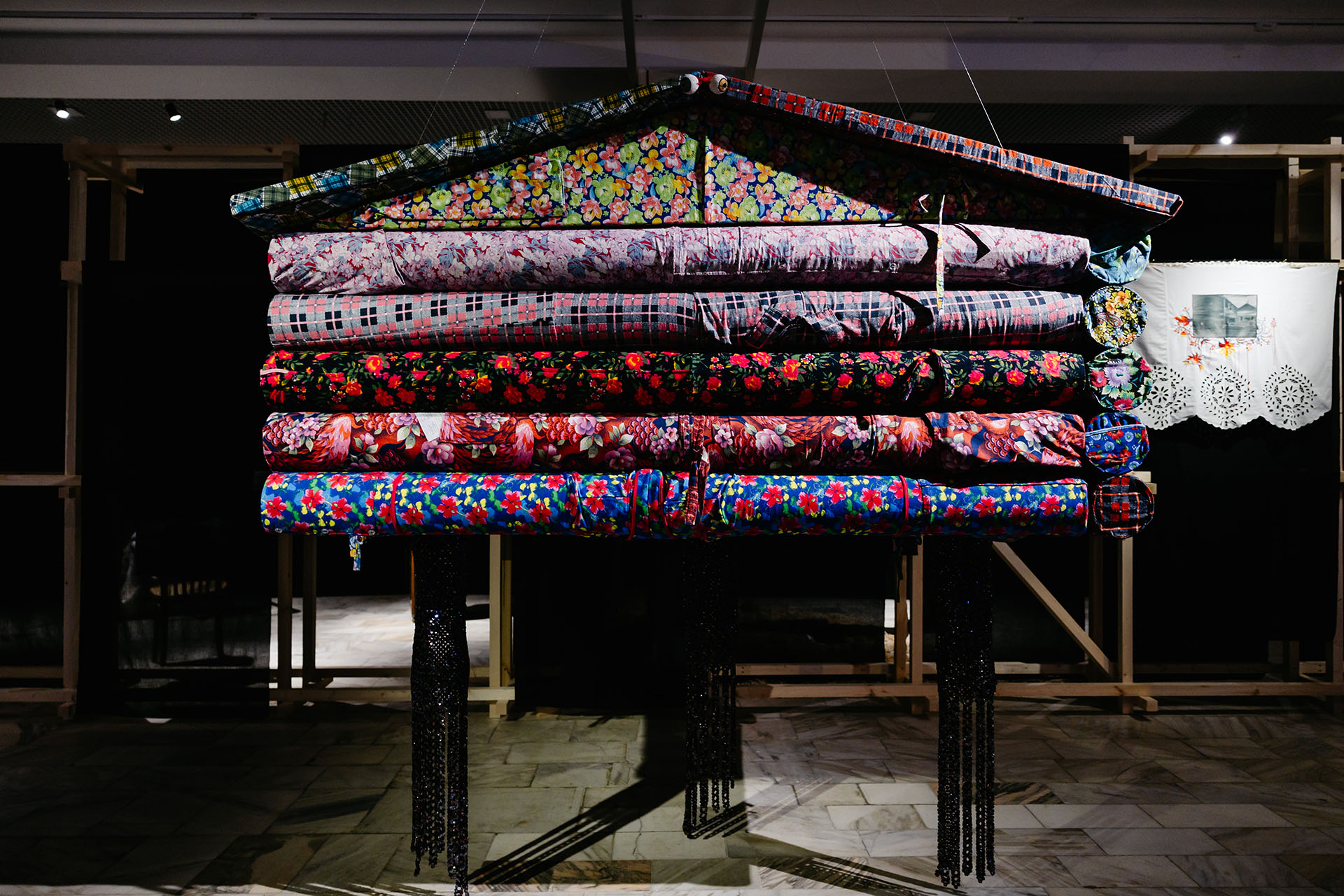 Моровая изба Радмилы Мигулиной сшита из больничных халатов. Размышляя о психиатрической больнице, пограничном состоянии бытия, Радмила сшила её из разноцветных халатов, в которые облачаются обезличенные пациенты. Уже во время создания работы художница увидела, что все они произведены на местных фабриках. Если для Радмилы совпадение места стало скорее случайностью, то для московского художника Юрия Чернышёва — осознанным выбором. Он приехал в Иваново на неделю, снял квартиру на окраине, купил на «Авито» старый велосипед, установил камеру на колесо и объехал весь город. Эта 50-минутная видеозапись, закольцованная на телевизоре из 1980-х, стала основой для инсталляции, в которой нашлось место и тому самому велосипеду, и вязаным кукольным платьям, купленным на развале у женщины трудной судьбы, и портретам ивановцев, сгенерированным нейросетью.