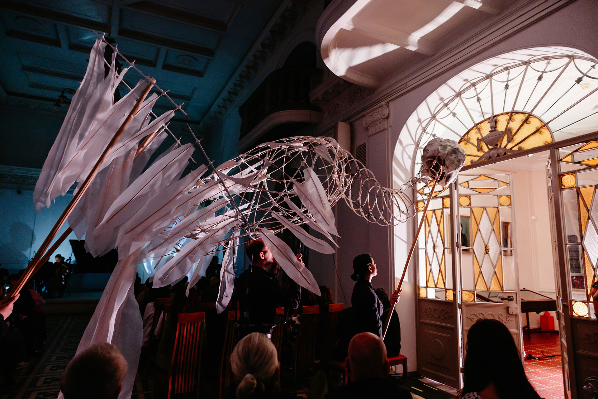 Закрепил эффект аудиовизуальный перформанс «Сирин выходит из комнаты» в исполнении петербургского «МолОт-ансамбля». Сирин, управляемый четырьмя кукловодами, действительно вышел из комнаты и отправился бродить по вечерним улицам, гипнотизируя горожан взглядом, обращённым в вечность.