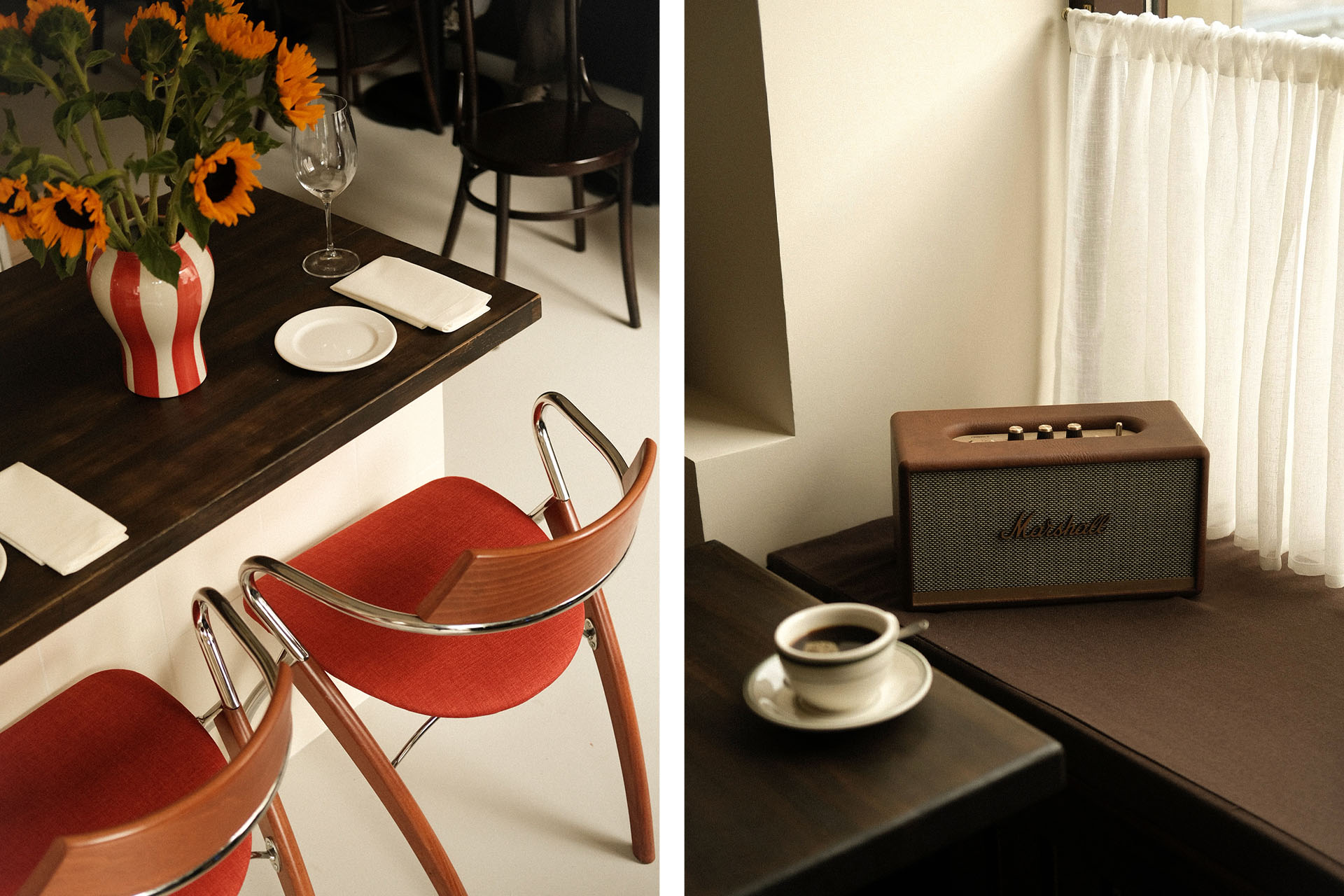 Придумала MAY семейная пара: Настя Ленгер отвечает за атмосферу и философию, а Миша Ленгер за содержимое бокалов гостей — он собрал на полках внушительный ассортимент разных бутылок, от малых европейских хозяйств до универсальной классики. В барной карте также несколько классических коктейлей вроде «Мимозы», «Апероля», «Джин-тоника», а ещё mini Negroni для идеального аперитива перед ужином.